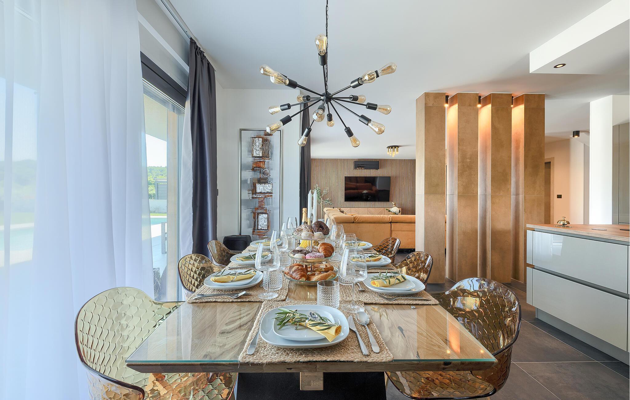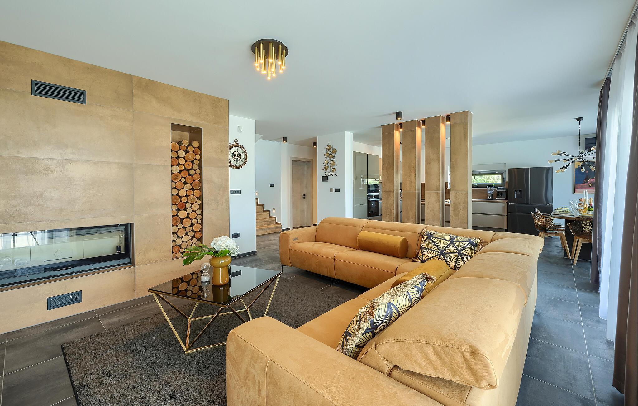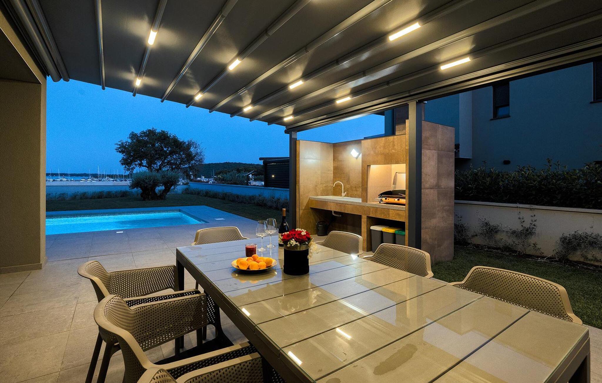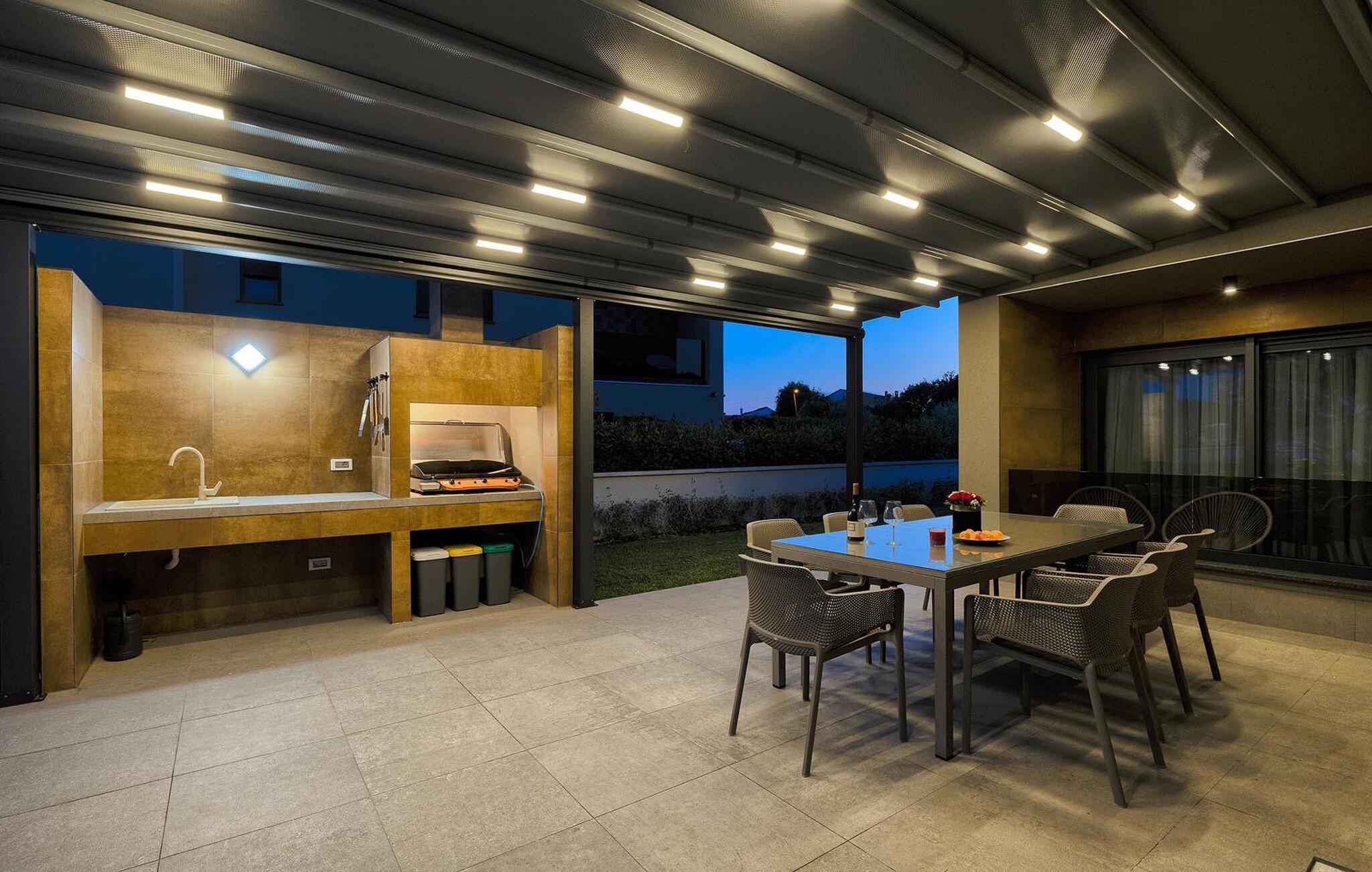 Brug det stilfulde udendørsområde til hyggelige timer i skyggen af den overdækkede lounge. Tilbered en lækker grillmiddag i det moderne udekøkken og nyd jeres måltider udendørs, mens skumringen bader omgivelserne i varme farver. Inde i villaen finder I en rummelig opholdsstue, der har en skøn elegant indretning og moderne design. Slå jer ned i den store, komfortable sofa og sæt en god film på eller slap af med et glas vin. Det åbne, fuldt udstyrede køkken giver jer alt, hvad I skal bruge for at tilberede kulinariske delikatesser med familien.