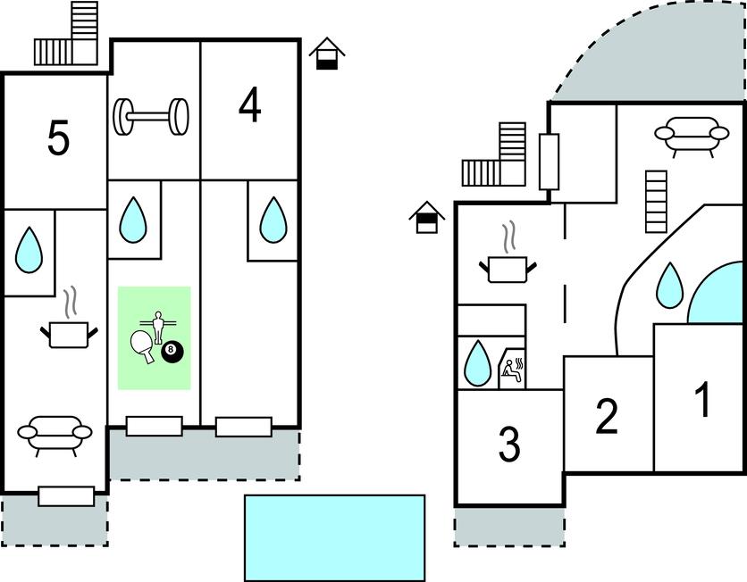 Feriehuset imponerer med sin rummelighed og praktiske grundplan. Gulvene er forbundet med udvendige trapper. På første sal er der et fitnessrum og et spillerum med billard. Det er garanteret ikke kedeligt her. Feriehuset er udstyret med i alt fire soveværelser og fem badeværelser og muliggør et afslappet og afslappet ophold.