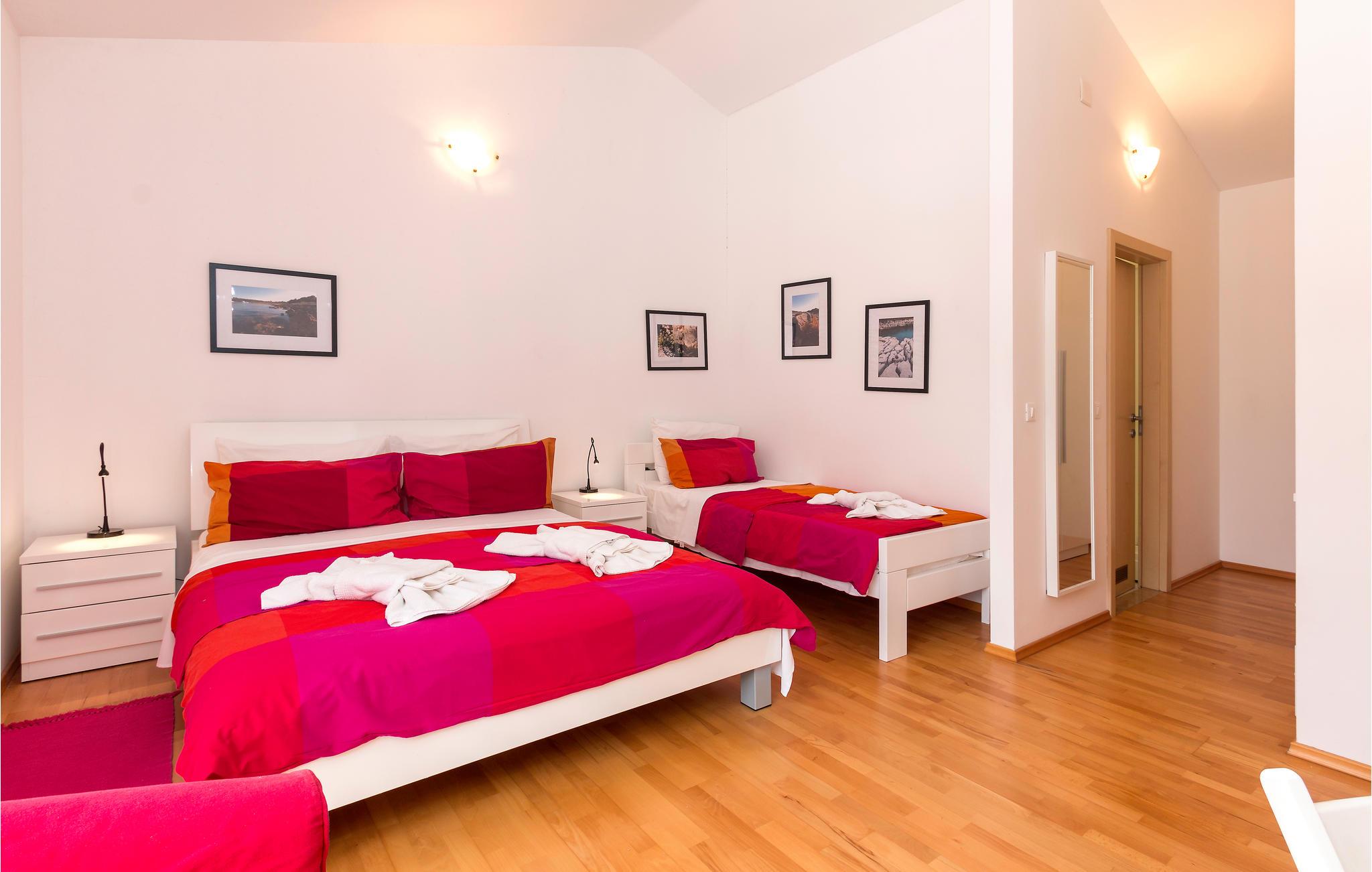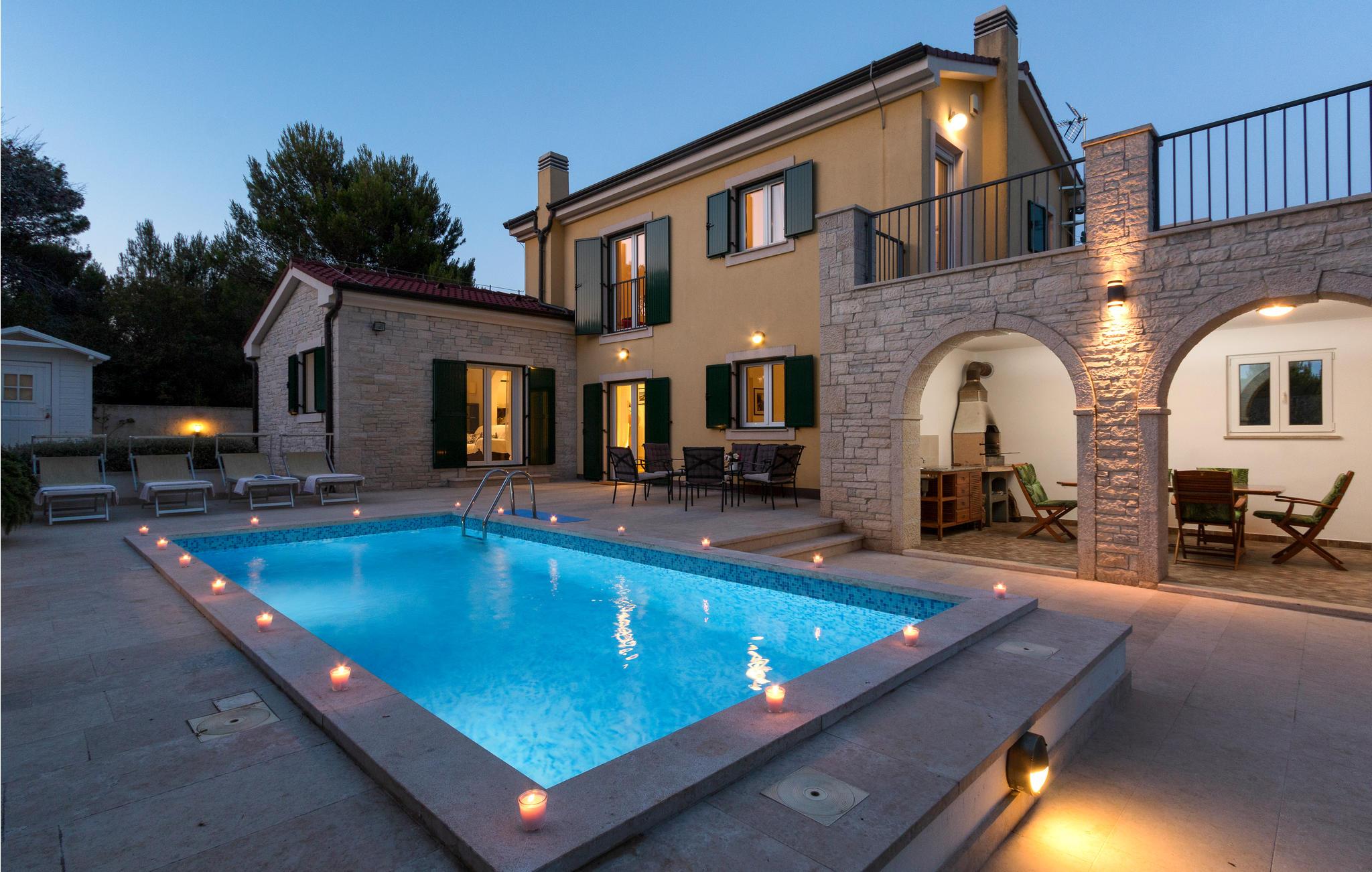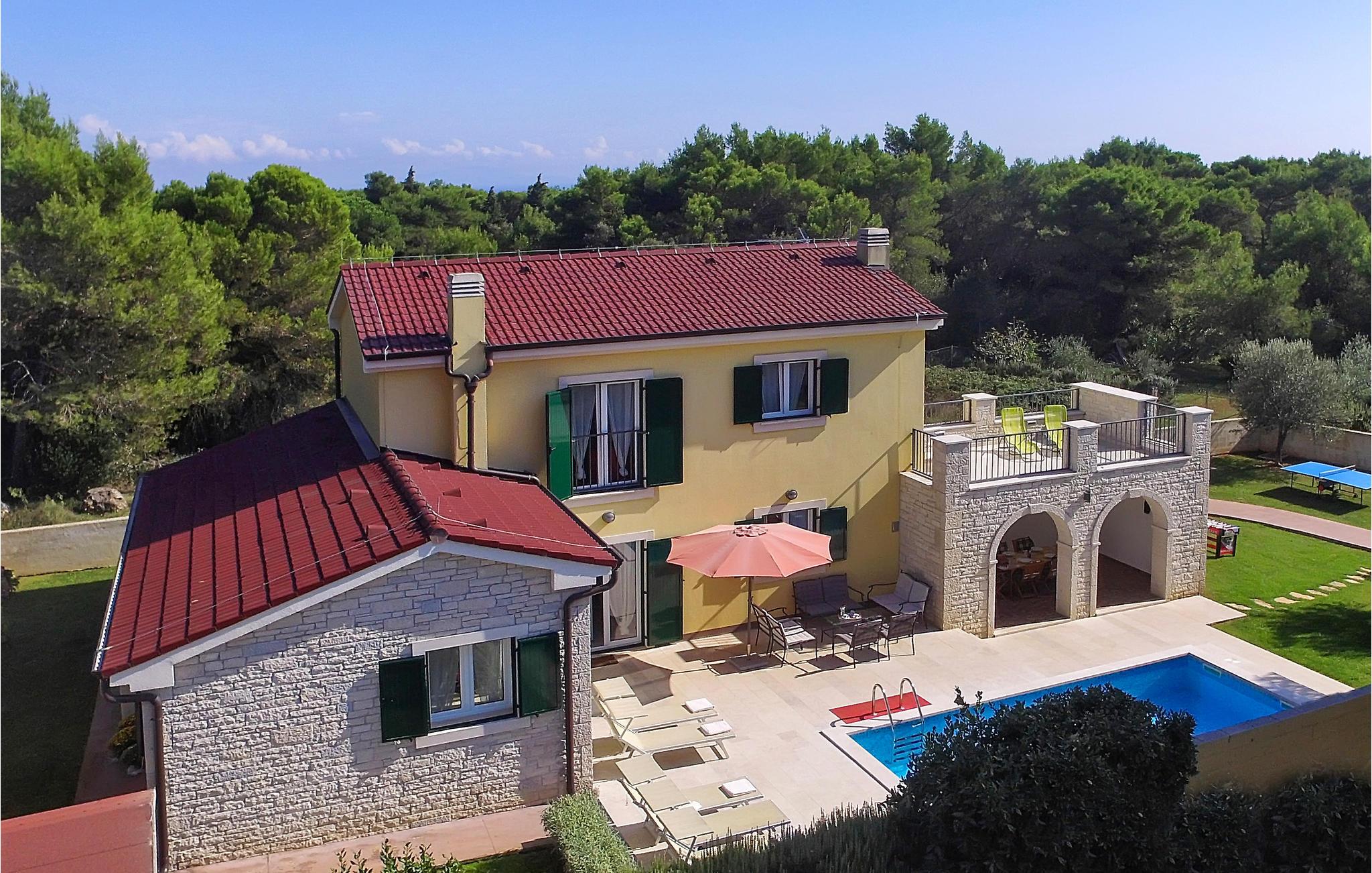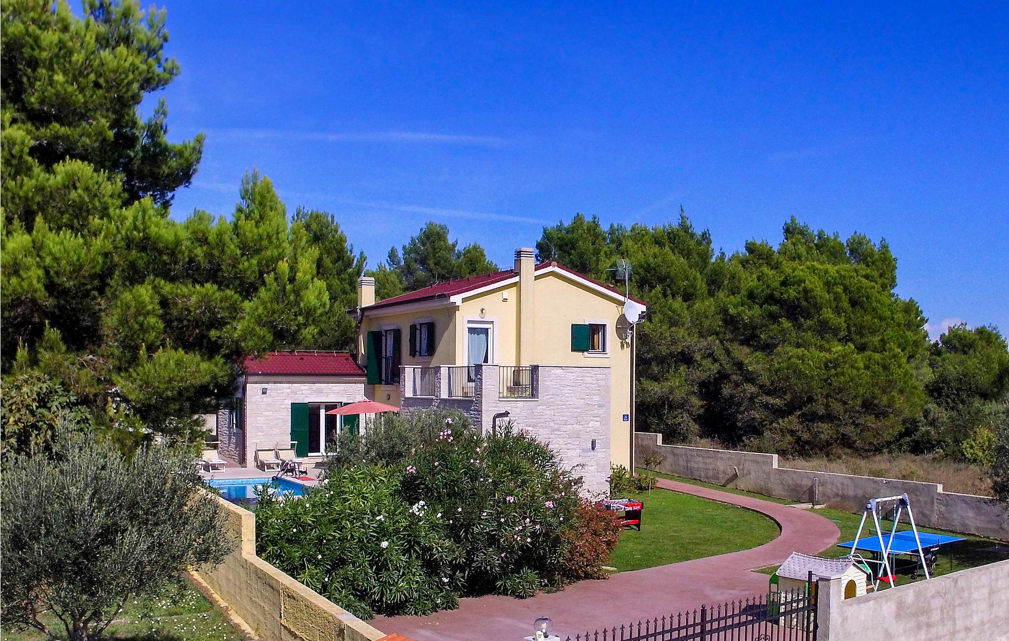 Dette moderne feriehus ligger i centrum af Medulin. Her er en høj grad af privatsfære pga murene der omgiver grunden. For at gøre ferien ekstra vellykket er der en Konoba med hyggelige havemøbler, hvor I kan sidde og slappe af i hyggeligt samvær, mens maden bliver færdig på grillen og udsender liflige dufte. Huset er hyggeligt indrettet og giver den helt rigtige komfort til ferie. I stueplan er der en sauna med to bænke hvor to kan ligge eller fire sidde, et værelse til afslapning og et tilhørende badeværelse. I husets stueplan ligger også en stue, en spisestue, et komplet udstyret køkken med bryggers og et soveværelse. På første sal er der to soveværelser med hvert sit badeværelse og en fælles store terrasse. Som prikken over i’et er der en swimmingpool, en legeplads og et hobbyrum. Vi tør godt love at jeres ferie i dette feriehus bliver helt speciel dejlig.