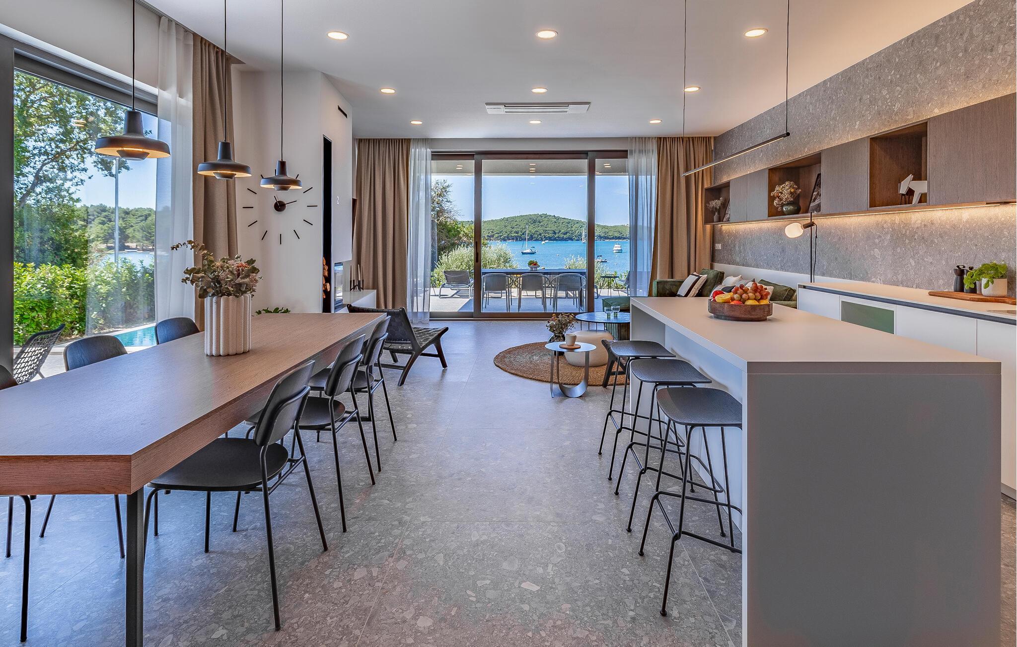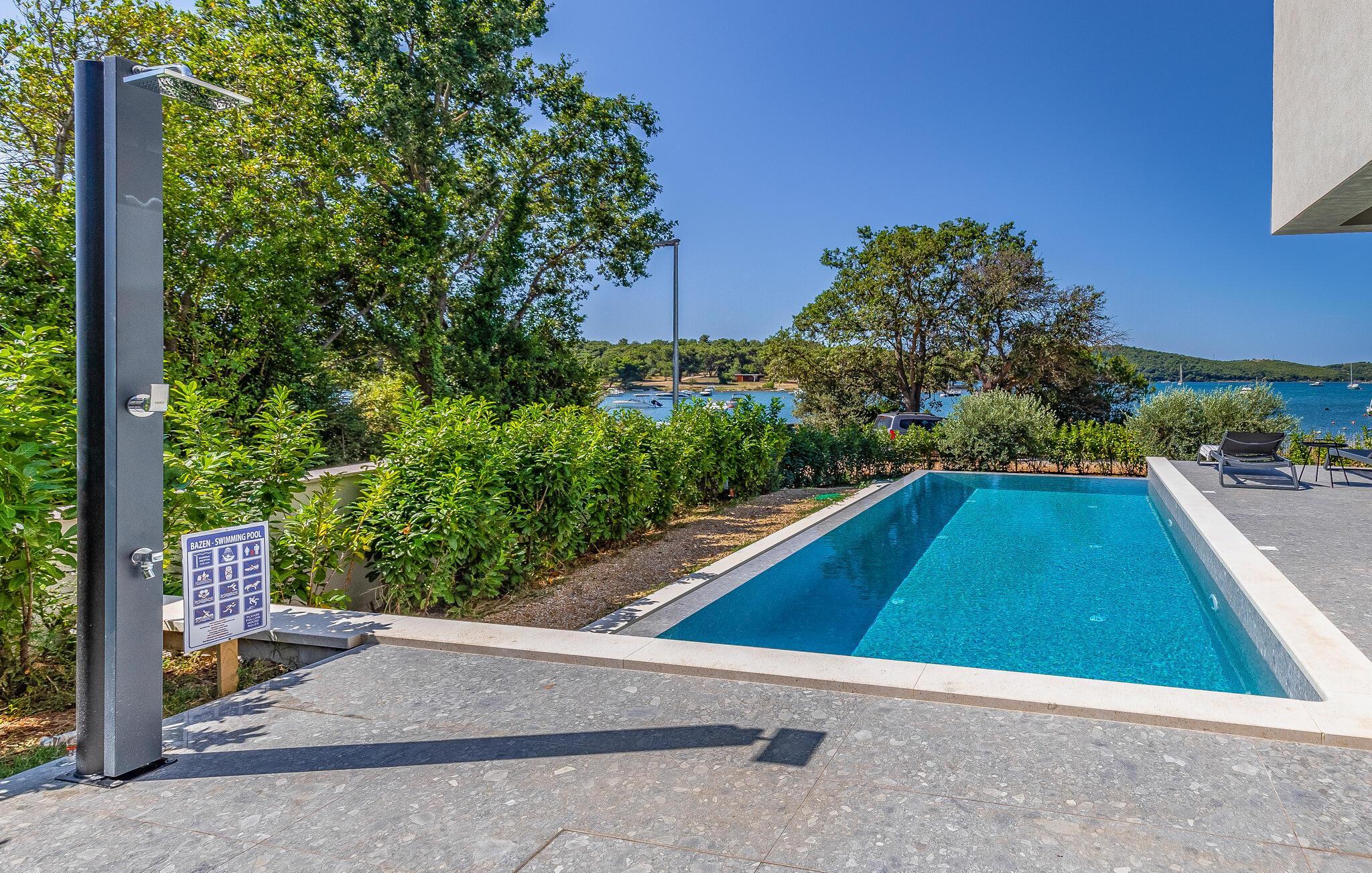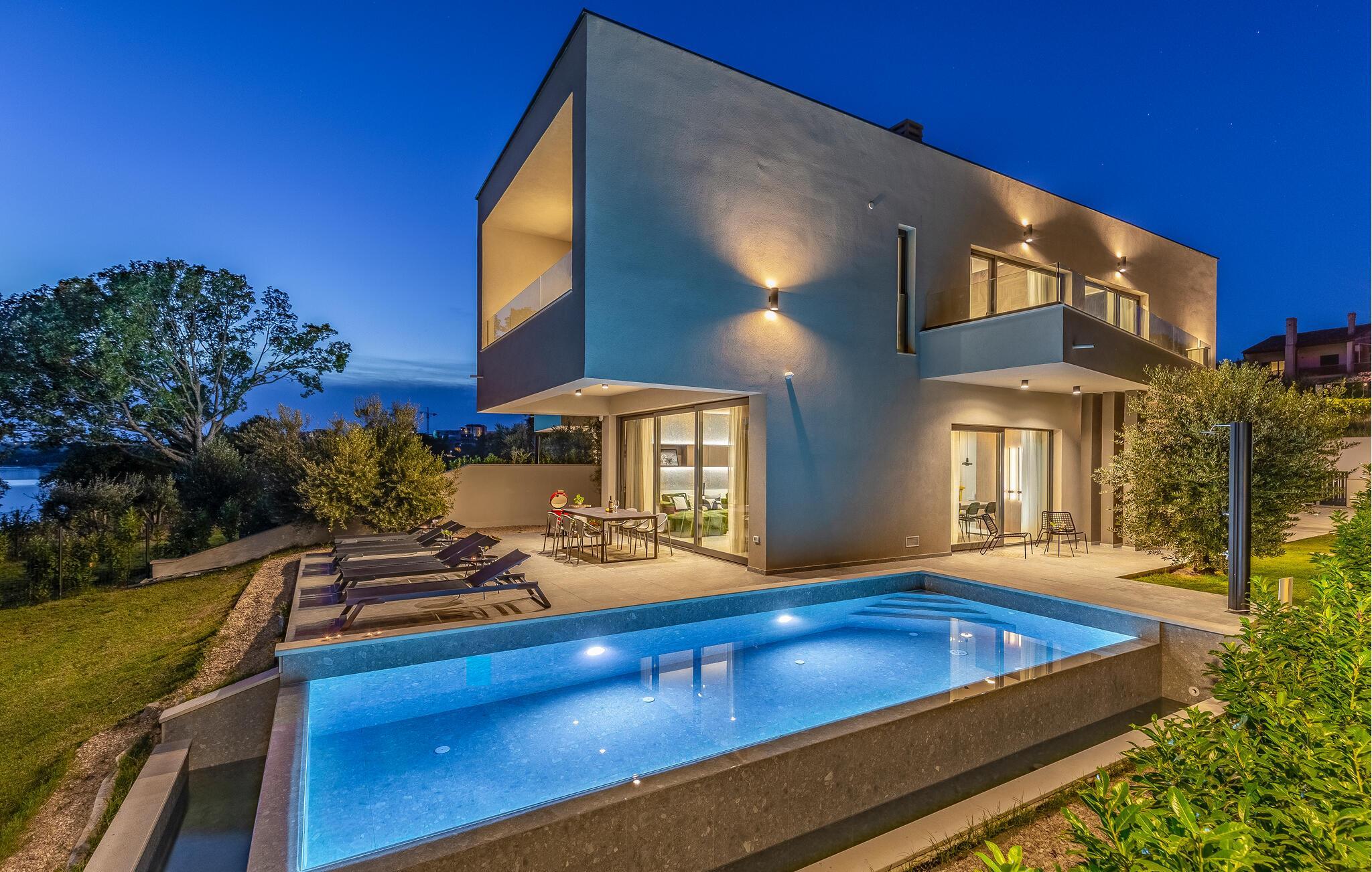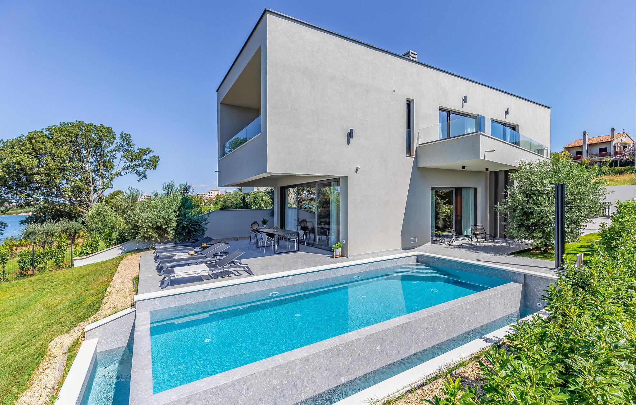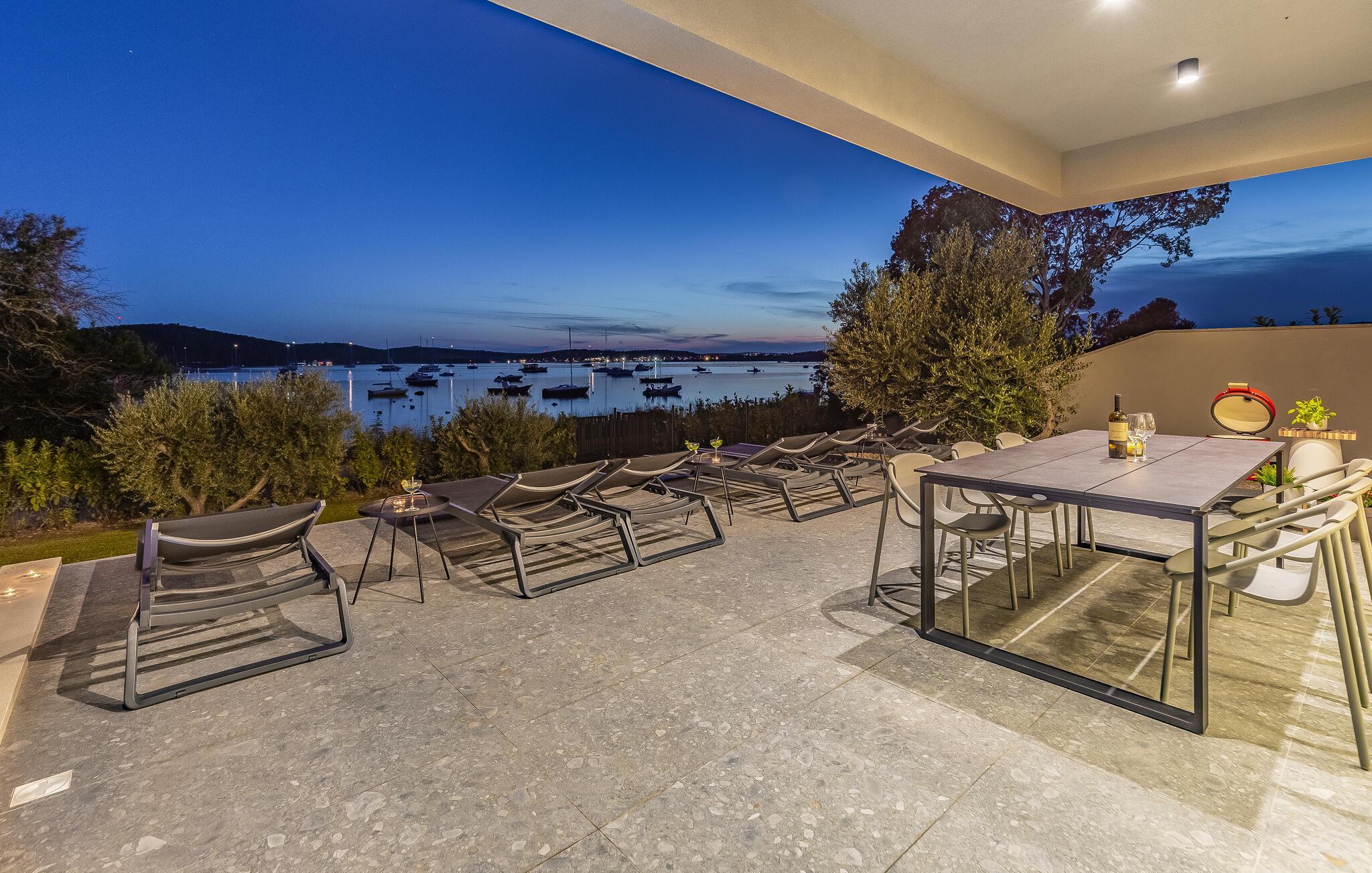 Tilbring en uforglemmelig ferie i dette feriehus nær havet med en fantastisk udsigt over vandet og poolen. De stilfulde møbler, komfortable sofaer, smuk belysning og et veludstyret køkken skaber en behagelig atmosfære, hvor I hurtigt kan slappe af og lade op. Nyd havudsigten gennem gulv-til-loft-vinduerne med et glas vin, lyt til jeres yndlingsmusik, eller lav lækre måltider sammen. Start dagen på terrassen med en kop aromatisk kaffe. Vælg et solrigt sted, og lad den blide havbrise omslutte jer. Forfrisk jer i poolen når som helst, og slap derefter af med en kølig drink. Om aftenen er frisk fisk eller en saftig bøf på grillen den perfekte afslutning på dagen – altid med udsigt til solnedgangen, selvfølgelig. Gå en tur til havet, og nyd afslappende timer på de smukke strande i Medulin. Besøg den historiske by Pula med dens imponerende romerske amfiteater. Oplev den charmerende kystlinje på en bådtur til øerne ud for kysten, og prøv lækre istriske specialiteter i de omkringliggende restauranter.