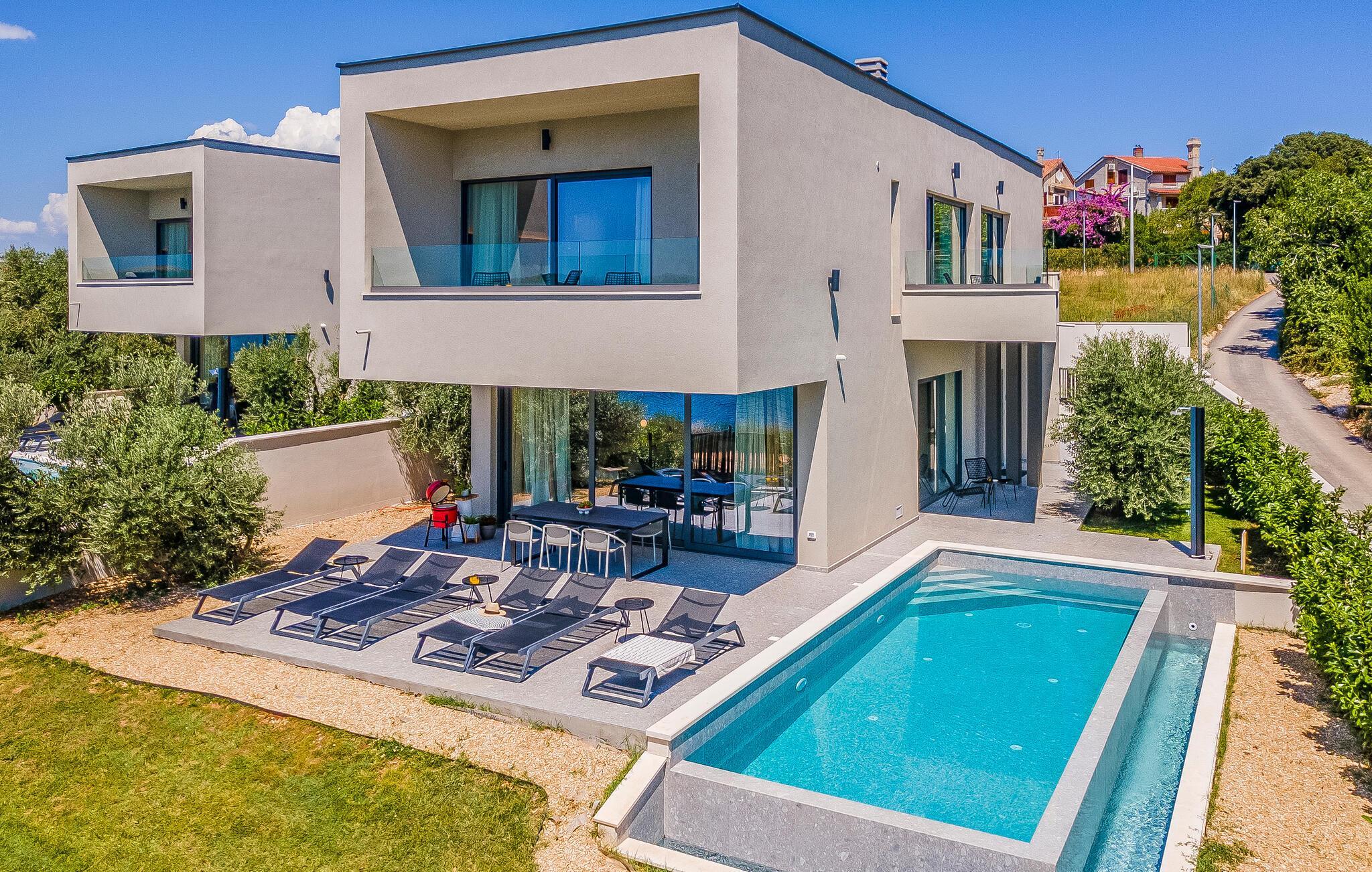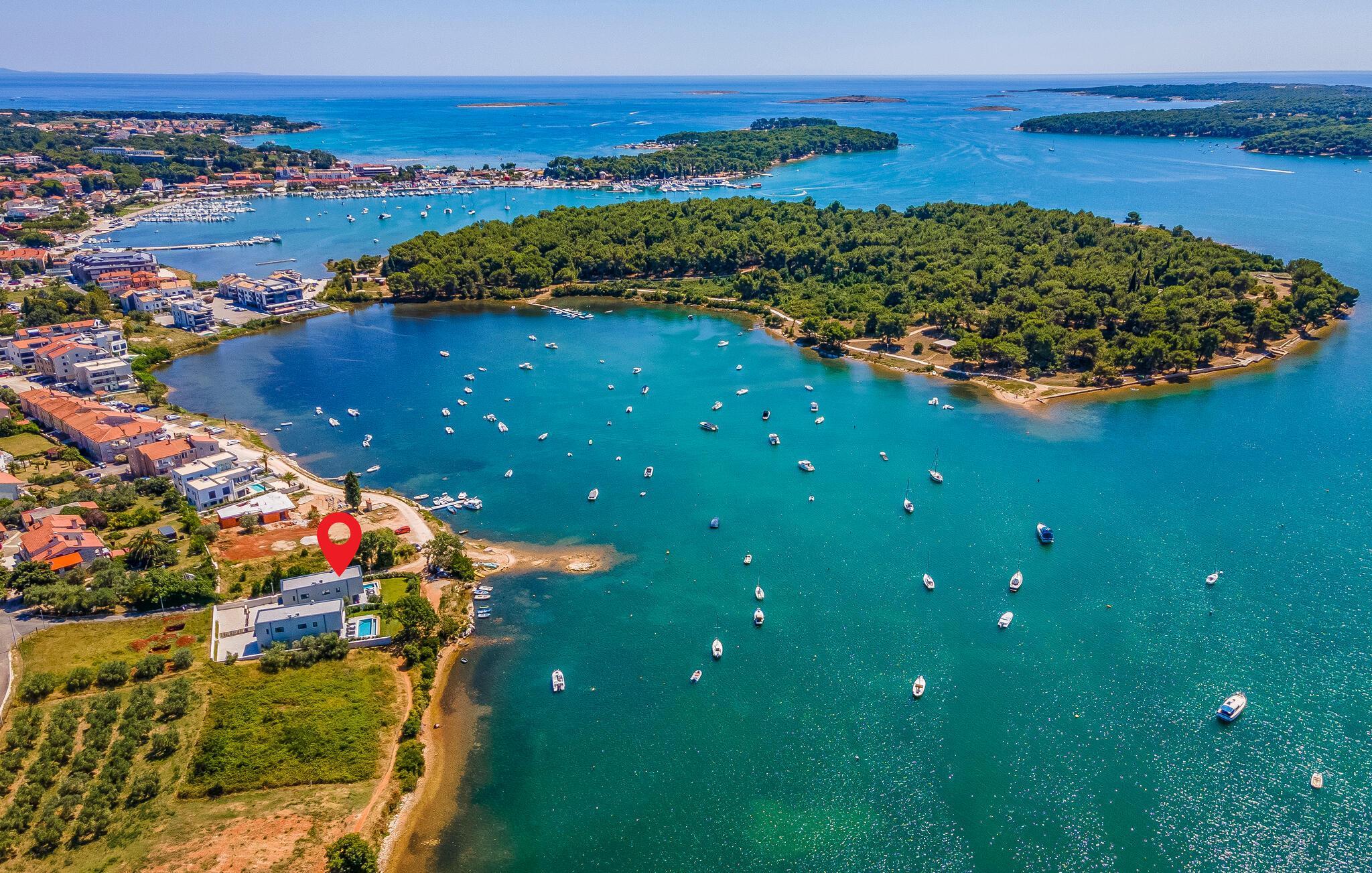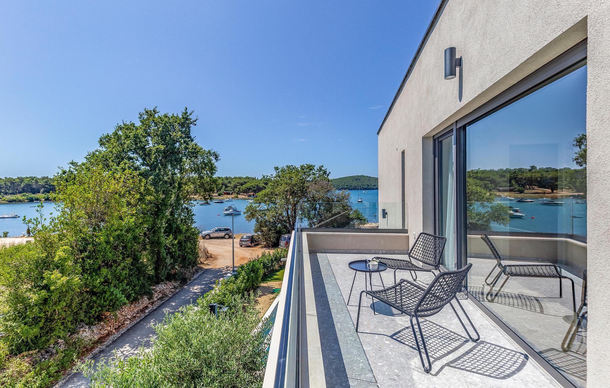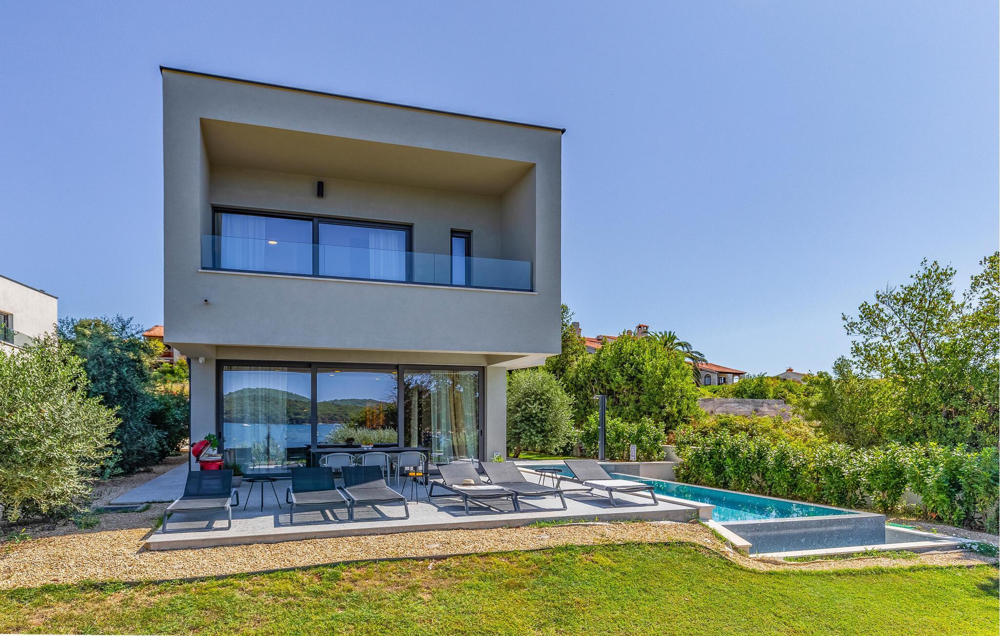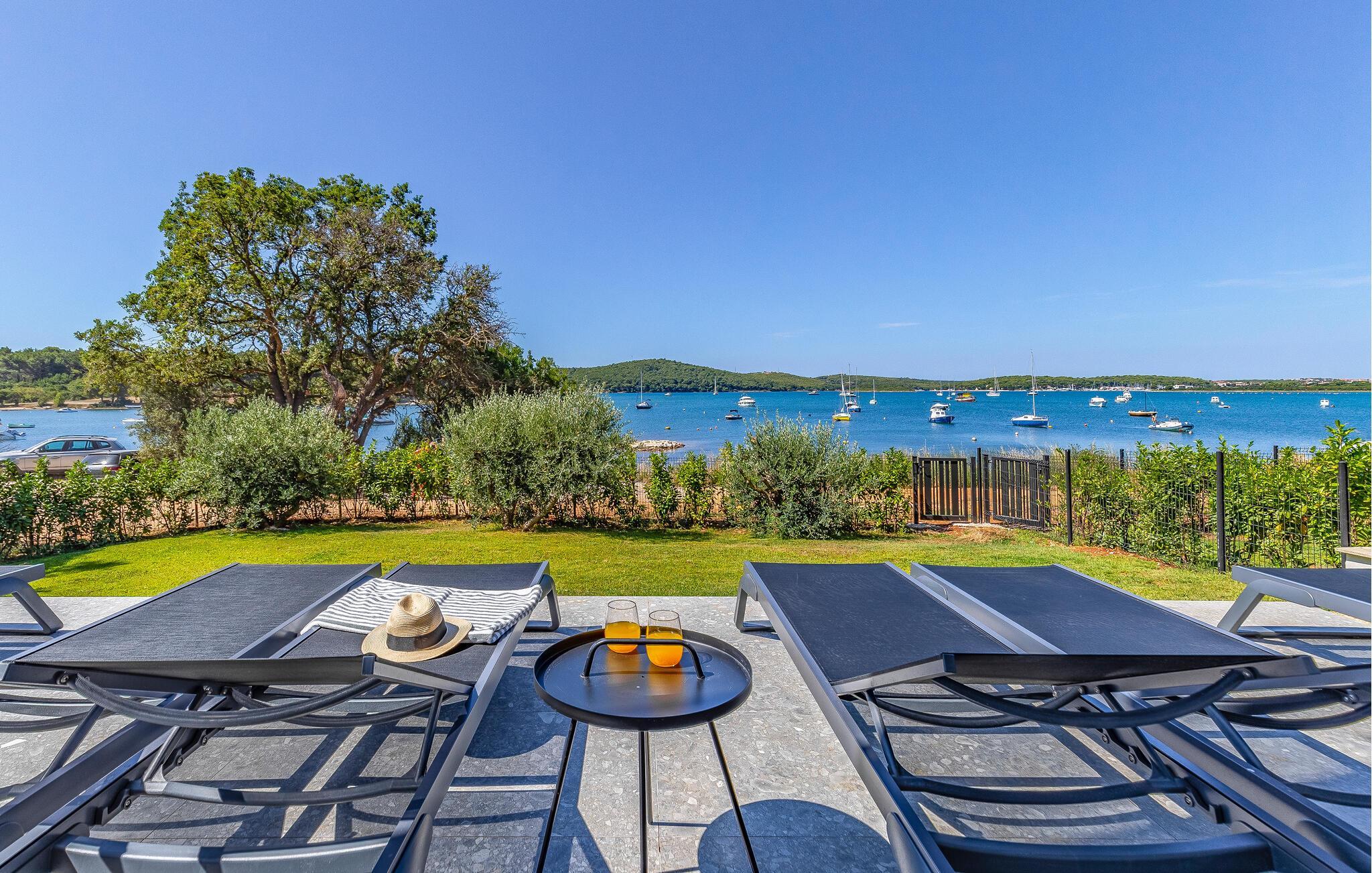 Tilbring en uforglemmelig ferie i dette feriehus nær havet med en fantastisk udsigt over vandet og poolen. De stilfulde møbler, komfortable sofaer, smuk belysning og et veludstyret køkken skaber en behagelig atmosfære, hvor I hurtigt kan slappe af og lade op. Nyd havudsigten gennem gulv-til-loft-vinduerne med et glas vin, lyt til jeres yndlingsmusik, eller lav lækre måltider sammen. Start dagen på terrassen med en kop aromatisk kaffe. Vælg et solrigt sted, og lad den blide havbrise omslutte jer. Forfrisk jer i poolen når som helst, og slap derefter af med en kølig drink. Om aftenen er frisk fisk eller en saftig bøf på grillen den perfekte afslutning på dagen – altid med udsigt til solnedgangen, selvfølgelig. Gå en tur til havet, og nyd afslappende timer på de smukke strande i Medulin. Besøg den historiske by Pula med dens imponerende romerske amfiteater. Oplev den charmerende kystlinje på en bådtur til øerne ud for kysten, og prøv lækre istriske specialiteter i de omkringliggende restauranter.