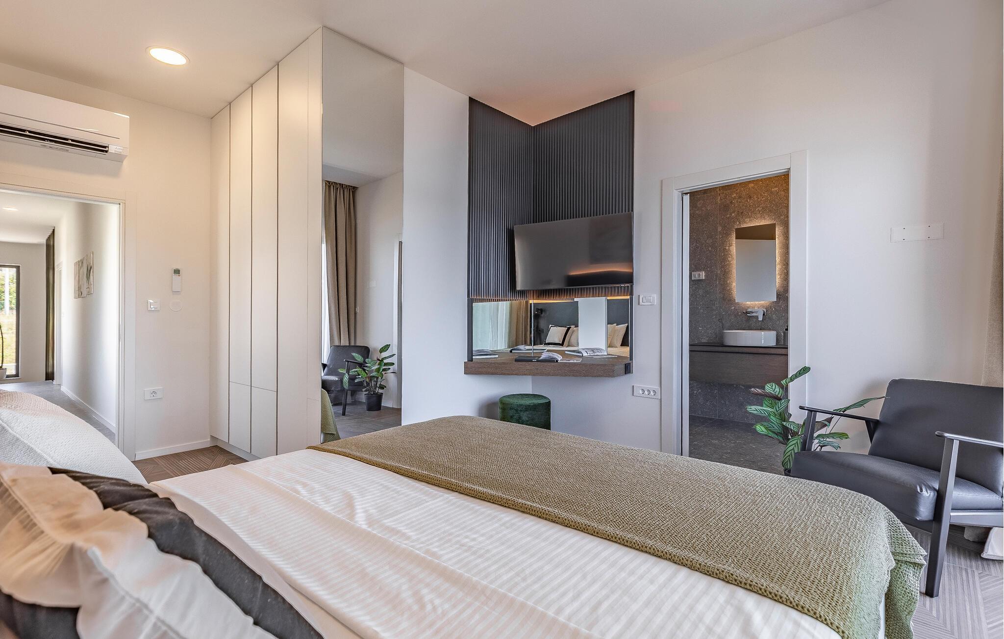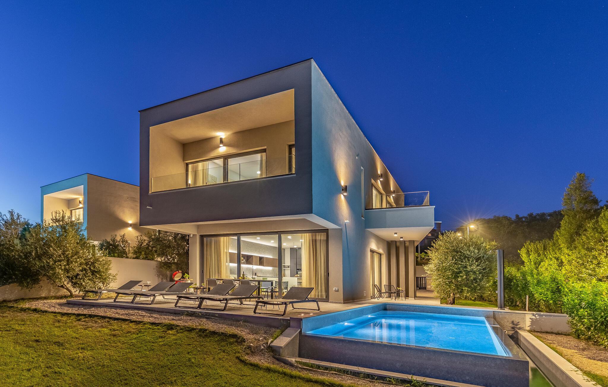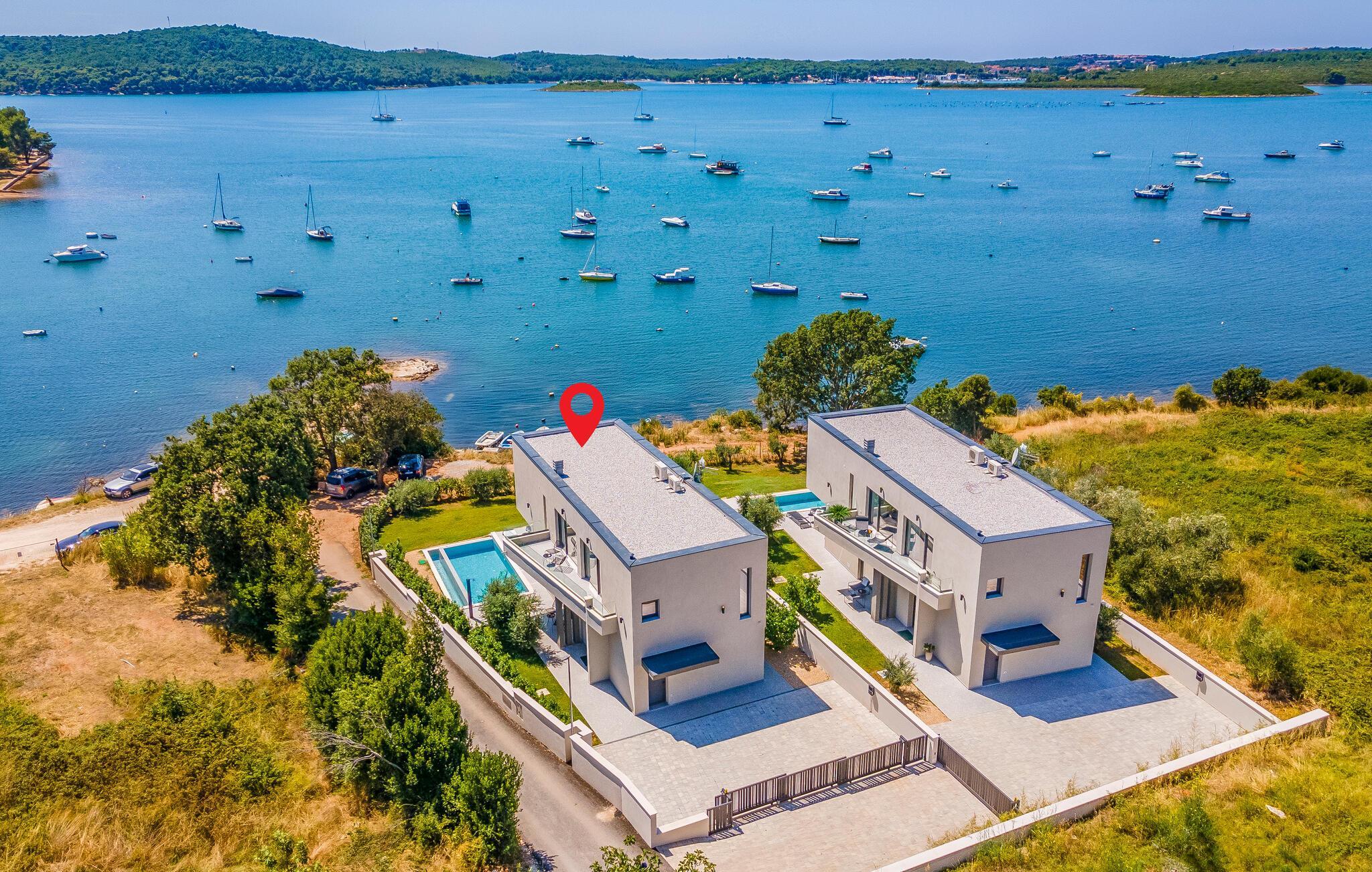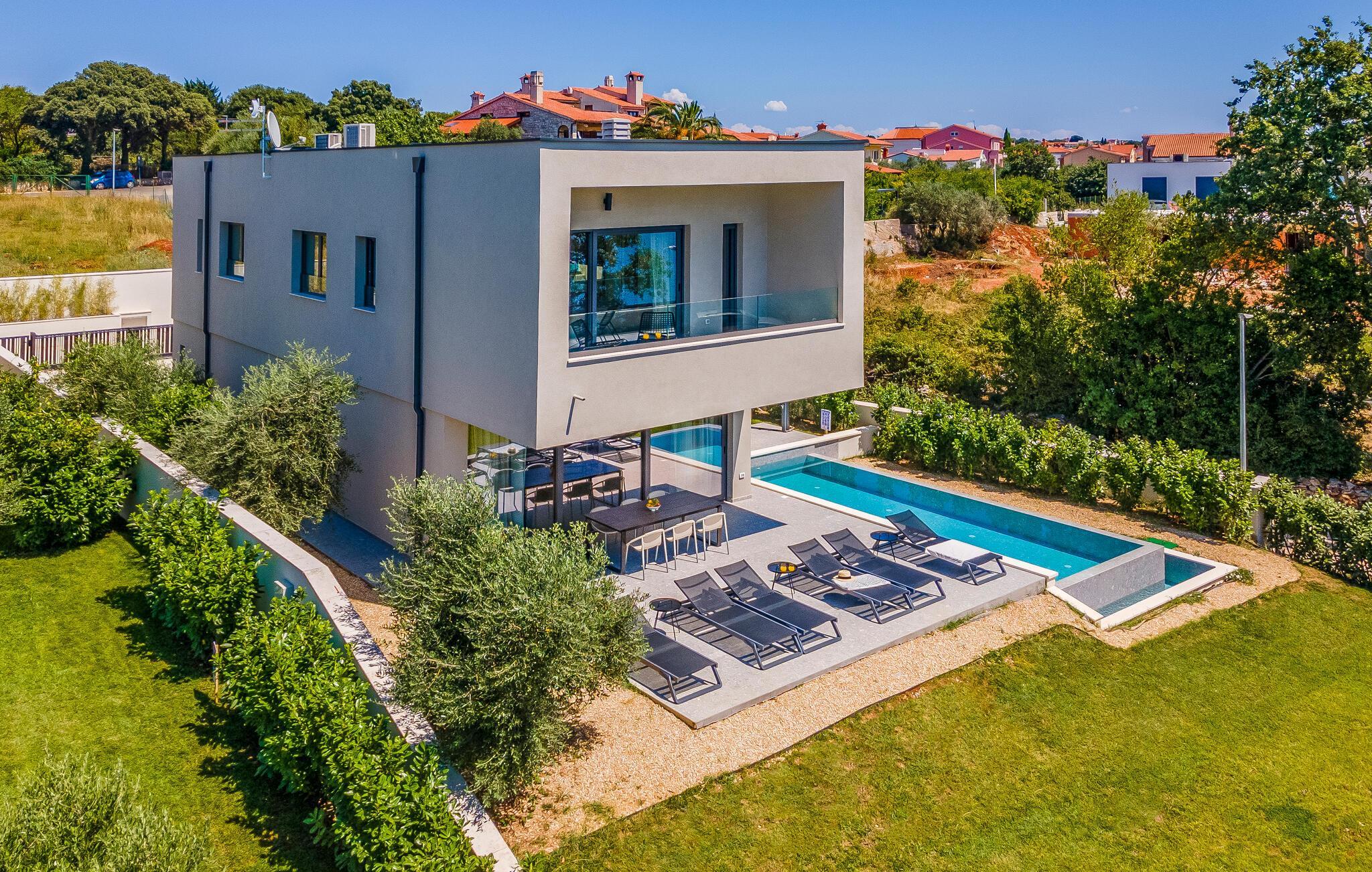 Tilbring en uforglemmelig ferie i dette feriehus nær havet med en fantastisk udsigt over vandet og poolen. De stilfulde møbler, komfortable sofaer, smuk belysning og et veludstyret køkken skaber en behagelig atmosfære, hvor I hurtigt kan slappe af og lade op. Nyd havudsigten gennem gulv-til-loft-vinduerne med et glas vin, lyt til jeres yndlingsmusik, eller lav lækre måltider sammen. Start dagen på terrassen med en kop aromatisk kaffe. Vælg et solrigt sted, og lad den blide havbrise omslutte jer. Forfrisk jer i poolen når som helst, og slap derefter af med en kølig drink. Om aftenen er frisk fisk eller en saftig bøf på grillen den perfekte afslutning på dagen – altid med udsigt til solnedgangen, selvfølgelig. Gå en tur til havet, og nyd afslappende timer på de smukke strande i Medulin. Besøg den historiske by Pula med dens imponerende romerske amfiteater. Oplev den charmerende kystlinje på en bådtur til øerne ud for kysten, og prøv lækre istriske specialiteter i de omkringliggende restauranter.