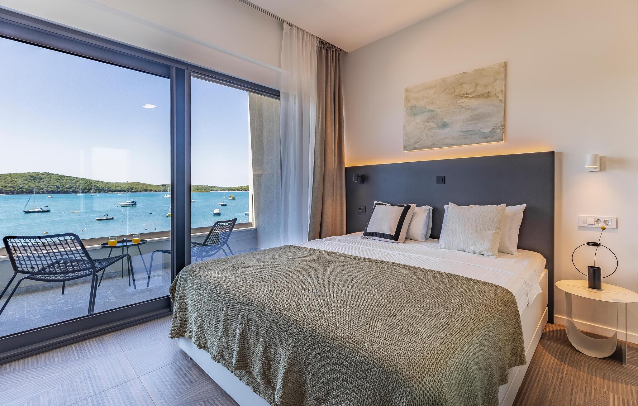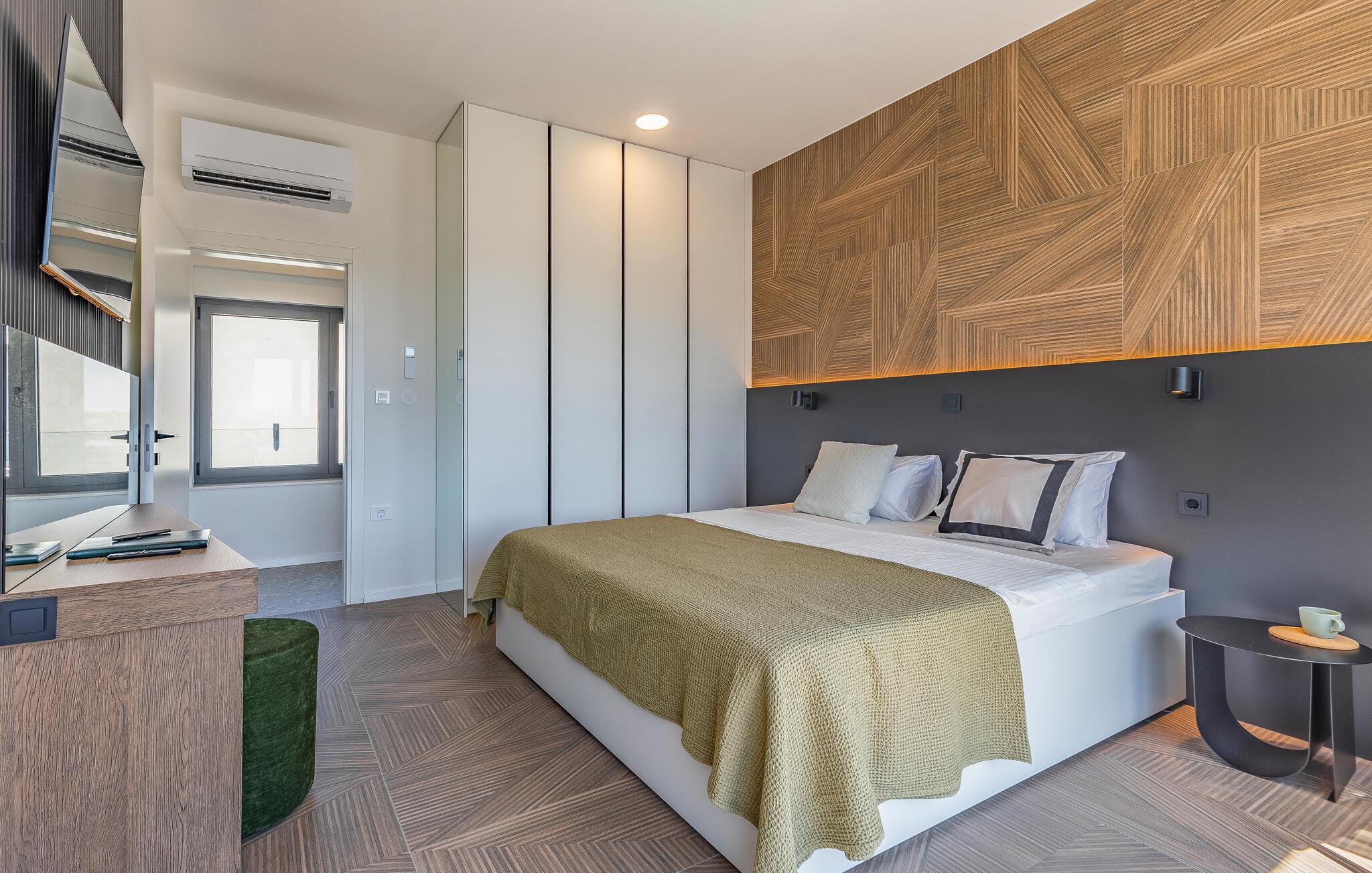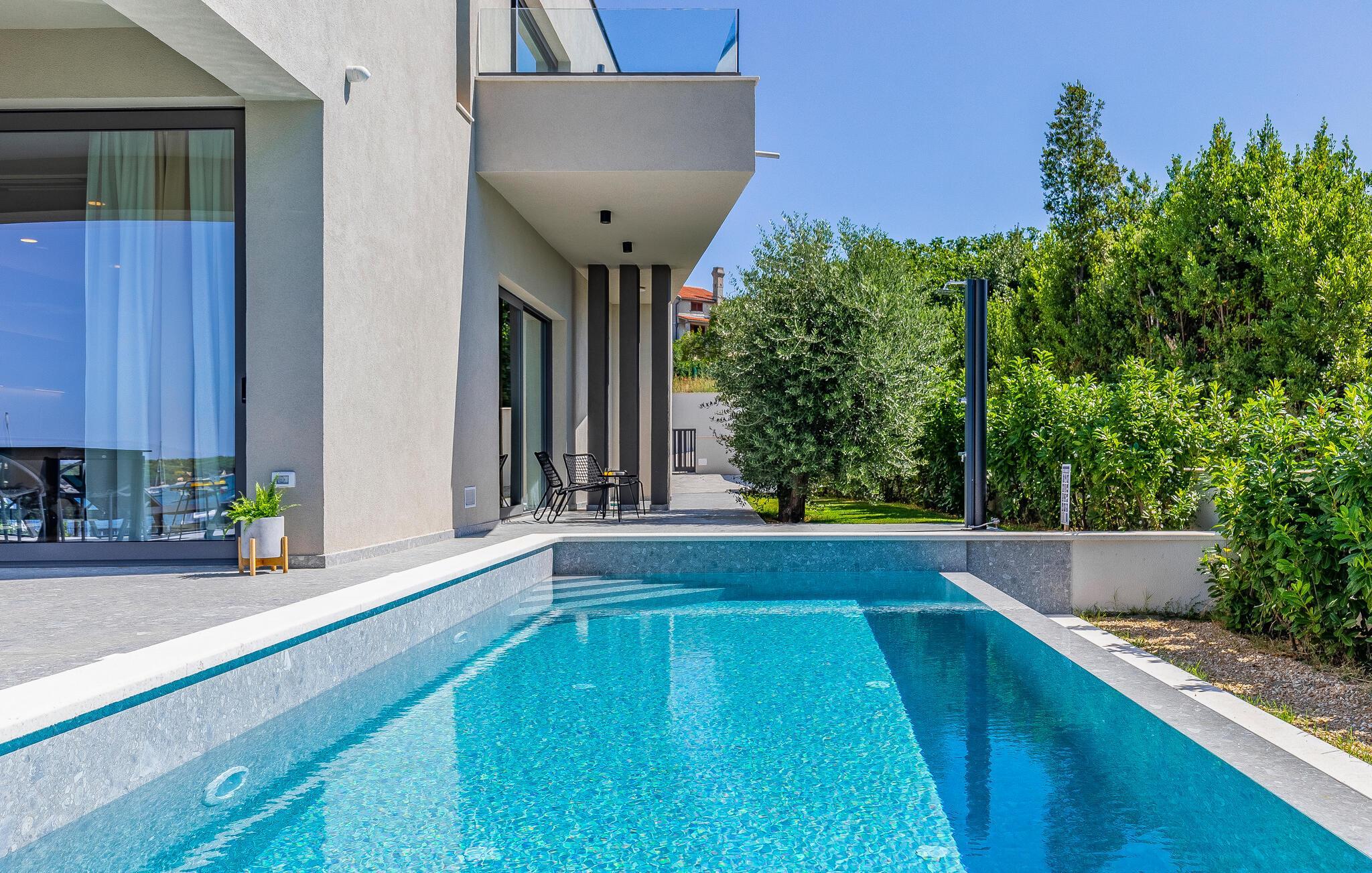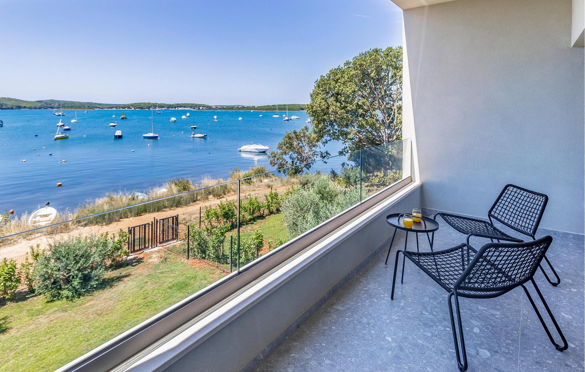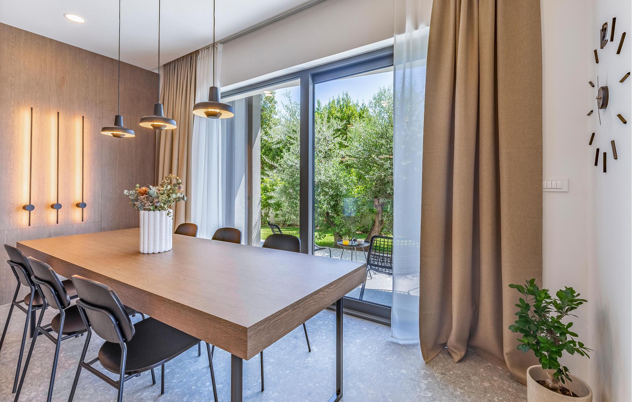Tilbring en uforglemmelig ferie i dette feriehus nær havet med en fantastisk udsigt over vandet og poolen. De stilfulde møbler, komfortable sofaer, smuk belysning og et veludstyret køkken skaber en behagelig atmosfære, hvor I hurtigt kan slappe af og lade op. Nyd havudsigten gennem gulv-til-loft-vinduerne med et glas vin, lyt til jeres yndlingsmusik, eller lav lækre måltider sammen. Start dagen på terrassen med en kop aromatisk kaffe. Vælg et solrigt sted, og lad den blide havbrise omslutte jer. Forfrisk jer i poolen når som helst, og slap derefter af med en kølig drink. Om aftenen er frisk fisk eller en saftig bøf på grillen den perfekte afslutning på dagen – altid med udsigt til solnedgangen, selvfølgelig. Gå en tur til havet, og nyd afslappende timer på de smukke strande i Medulin. Besøg den historiske by Pula med dens imponerende romerske amfiteater. Oplev den charmerende kystlinje på en bådtur til øerne ud for kysten, og prøv lækre istriske specialiteter i de omkringliggende restauranter.