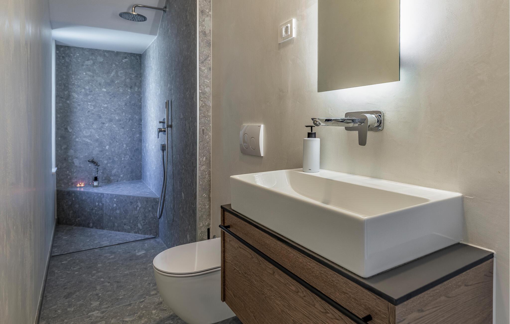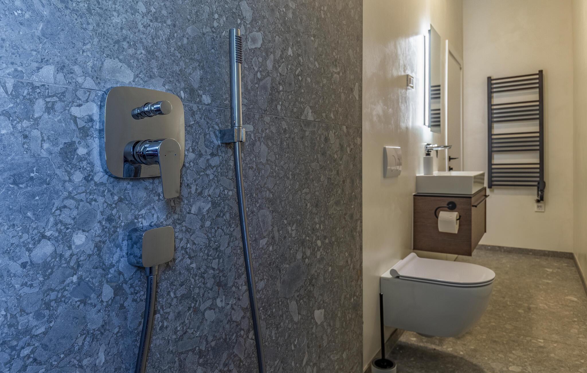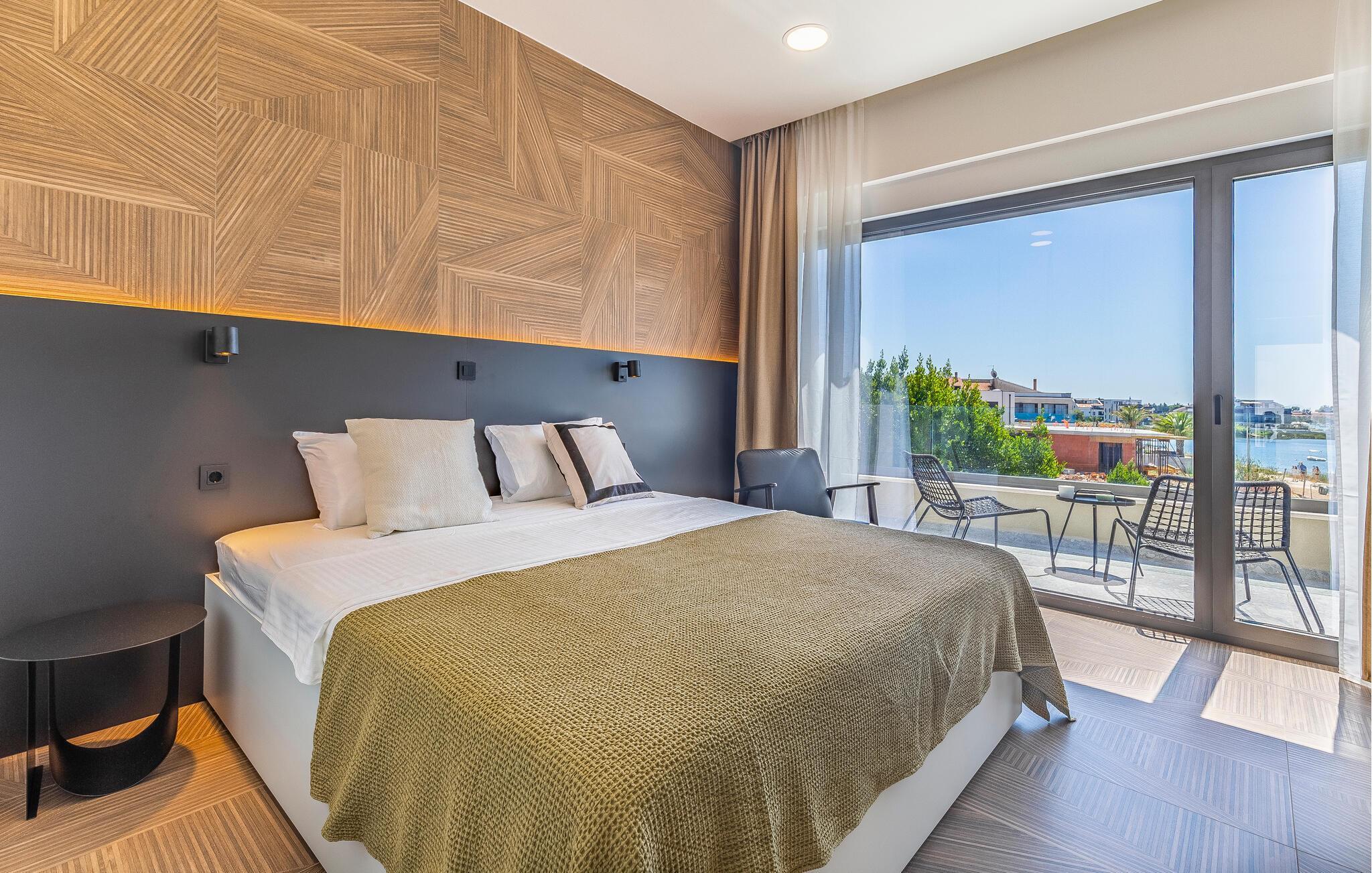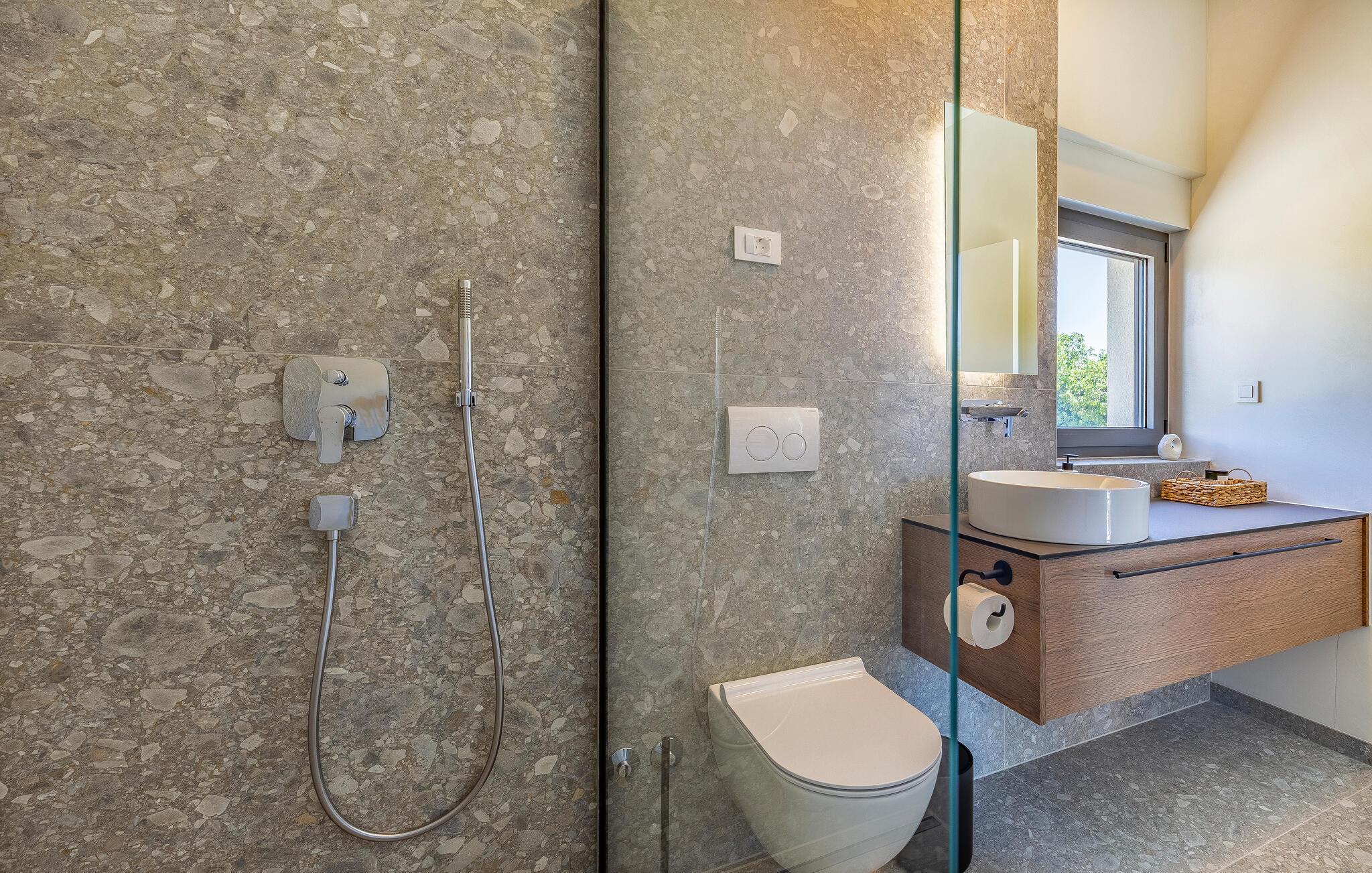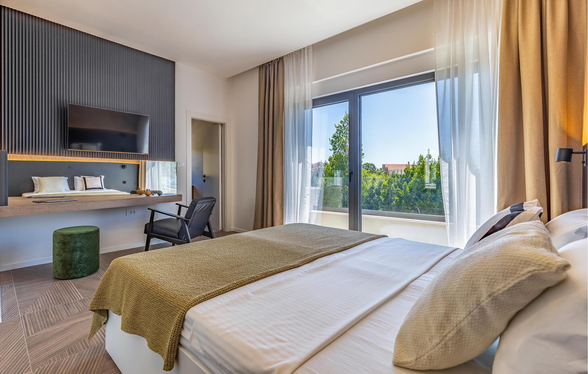 Tilbring en uforglemmelig ferie i dette feriehus nær havet med en fantastisk udsigt over vandet og poolen. De stilfulde møbler, komfortable sofaer, smuk belysning og et veludstyret køkken skaber en behagelig atmosfære, hvor I hurtigt kan slappe af og lade op. Nyd havudsigten gennem gulv-til-loft-vinduerne med et glas vin, lyt til jeres yndlingsmusik, eller lav lækre måltider sammen. Start dagen på terrassen med en kop aromatisk kaffe. Vælg et solrigt sted, og lad den blide havbrise omslutte jer. Forfrisk jer i poolen når som helst, og slap derefter af med en kølig drink. Om aftenen er frisk fisk eller en saftig bøf på grillen den perfekte afslutning på dagen – altid med udsigt til solnedgangen, selvfølgelig. Gå en tur til havet, og nyd afslappende timer på de smukke strande i Medulin. Besøg den historiske by Pula med dens imponerende romerske amfiteater. Oplev den charmerende kystlinje på en bådtur til øerne ud for kysten, og prøv lækre istriske specialiteter i de omkringliggende restauranter.