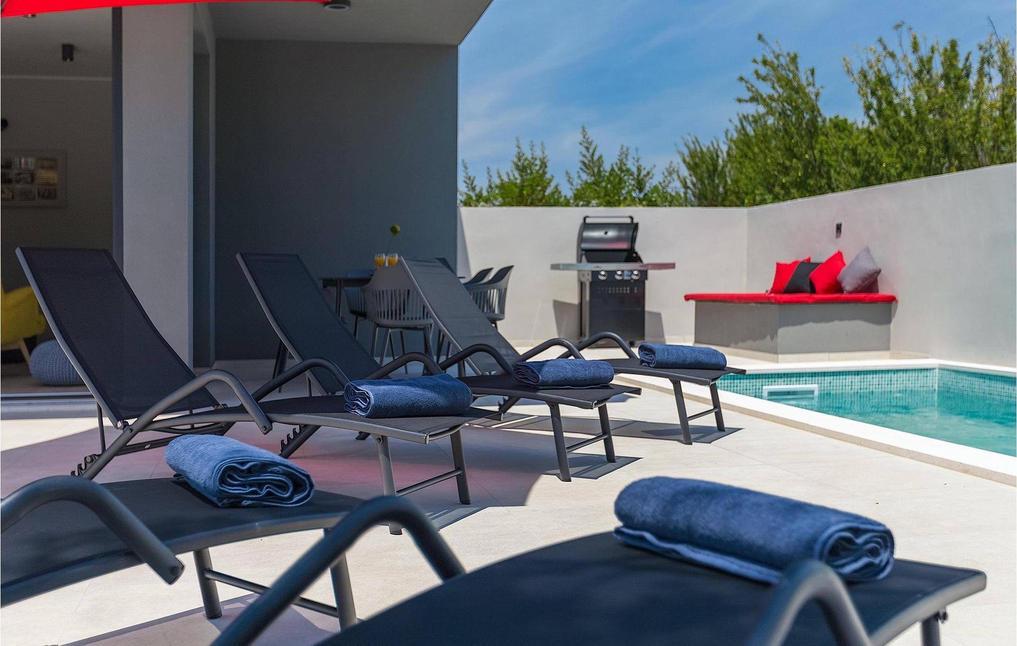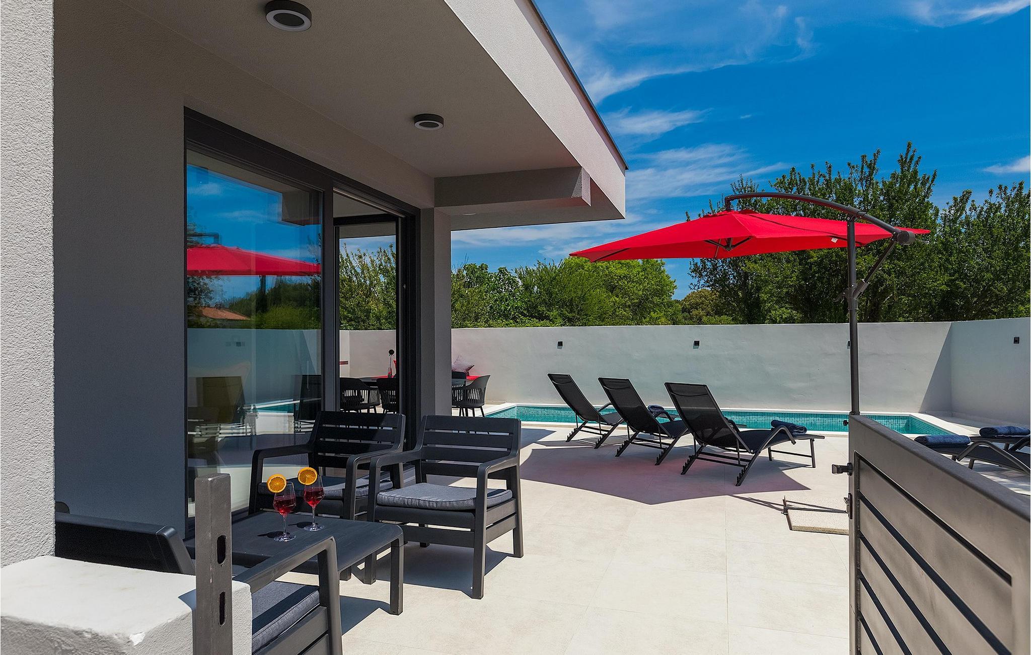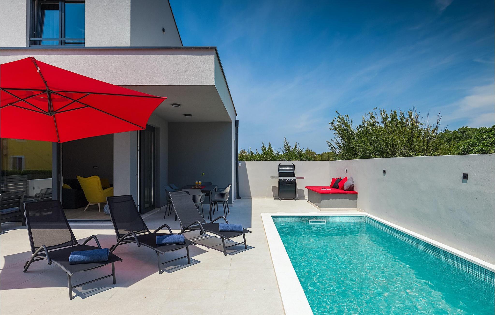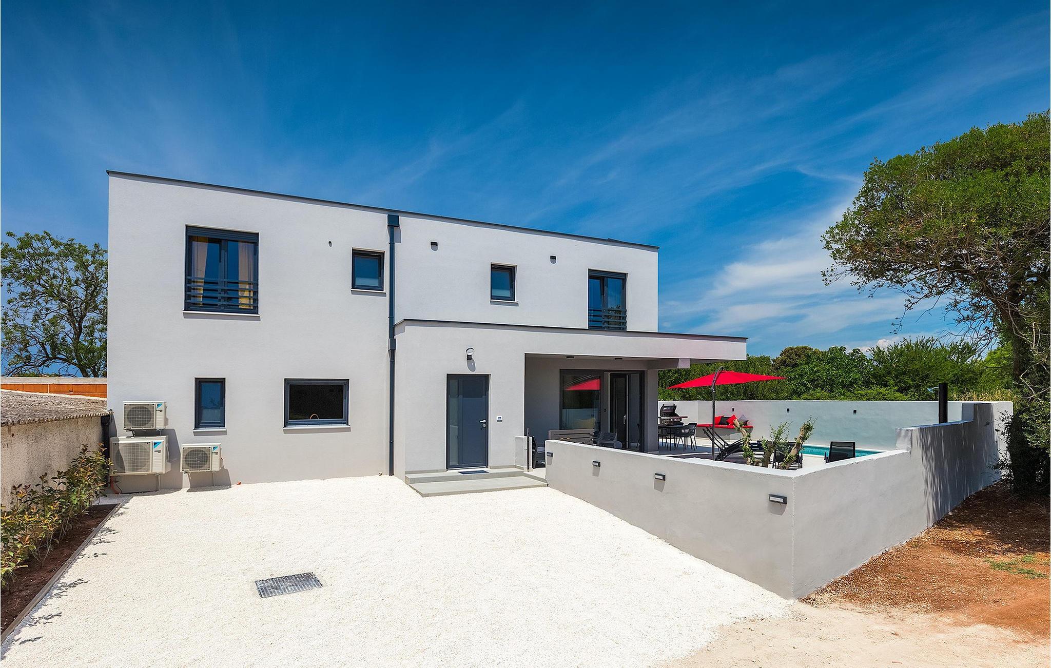 Den moderne Villa Gabriel ligger i den lille landsby Banjole nær Pula. På grund af sin perfekte beliggenhed er strande, restauranter og caféer inden for nem gåafstand. Stueetagen består af en åben plan stue, spisestue og køkken område og et badeværelse. Møbleringen er valgt i enkle farver med en beroligende effekt, men du vil også fange et par spændende farvestænk i ny og næ. Det fuldt udstyrede køkken byder på masser af plads til at tilberede lækre specialiteter og derefter tilbringe tid sammen ved spisebordet. Mens du slapper af efter frokost, kan du nyde udsigten til den private udendørs pool fra den hyggelige stue, som er perfekt til forfriskning på varme sommerdage. Der er liggestole og en parasol omkring poolen. Fra stuen er der udgang til terrassen, hvor I finder spiseplads og gasgrill, som lover uforglemmelige grillaftener. På villaens 1. sal er der to hyggelige soveværelser med ensuite badeværelser. Villaen har aircondition, og privat parkering og internetadgang er også tilgængelig. Ejendommen er fuldt indhegnet. Villa Gabriel nær stranden er det perfekte valg til at undslippe din daglige rutine og tilbringe en drømmeferie. Villa Gabriel er beliggende i en lille ferieby Banjole, kun en kort gåafstand fra stranden.