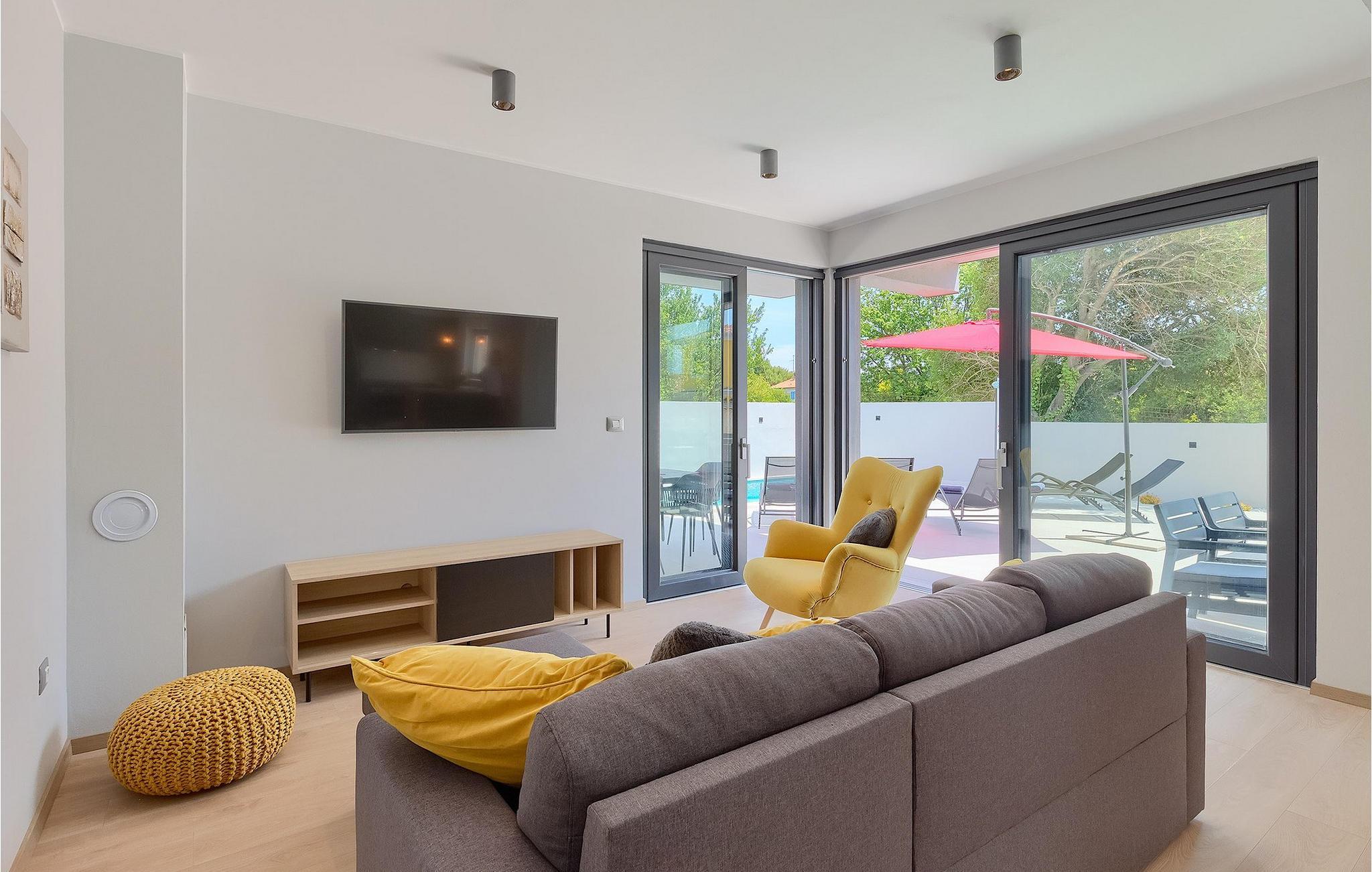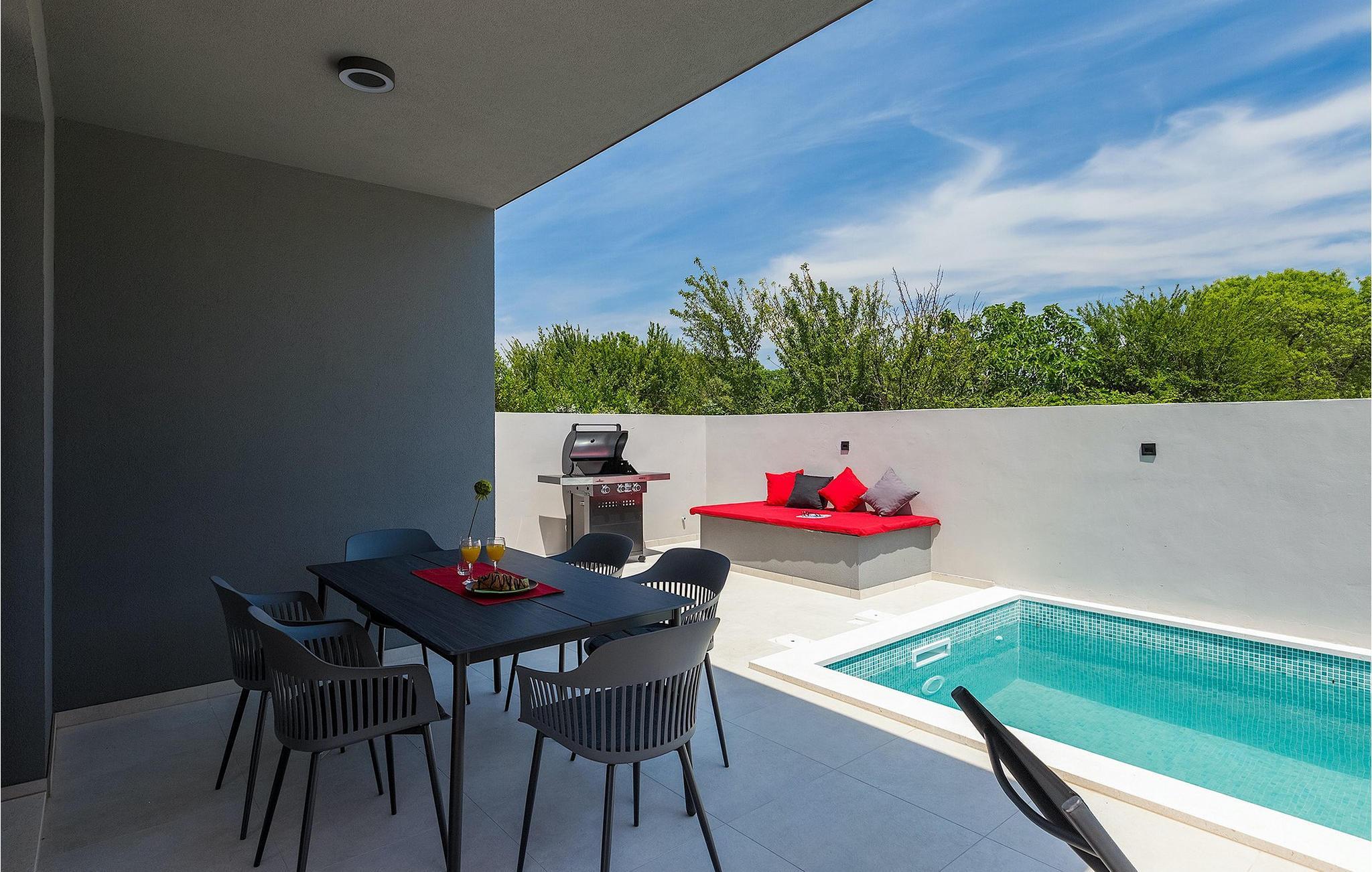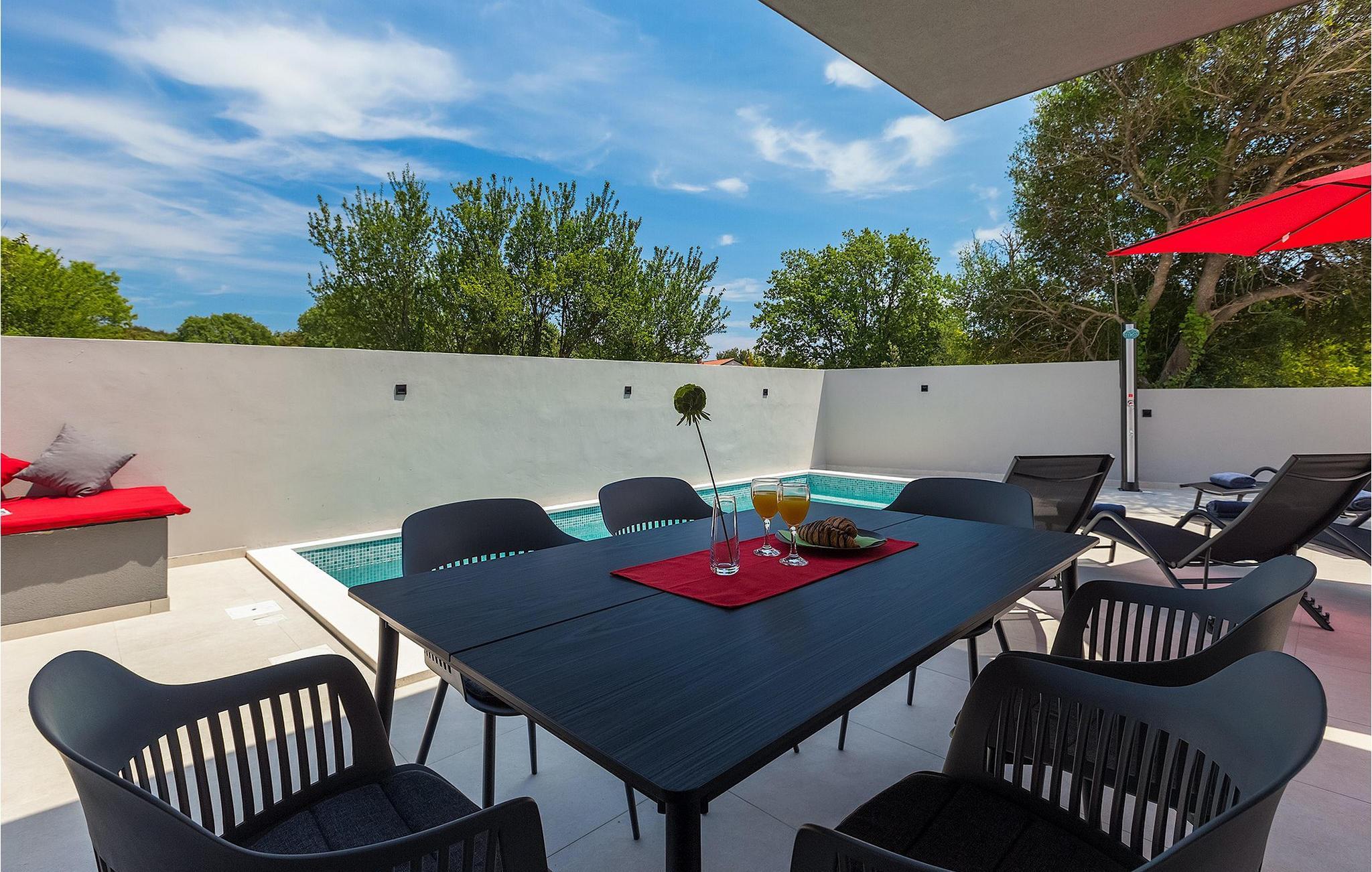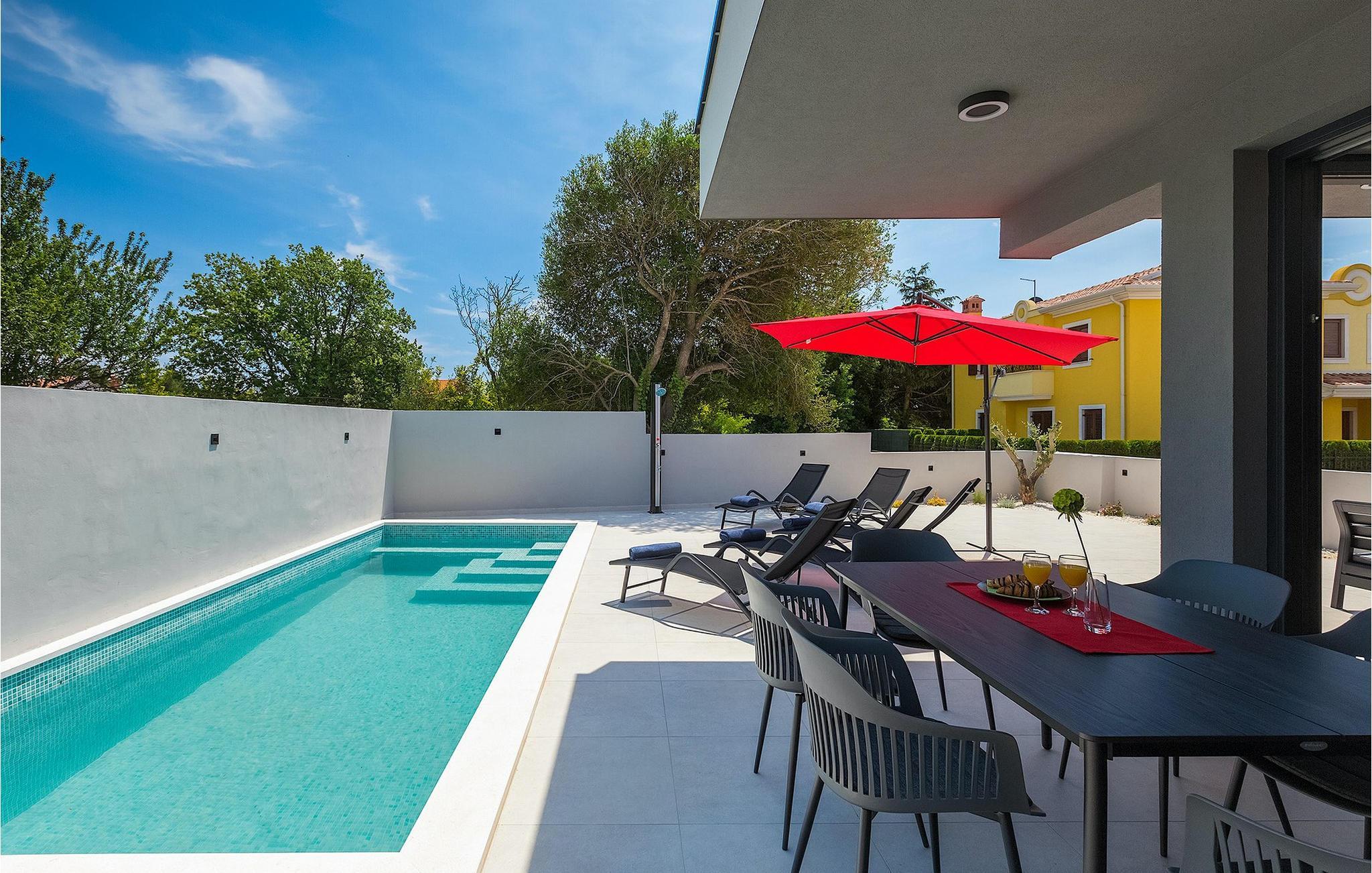 Den moderne Villa Gabriel ligger i den lille landsby Banjole nær Pula. På grund af sin perfekte beliggenhed er strande, restauranter og caféer inden for nem gåafstand. Stueetagen består af en åben plan stue, spisestue og køkken område og et badeværelse. Møbleringen er valgt i enkle farver med en beroligende effekt, men du vil også fange et par spændende farvestænk i ny og næ. Det fuldt udstyrede køkken byder på masser af plads til at tilberede lækre specialiteter og derefter tilbringe tid sammen ved spisebordet. Mens du slapper af efter frokost, kan du nyde udsigten til den private udendørs pool fra den hyggelige stue, som er perfekt til forfriskning på varme sommerdage. Der er liggestole og en parasol omkring poolen. Fra stuen er der udgang til terrassen, hvor I finder spiseplads og gasgrill, som lover uforglemmelige grillaftener. På villaens 1. sal er der to hyggelige soveværelser med ensuite badeværelser. Villaen har aircondition, og privat parkering og internetadgang er også tilgængelig. Ejendommen er fuldt indhegnet. Villa Gabriel nær stranden er det perfekte valg til at undslippe din daglige rutine og tilbringe en drømmeferie. Villa Gabriel er beliggende i en lille ferieby Banjole, kun en kort gåafstand fra stranden.