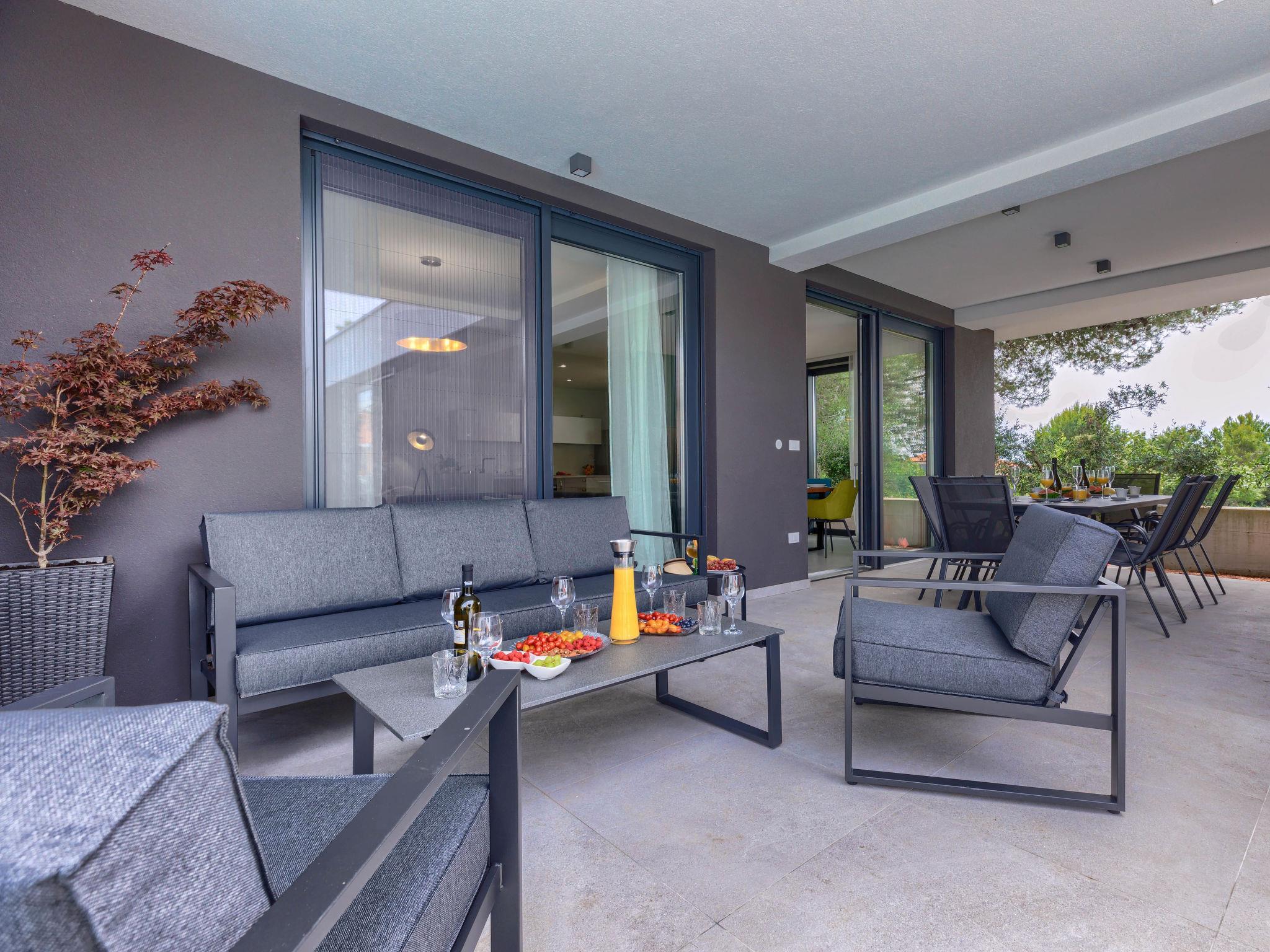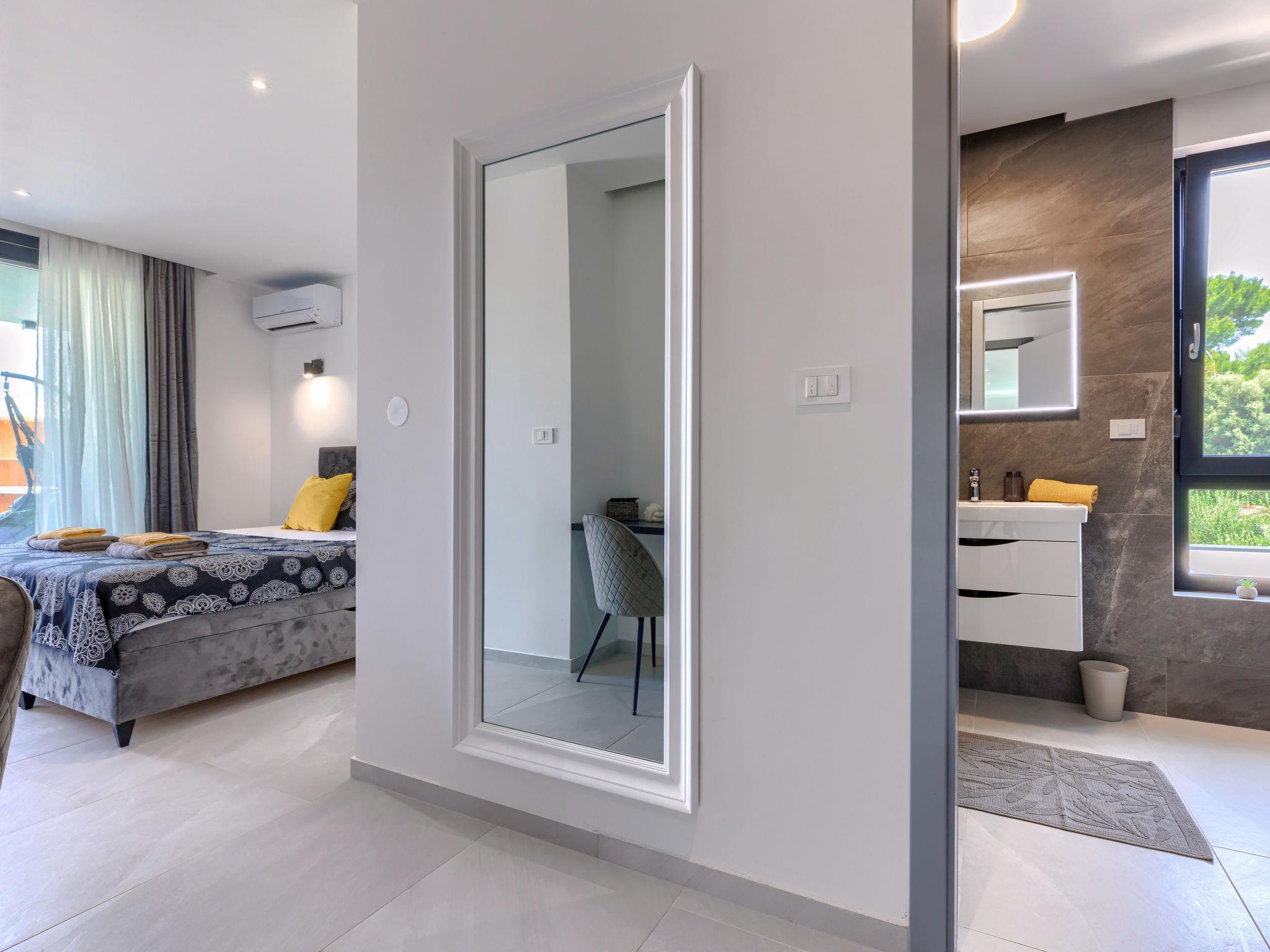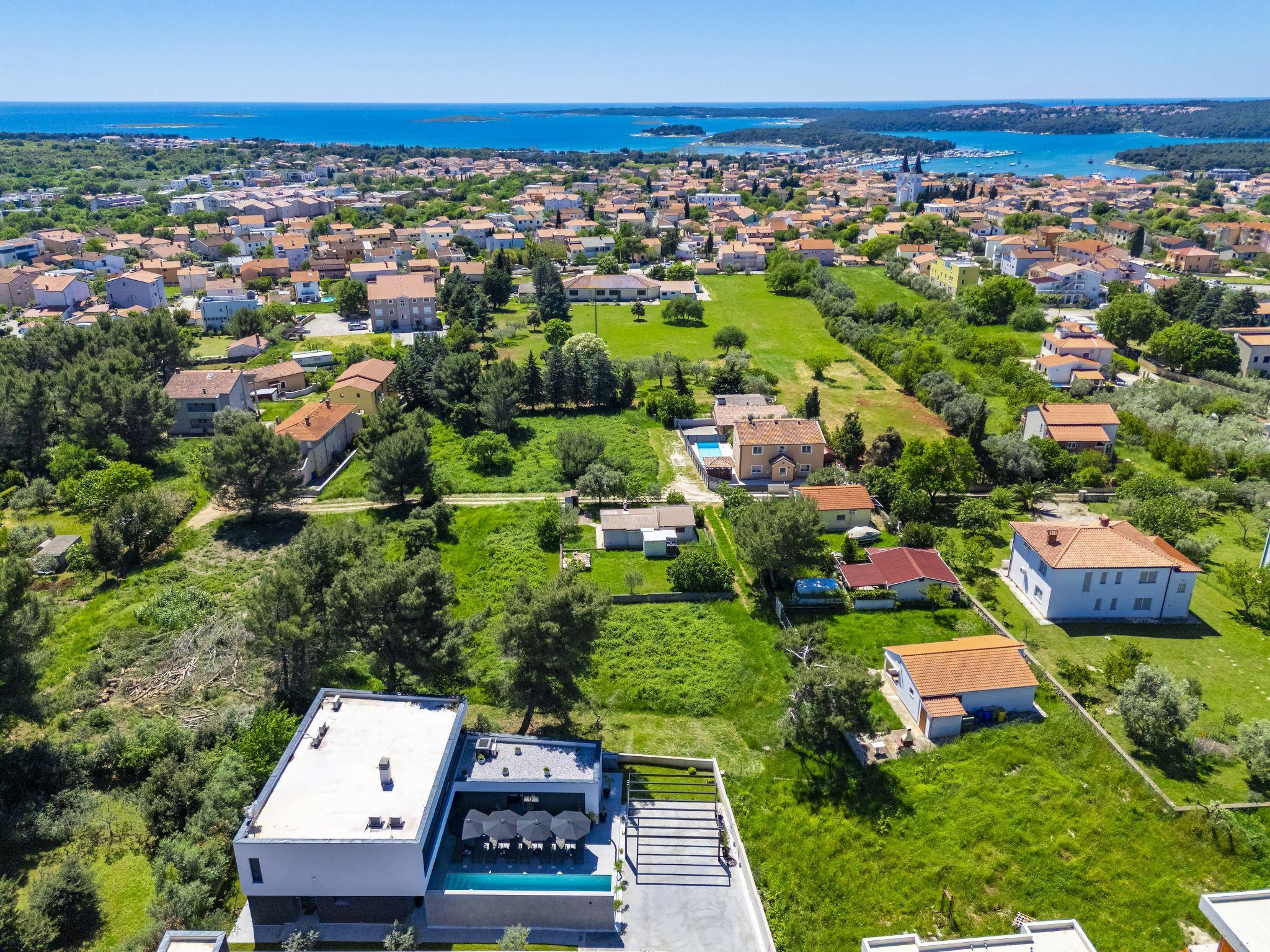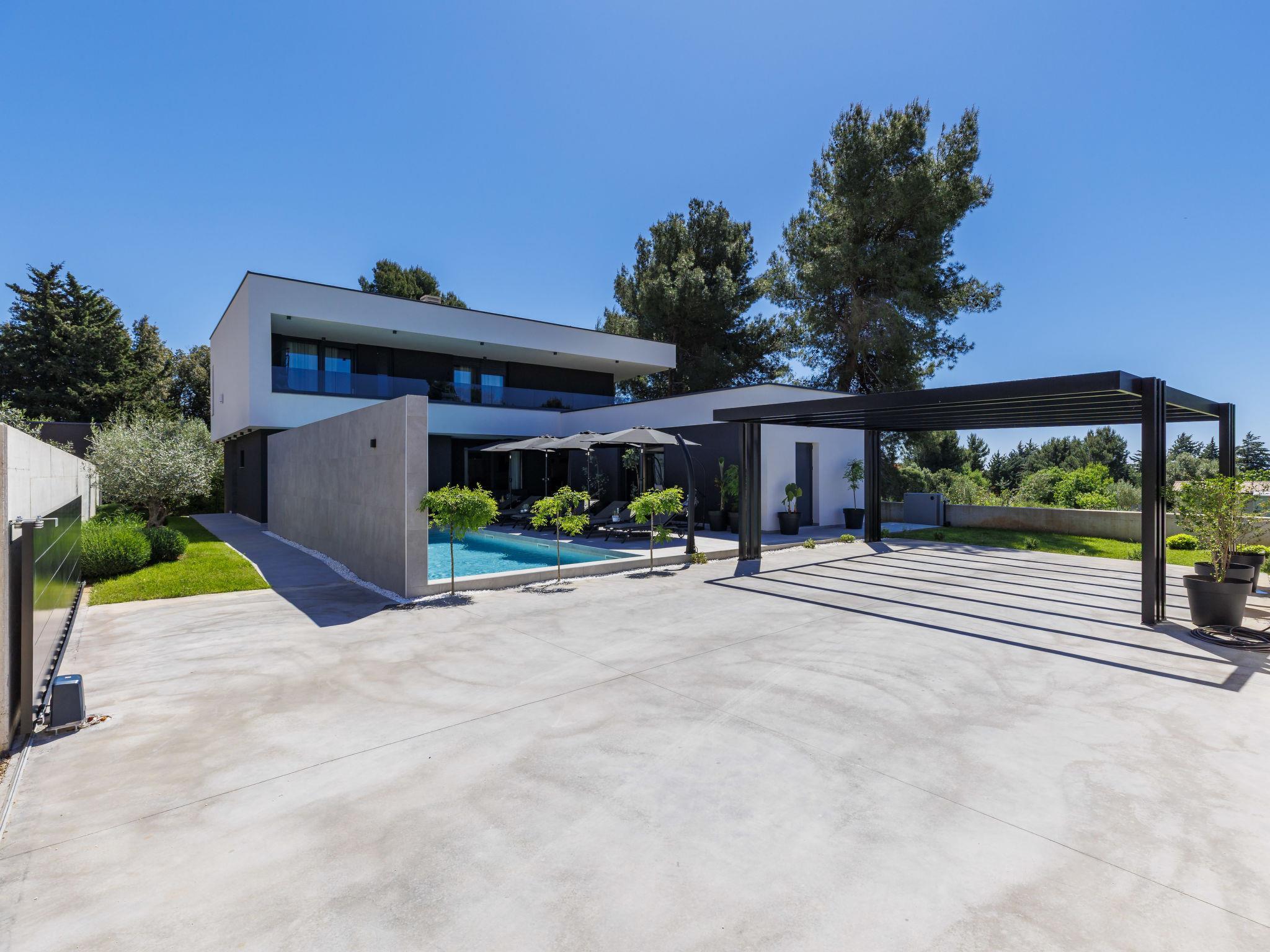 Modern villa "Nika", 2 storeys. 1.5 km from the centre of Medulin, 10 km from the centre of Pula, in a sunny, elevated position, 1 km from the sea, 1.5 km from the beach, in a cul-de-sac. Private: property 750 m2, garden with lawn and trees, swimming pool angular, heated (13 x 4 m, depth 140 cm, seasonal availability: 01.Apr. - 01.Nov.) with internal staircase and salt-electrolysis pool-cleaning system. Outdoor shower, terrace (15 m2), garden furniture, barbecue, pool maintenance by the owner/gardener. In the house: internet access, sauna, massage (extra). Hot tub, spa area, air conditioning, washing machine. Roofed, parking (for 3 cars) at the house on the premises. Shop 1 km, supermarket 1.5 km, restaurant 500 m, bus stop 750 m, sandy beach 1.5 km pebble beach 1.5 km, rocky beach 1.5 km. Surf school 2 km, riding stable 1 km, walking paths from the house 100 m, cycle lane 150 m. Nearby attractions: Amphitheater 10 km. The owner does not accept any youth groups. Swimming pool heated (extra), with counterflow and hydromassage. It is necessary to announce 7 days in advance if the pool heating is required. Video surveillance of the property.