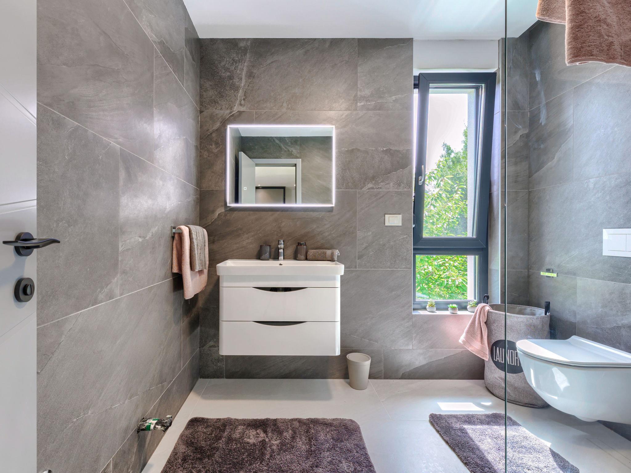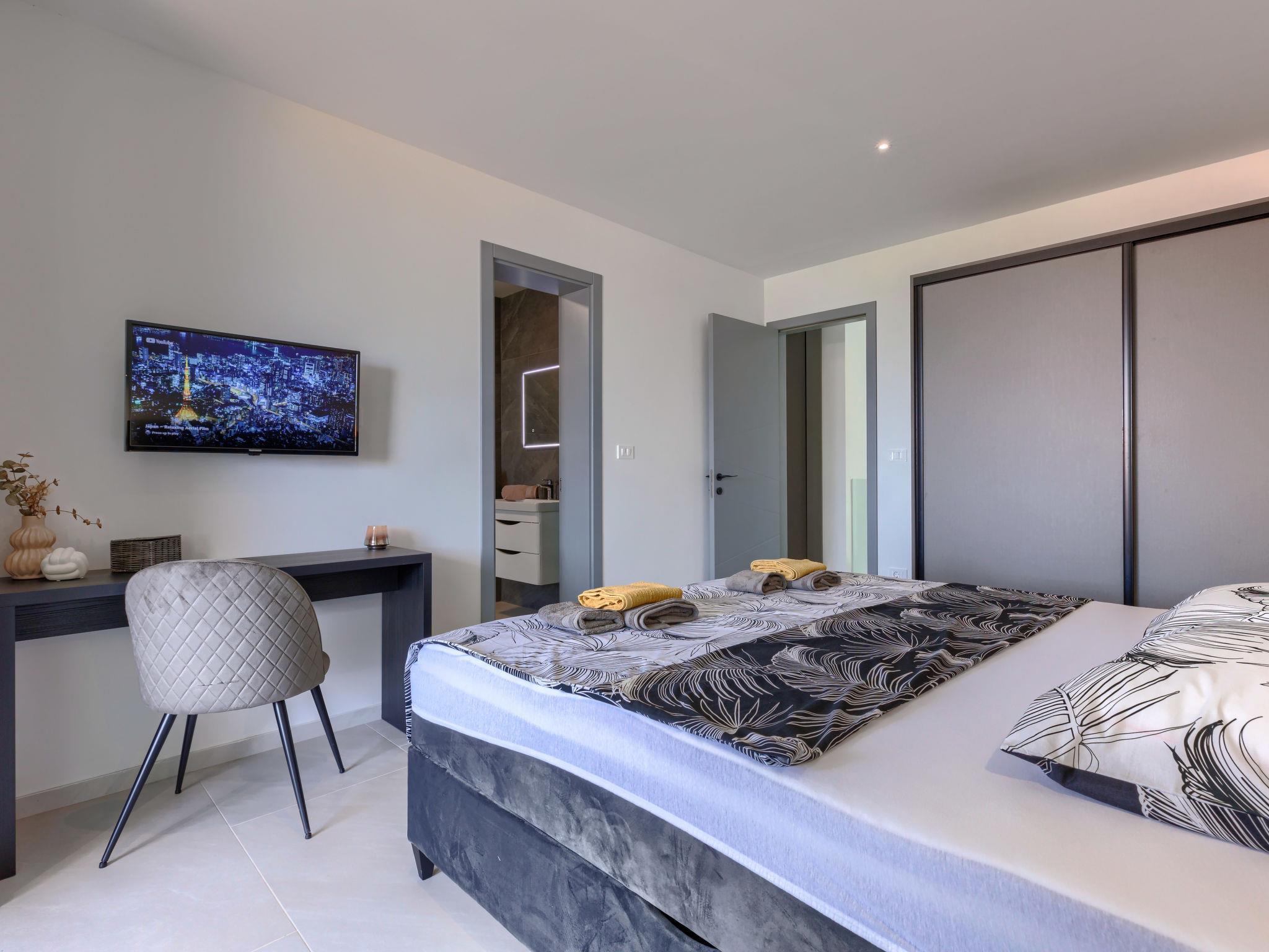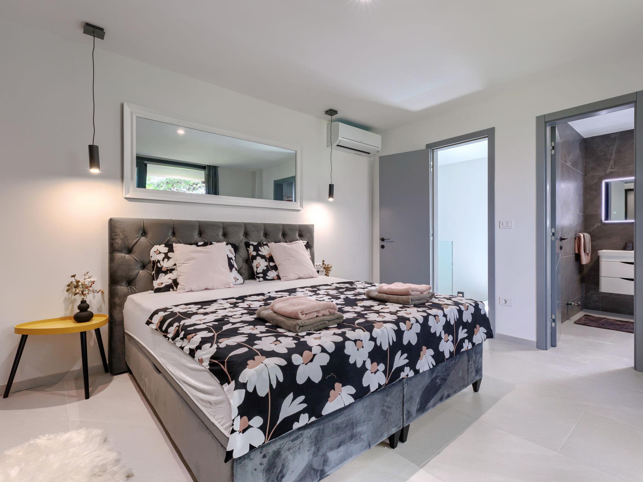 Modern villa "Nika", 2 storeys. 1.5 km from the centre of Medulin, 10 km from the centre of Pula, in a sunny, elevated position, 1 km from the sea, 1.5 km from the beach, in a cul-de-sac. Private: property 750 m2, garden with lawn and trees, swimming pool angular, heated (13 x 4 m, depth 140 cm, seasonal availability: 01.Apr. - 01.Nov.) with internal staircase and salt-electrolysis pool-cleaning system. Outdoor shower, terrace (15 m2), garden furniture, barbecue, pool maintenance by the owner/gardener. In the house: internet access, sauna, massage (extra). Hot tub, spa area, air conditioning, washing machine. Roofed, parking (for 3 cars) at the house on the premises. Shop 1 km, supermarket 1.5 km, restaurant 500 m, bus stop 750 m, sandy beach 1.5 km pebble beach 1.5 km, rocky beach 1.5 km. Surf school 2 km, riding stable 1 km, walking paths from the house 100 m, cycle lane 150 m. Nearby attractions: Amphitheater 10 km. The owner does not accept any youth groups. Swimming pool heated (extra), with counterflow and hydromassage. It is necessary to announce 7 days in advance if the pool heating is required. Video surveillance of the property.