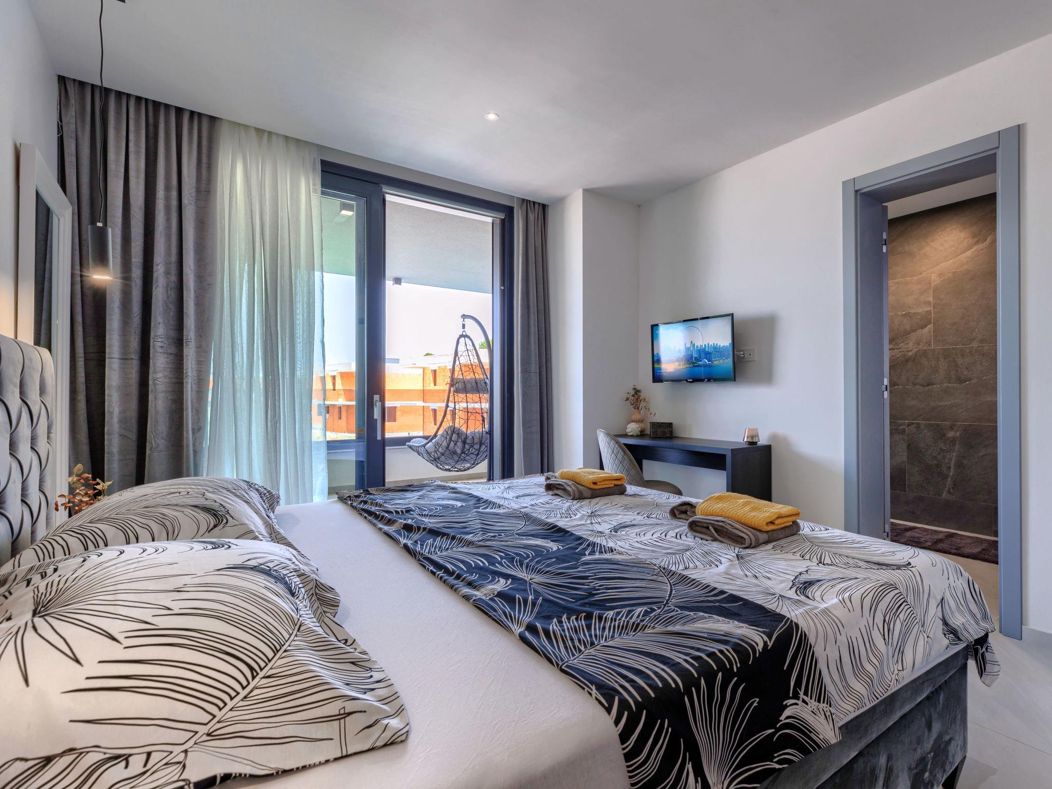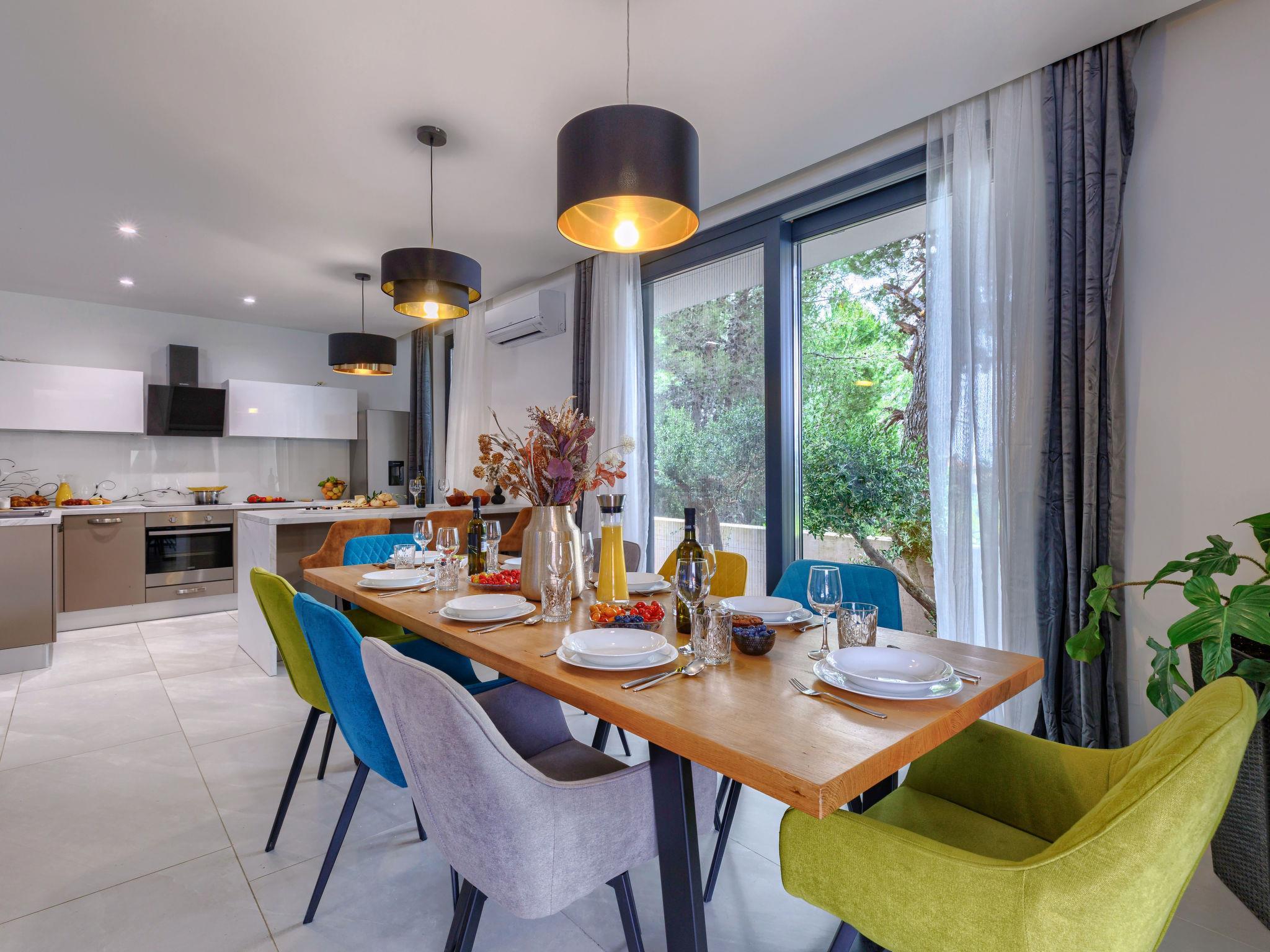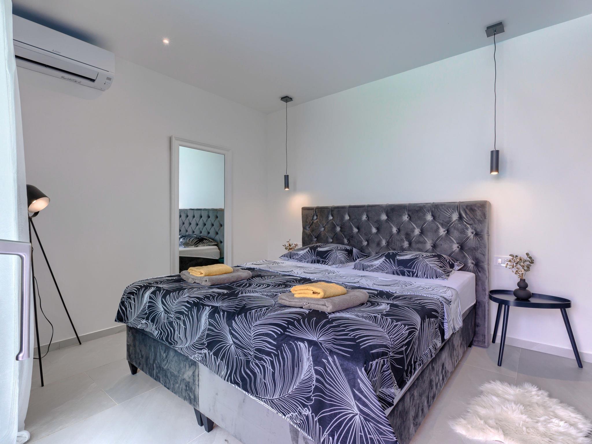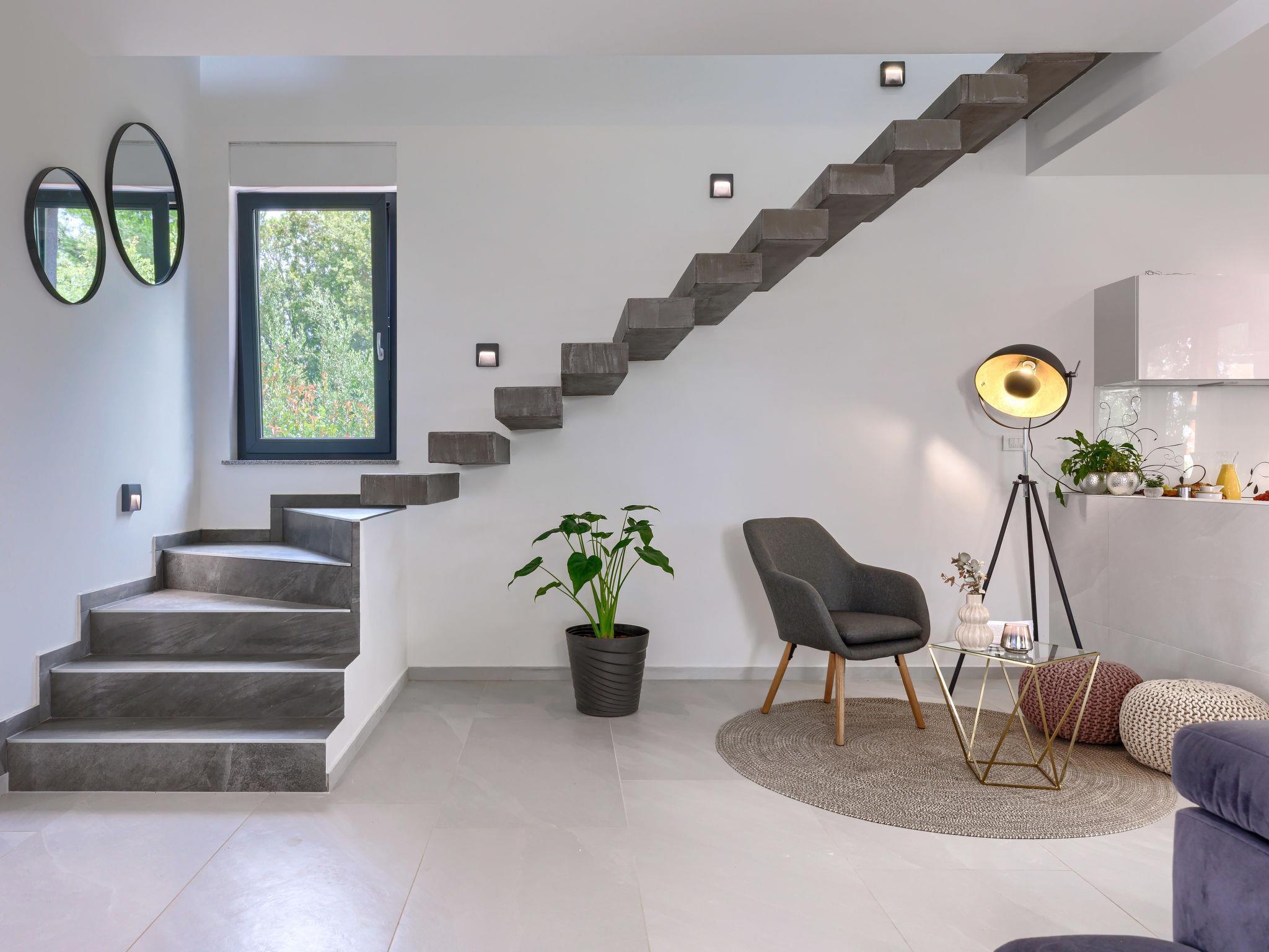 Modern villa "Nika", 2 storeys. 1.5 km from the centre of Medulin, 10 km from the centre of Pula, in a sunny, elevated position, 1 km from the sea, 1.5 km from the beach, in a cul-de-sac. Private: property 750 m2, garden with lawn and trees, swimming pool angular, heated (13 x 4 m, depth 140 cm, seasonal availability: 01.Apr. - 01.Nov.) with internal staircase and salt-electrolysis pool-cleaning system. Outdoor shower, terrace (15 m2), garden furniture, barbecue, pool maintenance by the owner/gardener. In the house: internet access, sauna, massage (extra). Hot tub, spa area, air conditioning, washing machine. Roofed, parking (for 3 cars) at the house on the premises. Shop 1 km, supermarket 1.5 km, restaurant 500 m, bus stop 750 m, sandy beach 1.5 km pebble beach 1.5 km, rocky beach 1.5 km. Surf school 2 km, riding stable 1 km, walking paths from the house 100 m, cycle lane 150 m. Nearby attractions: Amphitheater 10 km. The owner does not accept any youth groups. Swimming pool heated (extra), with counterflow and hydromassage. It is necessary to announce 7 days in advance if the pool heating is required. Video surveillance of the property.