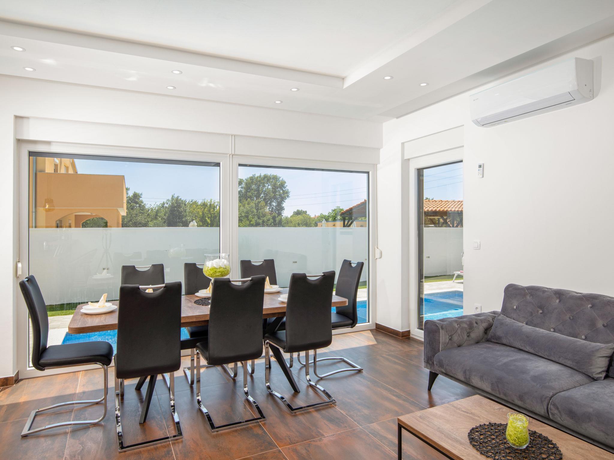 Modern house "L&L". 1.5 km from the centre of Medulin, 10 km from the centre of Pula, in a sunny position, 1.3 km from the sea, 1.3 km from the beach. Private: property 450 m2 (fenced), swimming pool angular, heated (35 m2, depth 140 cm, seasonal availability: 01.May. - 01.Nov.) with internal staircase and salt-electrolysis pool-cleaning system. Outdoor shower, pool house with WC, terrace (20 m2), garden furniture, barbecue. In the house: internet access, air conditioning, washing machine. Parking (for 3 cars) at the house on the premises. Shop 600 m, supermarket 1 km, restaurant 700 m, bus stop 750 m, sandy beach 2 km pebble beach 1.3 km. Surf school 2 km, riding stable 1 km, walking paths from the house 500 m, cycle lane 300 m. Nearby attractions: Amphitheater 10 km. The owner does not accept any youth groups. Swimming pool heated (extra). It is necessary to announce 7 days in advance if the pool heating is required.
