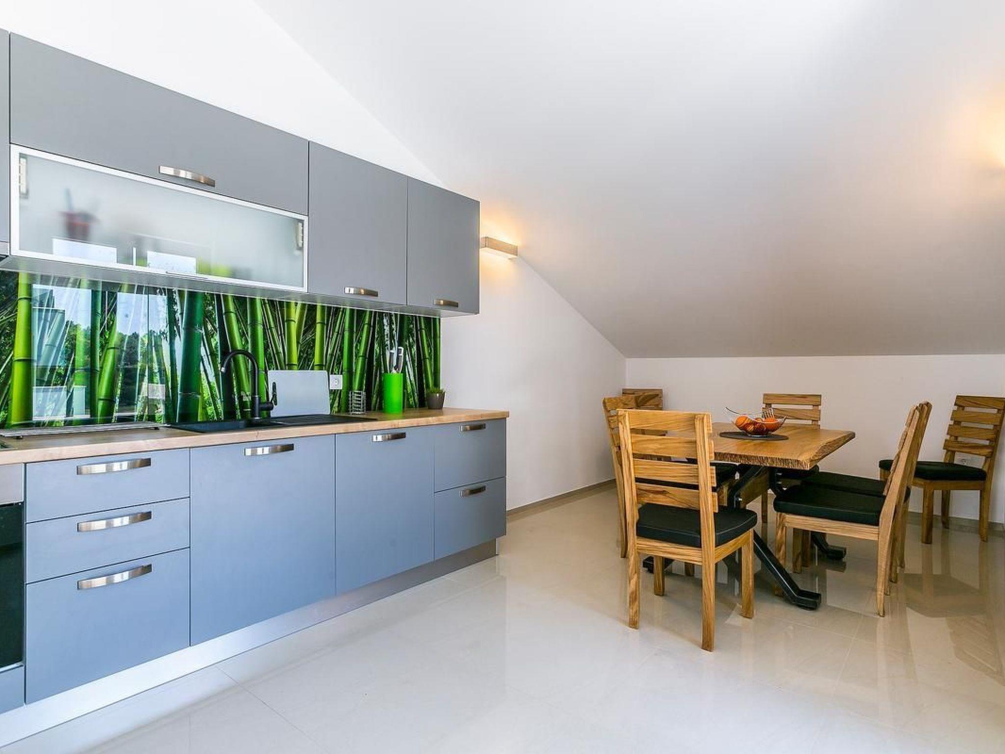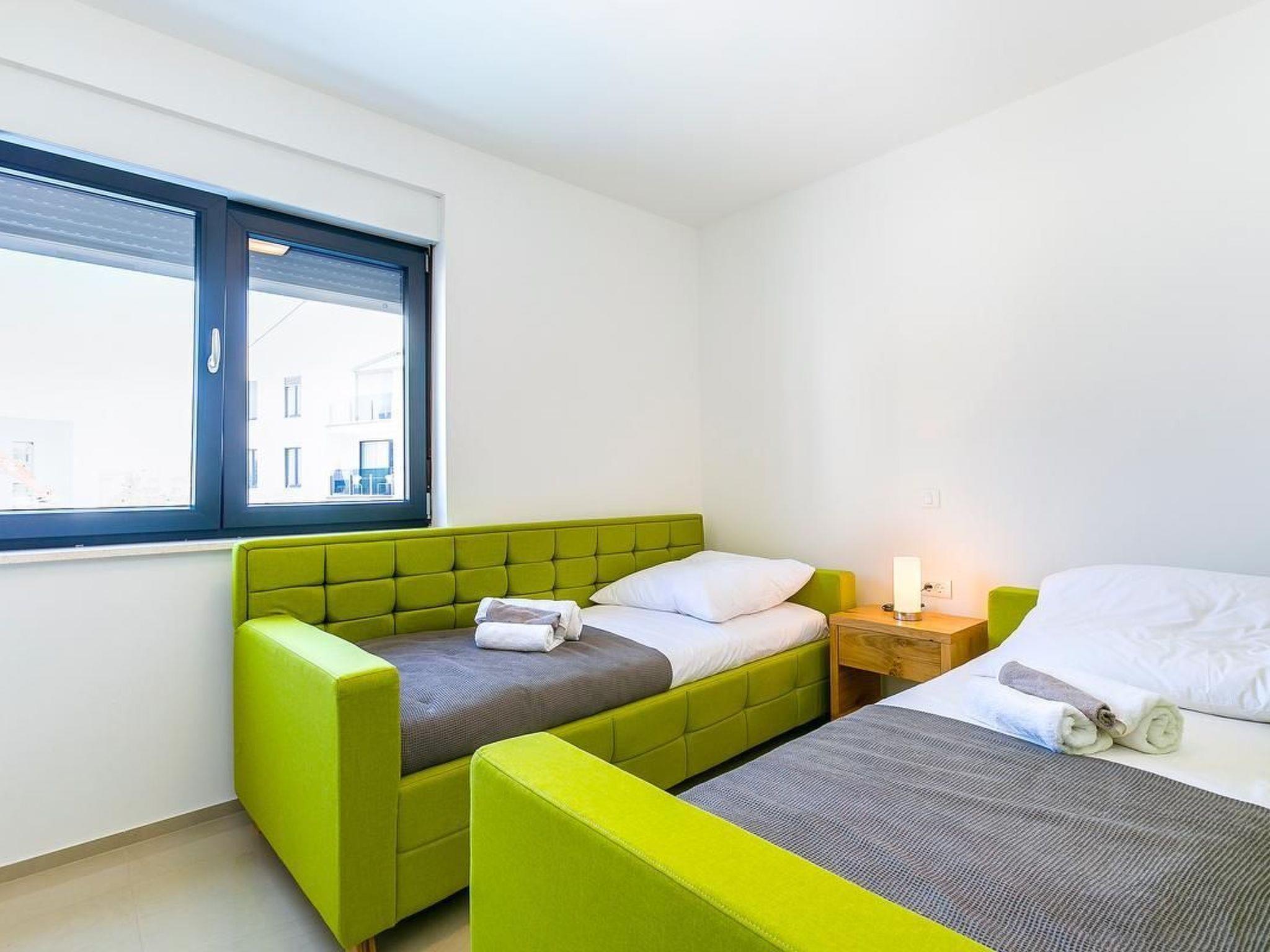 This modern apartment is situated in the newly constructed apartment complex, close to the sea. Nearest beach is 300m, and tourist center 500 meters distant. Sandy beach is only few minutes drive away. Apartment is on two floors, first and second, and offers accommodation for six people. Upper level has an air conditioned living room, kitchen and balcony with splendid sea view. Kitchen is fully equipped and includes: electric stove with oven, microwave, fridge with freezer, dishwasher, filter coffee machine and cooking utensils. Lower level has three bedrooms, two bathrooms and also a balcony with sea view. Bedrooms are not air conditioned. Air condition is in the hallway and also upstairs in the living room. Guests have washing machine, WiFi and one parking place. Bed sheets and towels are included in price. Guests can also freshen' up in the swimming pool which is shared with other guests in the apartment complex. Pets are not allowed.