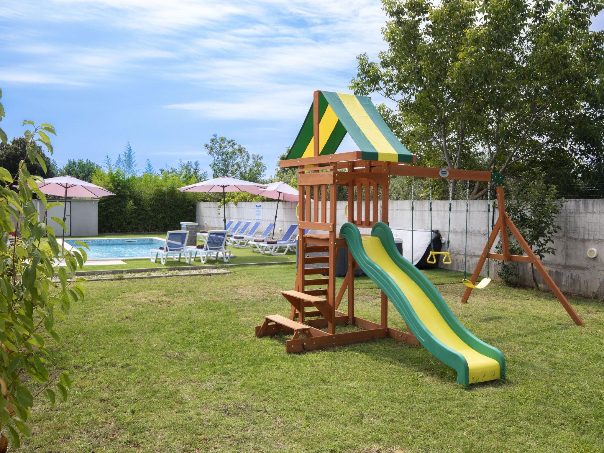 The property features a large 50 m² pool surrounded by 12 sun loungers and sun umbrellas, an outdoor hot tub, a gas barbecue with a dining area, and a children’s swing set, creating the perfect setting for relaxation and family fun. Unit 3 also offers an outdoor sauna.