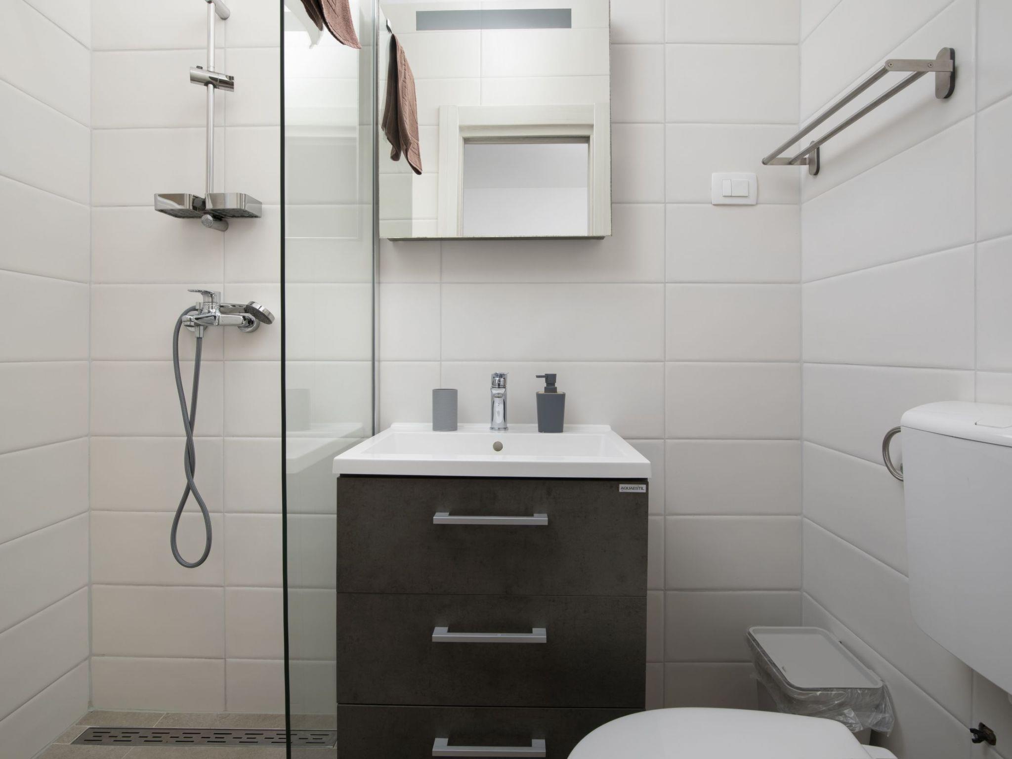 Unit 3 provides a peaceful retreat for two guests, with a double bed and a bathroom that includes both a shower and a bathtub.
