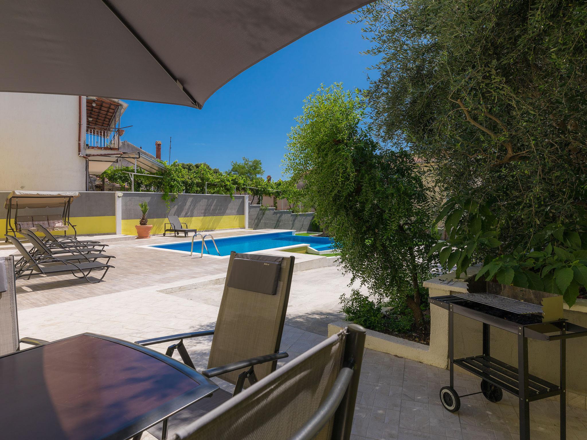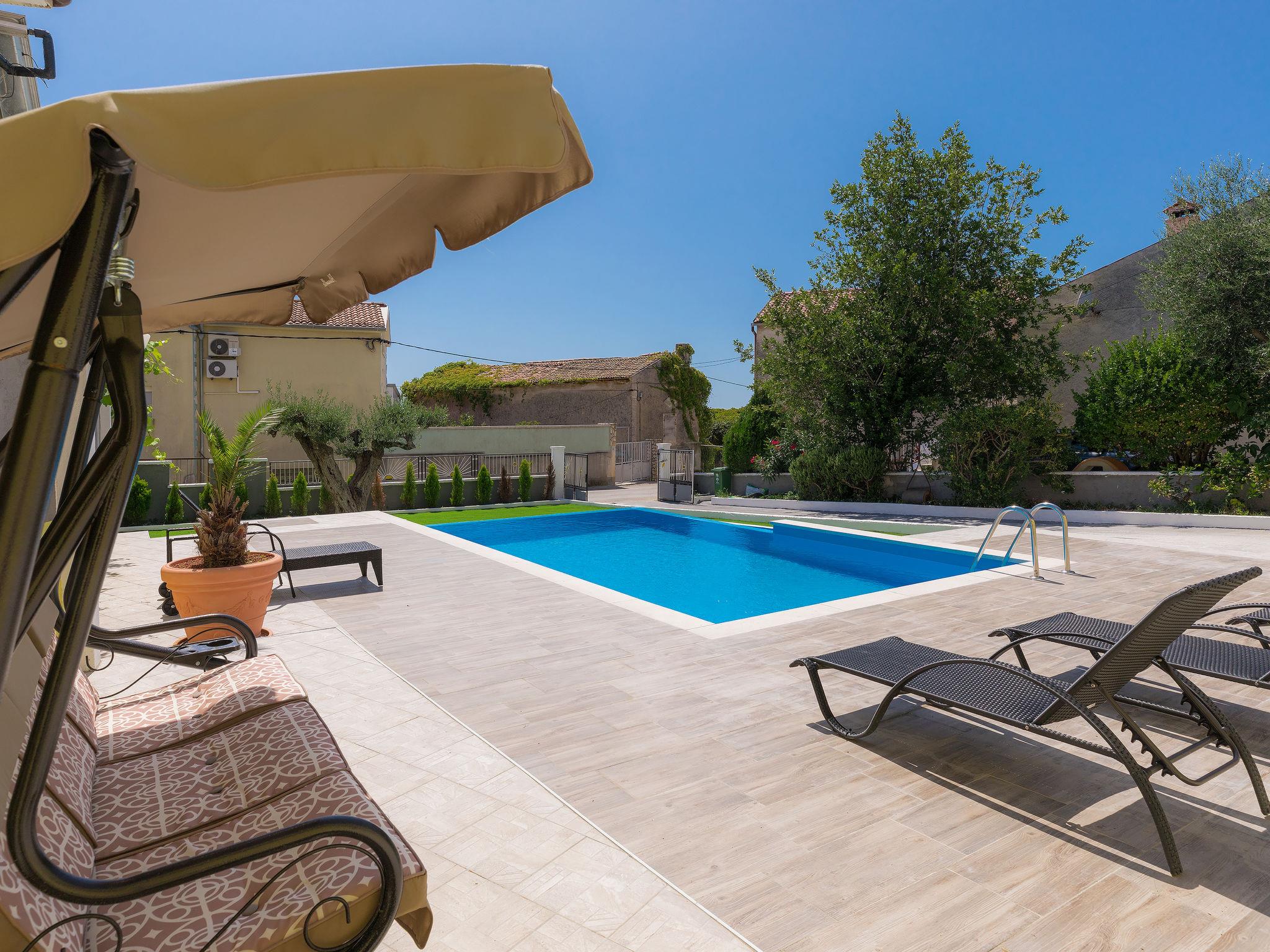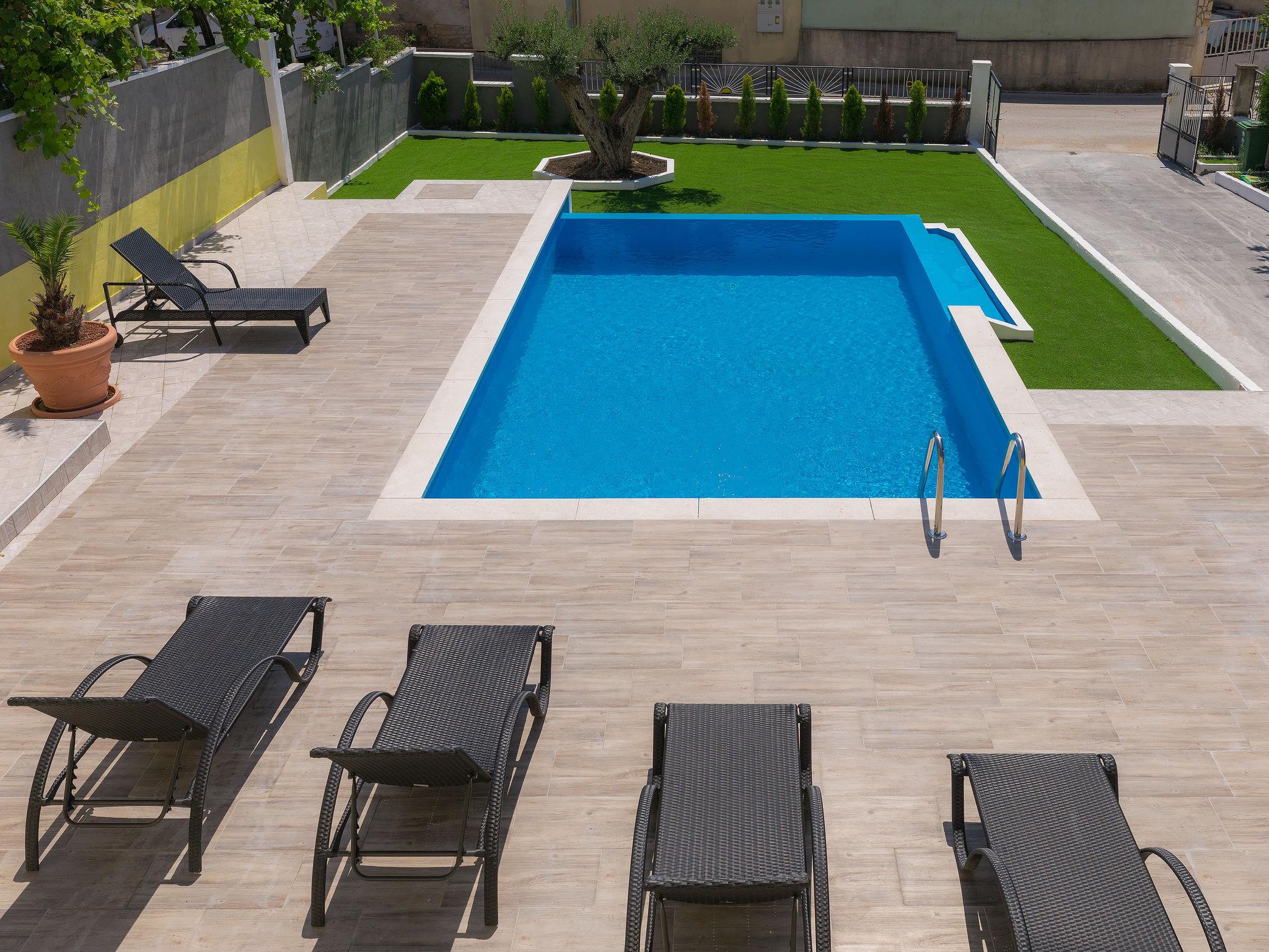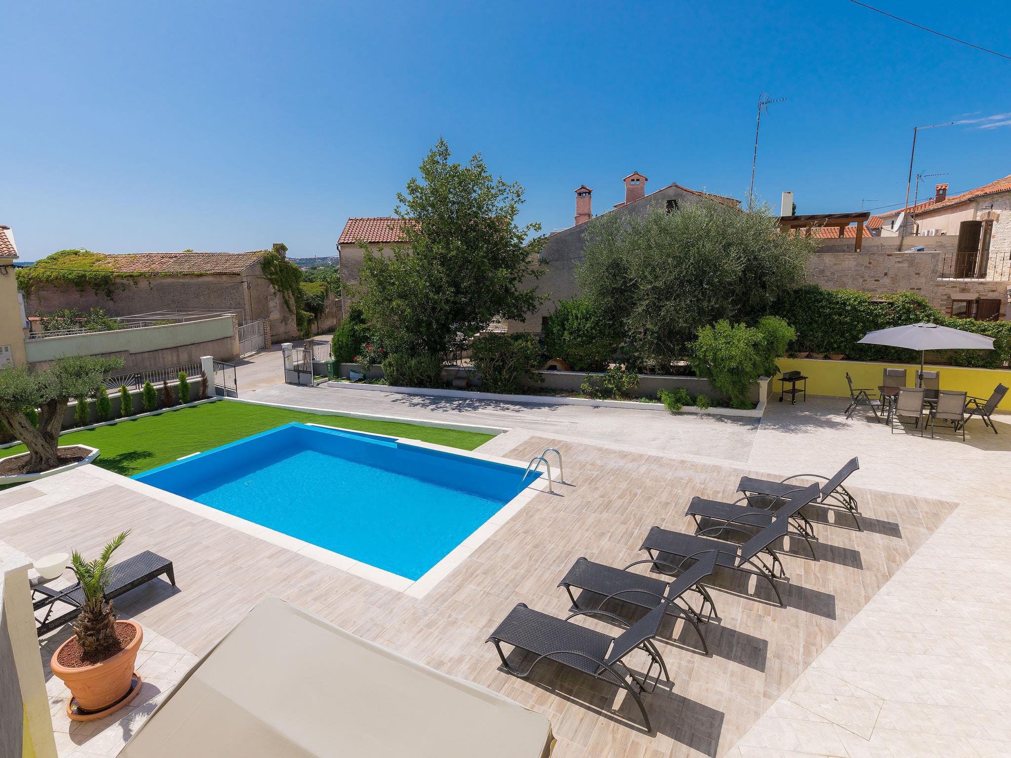 Ližnjan 3 km from Medulin: Terraced house "Evelina", 2 storeys. 200 m from the centre of Ližnjan, in a sunny position, 2 km from the sea, 2 km from the beach. Private: property 280 m2 (fenced), garden with lawn, swimming pool angular (8 x 4 m, depth 150 cm, seasonal availability: 25.Apr. - 26.Oct.). Terrace (30 m2), garden furniture. In the house: internet access, hot tub, washing machine. Parking (for 2 cars) at the house on the premises. Shop 200 m, restaurant 300 m, bus stop 180 m, pebble beach 2 km, rocky beach 2 km. Surf school 2.5 km, riding stable 3 km, sports centre 4.5 km, walking paths from the house 1 km, cycle lane 1 km.