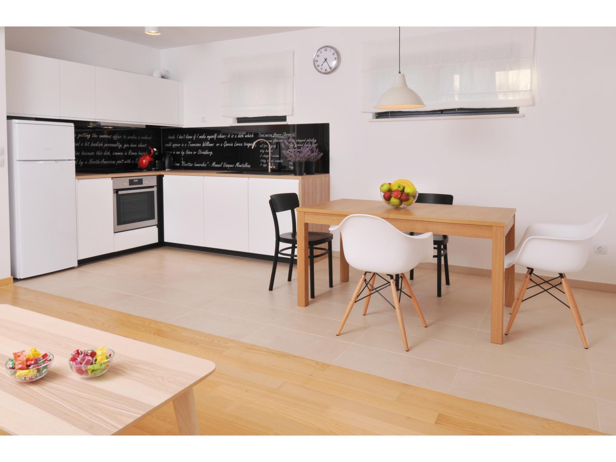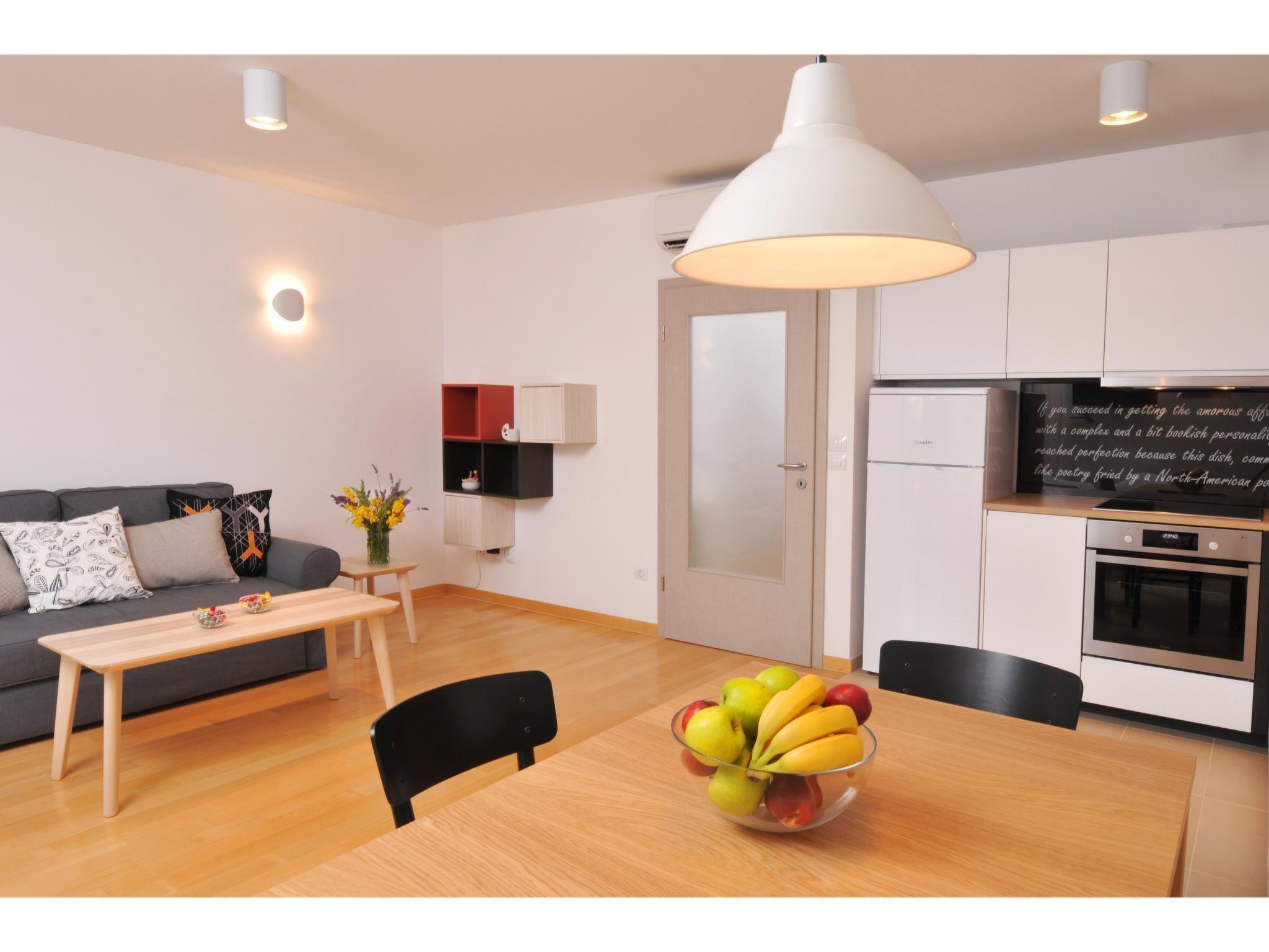 The 57m² apartment is on the ground floor of the house and can accommodate five people comfortably. It disposes of two bedrooms with a double bed (160 x 200cm) in the first bedroom and a single bed (90 x 200cm) in the second. The spacious living room is divided into a modern kitchen, a dining area and a sitting area. The kitchen provides a stove, oven, coffee machine, fridge and dishwasher. The sofa bed (140 x 190cm) in front of the TV is suitable for two people. The living room and the double bedroom have air conditioning. The bathroom contains a shower, sink, toilet and hairdryer,