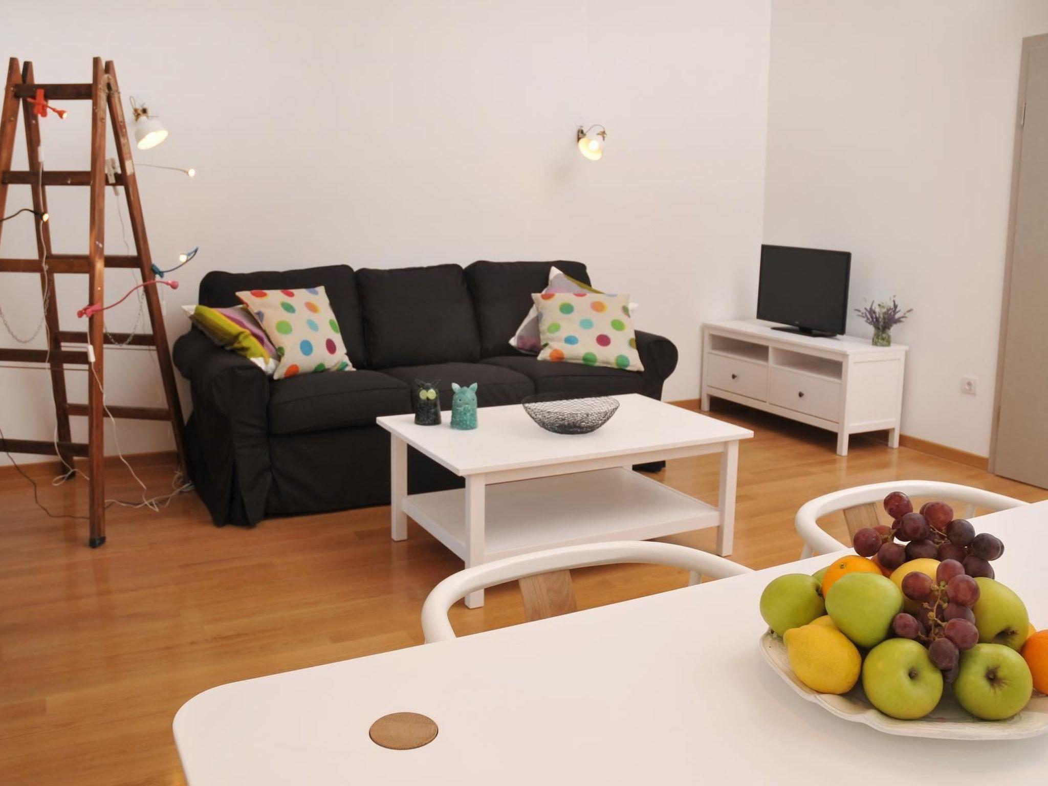 The 57m² apartment is on the second floor of the house and can accommodate five people comfortably. It has a bathroom with a shower, toilet and hairdryer, and two bedrooms with a double bed (160 x 200cm) in the first bedroom and a single bed (90 x 200cm) in the second. The spacious living room is divided into a modern kitchen, a dining area and a sitting area. The kitchen provides a stove, oven, coffee machine, fridge and dishwasher. The sofa bed (140 x 190cm) in front of the TV is suitable for two people. The living room and the double bedroom have air conditioning.