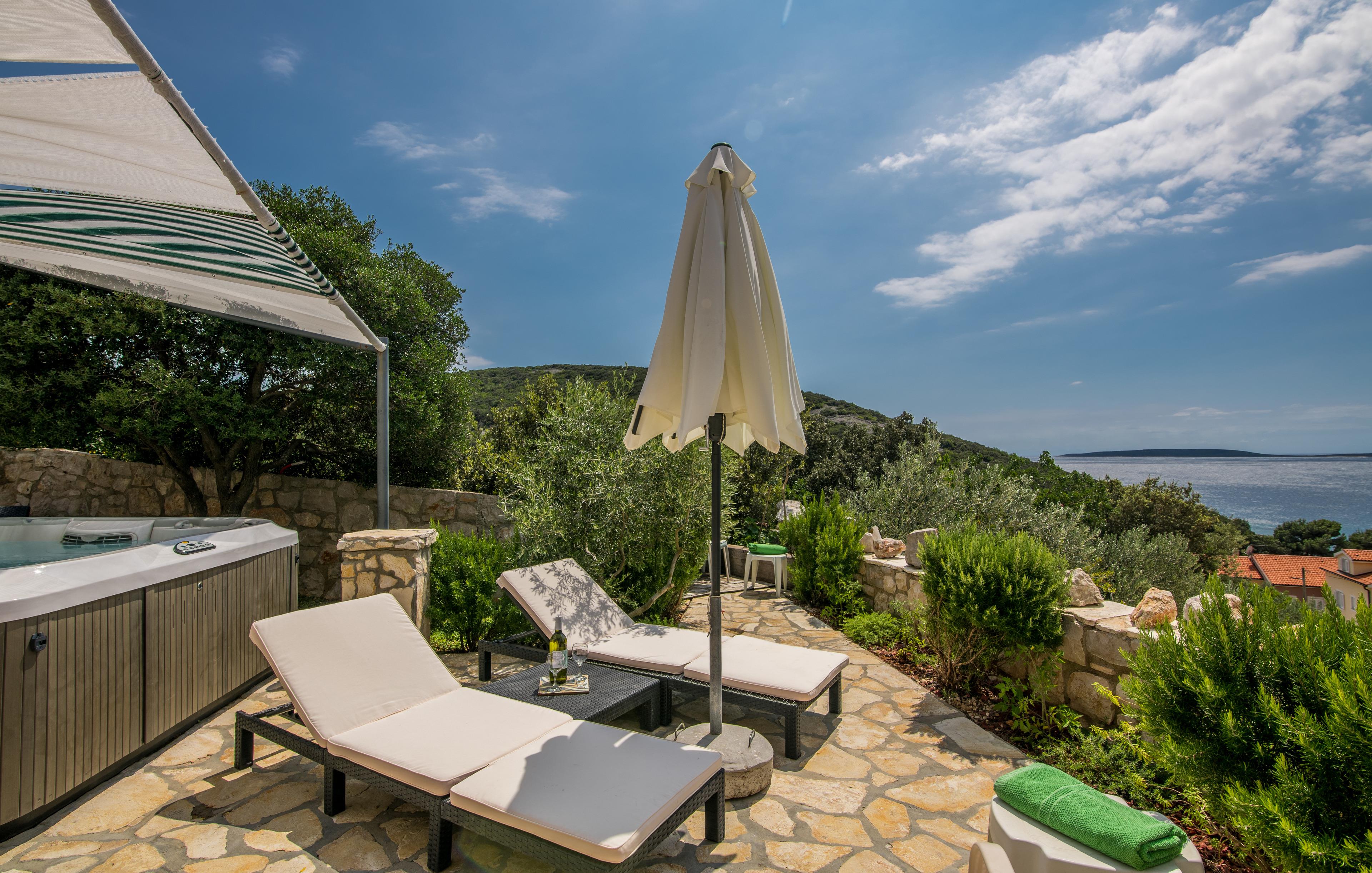Gelegen auf einem privaten Aussichtspunkt in grüner Umgebung, nur drei Minuten vom Strand entfernt mit einer speziellen super abgelegenen Steinterrasse und Jacuzzi unter magischen immergrünen Eiche installiert.