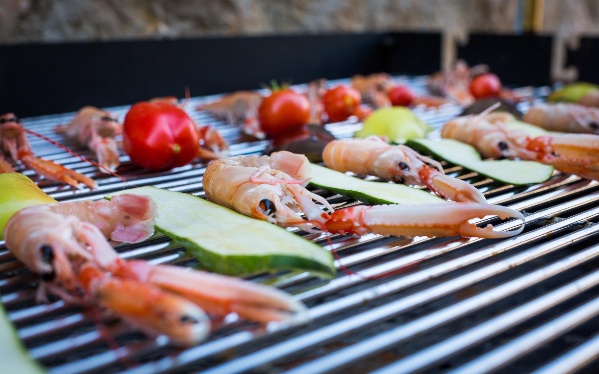 Feuer den Steingrill an und legen darauf frischen Fisch.