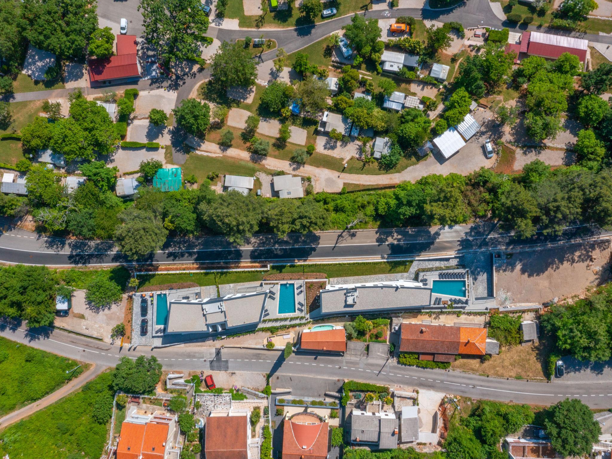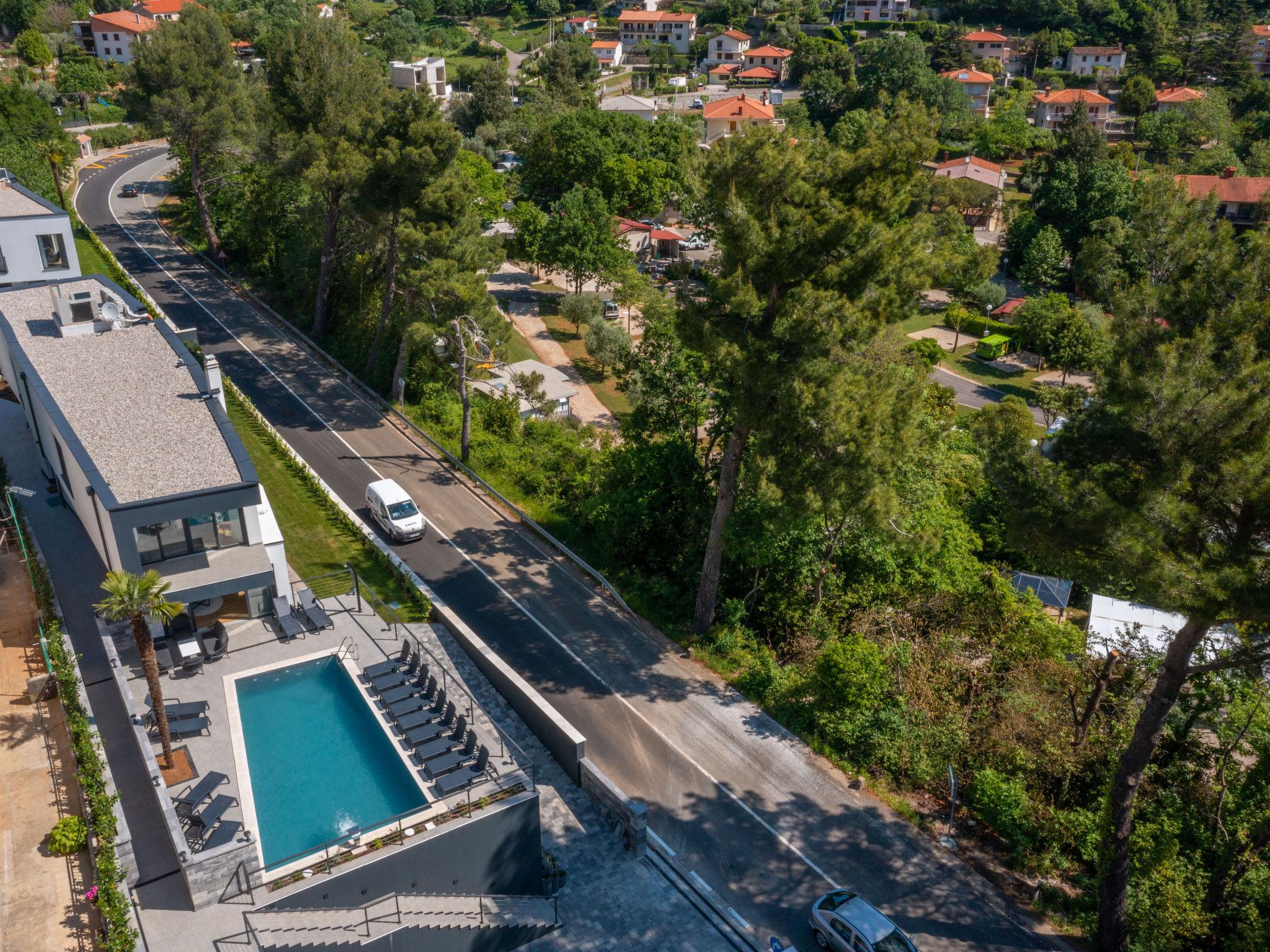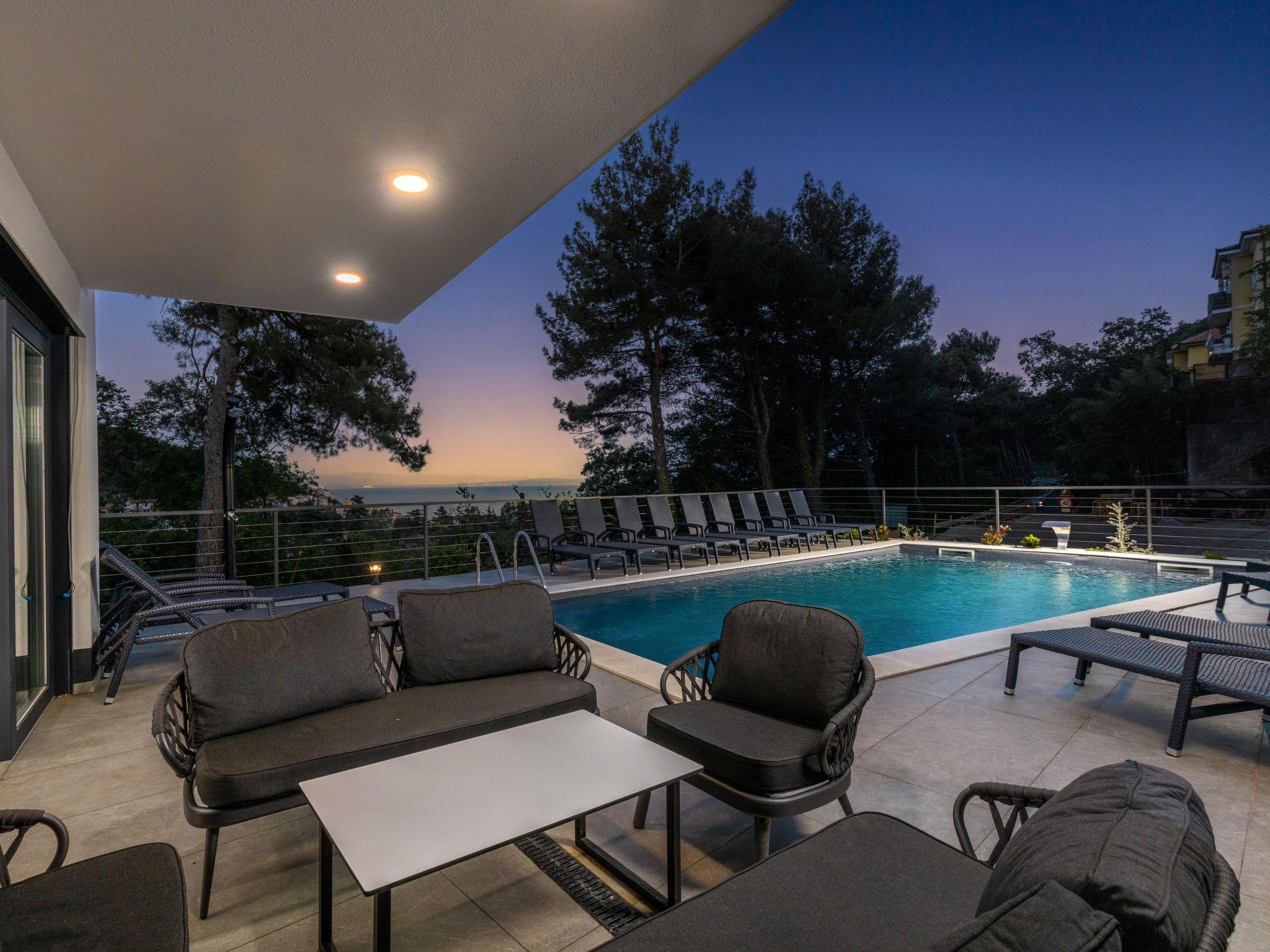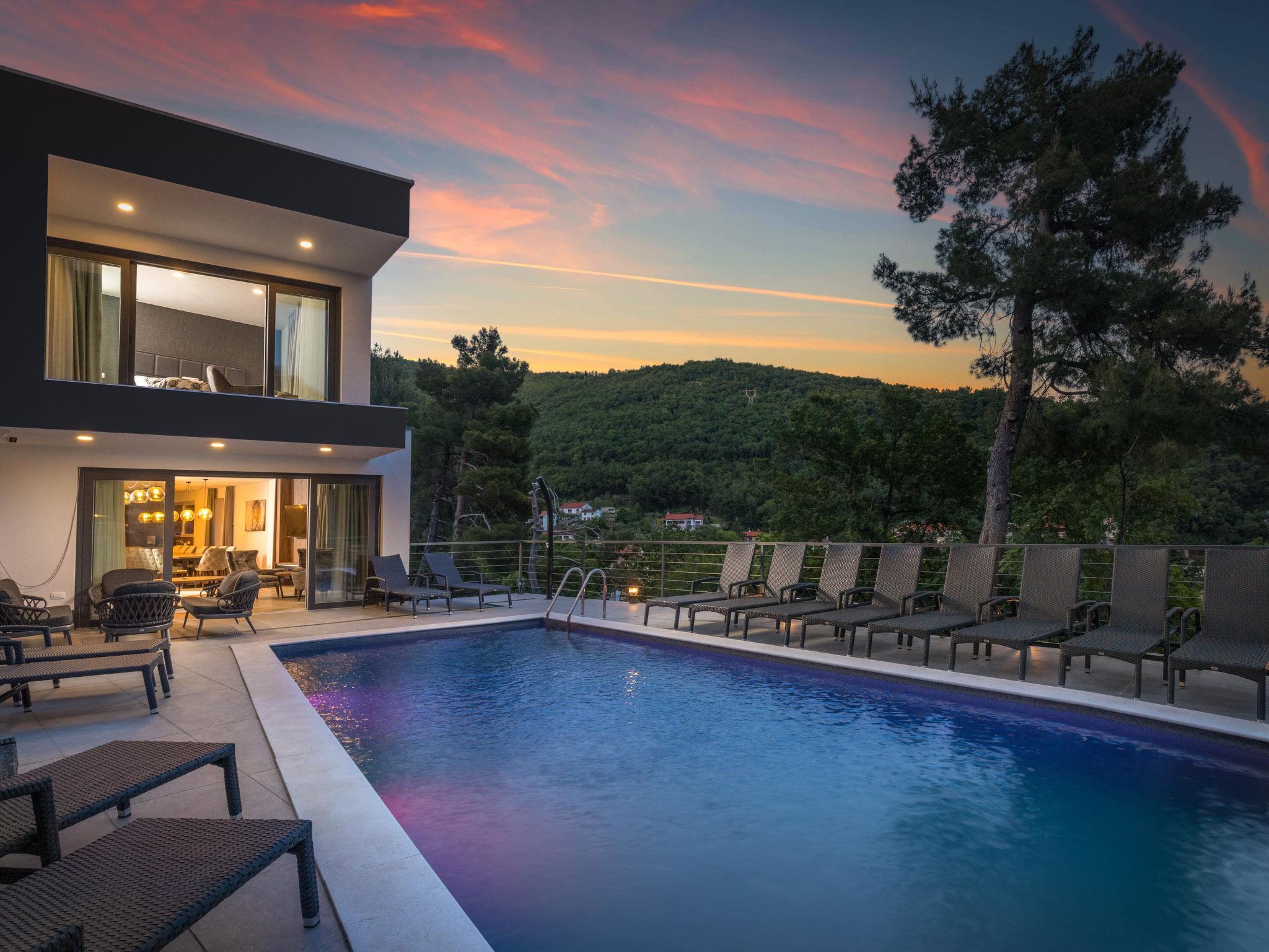 Villa "Visum Mare Tribus", 3 storeys. 500 m from the centre of Mošcenicka Draga, in a sunny position, 700 m from the sea, from the beach. Private: property 1'230 m2 with wildlife garden, swimming pool angular, heated (9 x 4 m, depth 140 cm, seasonal availability: 15.Apr. - 30.Oct.). Outdoor shower. In the house: internet access, sauna, hot tub, central heating system, washing machine, tumble dryer. Parking (for 5 cars) at the house on the premises. Shop, supermarket 650 m, restaurant 100 m, bus stop 70 m, shingle beach, public bathing area 700 m. Swimming pool with counterflow.