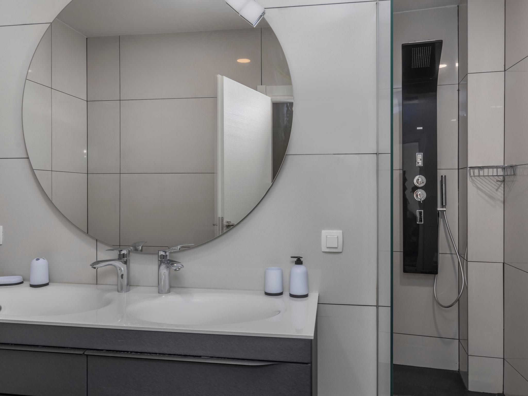 7-room villa 430 m2 on 3 levels. Living/dining room 68 m2 with cable TV and air conditioning. Exit to the terrace. 1 room with 1 french bed (200 cm, length 210 cm), shower/WC, double hand-basin and TV (flat screen), air conditioning. Open kitchen (oven, dishwasher, 4 ceramic glass hob hotplates, kettle, microwave, freezer, electric coffee machine). Sep. WC. On the lower ground floor: 1 room with 1 french bed (200 cm, length 210 cm), shower/WC, double hand-basin and TV (flat screen), air conditioning. Shower/WC. Upper floor: 3 rooms, each room with 1 french bed (200 cm, length 210 cm), shower/WC, double hand-basin and TV (flat screen), air conditioning. 1 room with 1 french bed (200 cm, length 210 cm), shower/WC, double hand-basin and TV (flat screen), air conditioning. Exit to the balcony. Heating, underfloor heating. Balcony 8 m2, terrace 60 m2 partly roofed. Terrace furniture, barbecue electric barbecue, deck chairs. Partial view of the sea. Facilities: safe, iron, children's high chair, baby cot, hair dryer. Internet (WiFi, free).