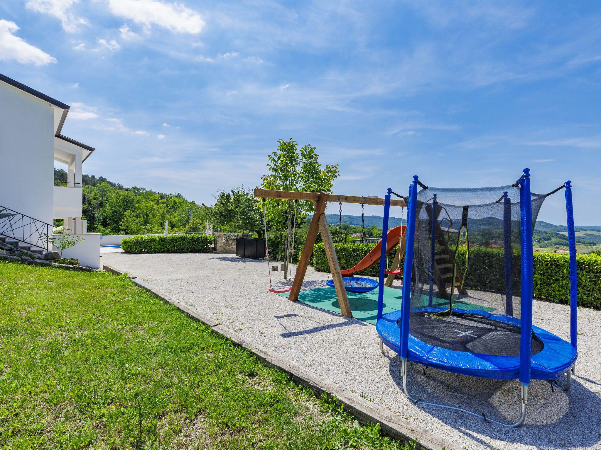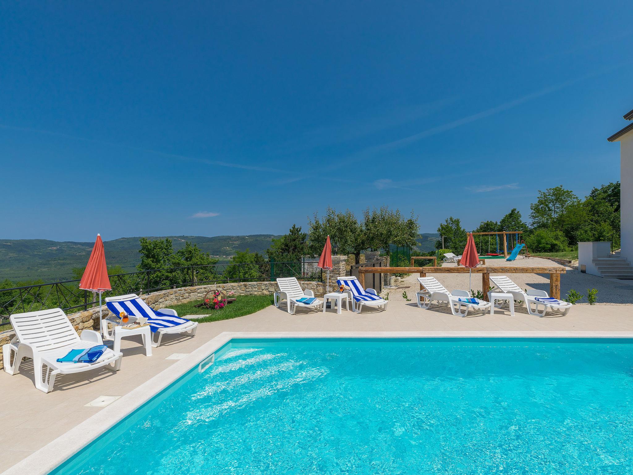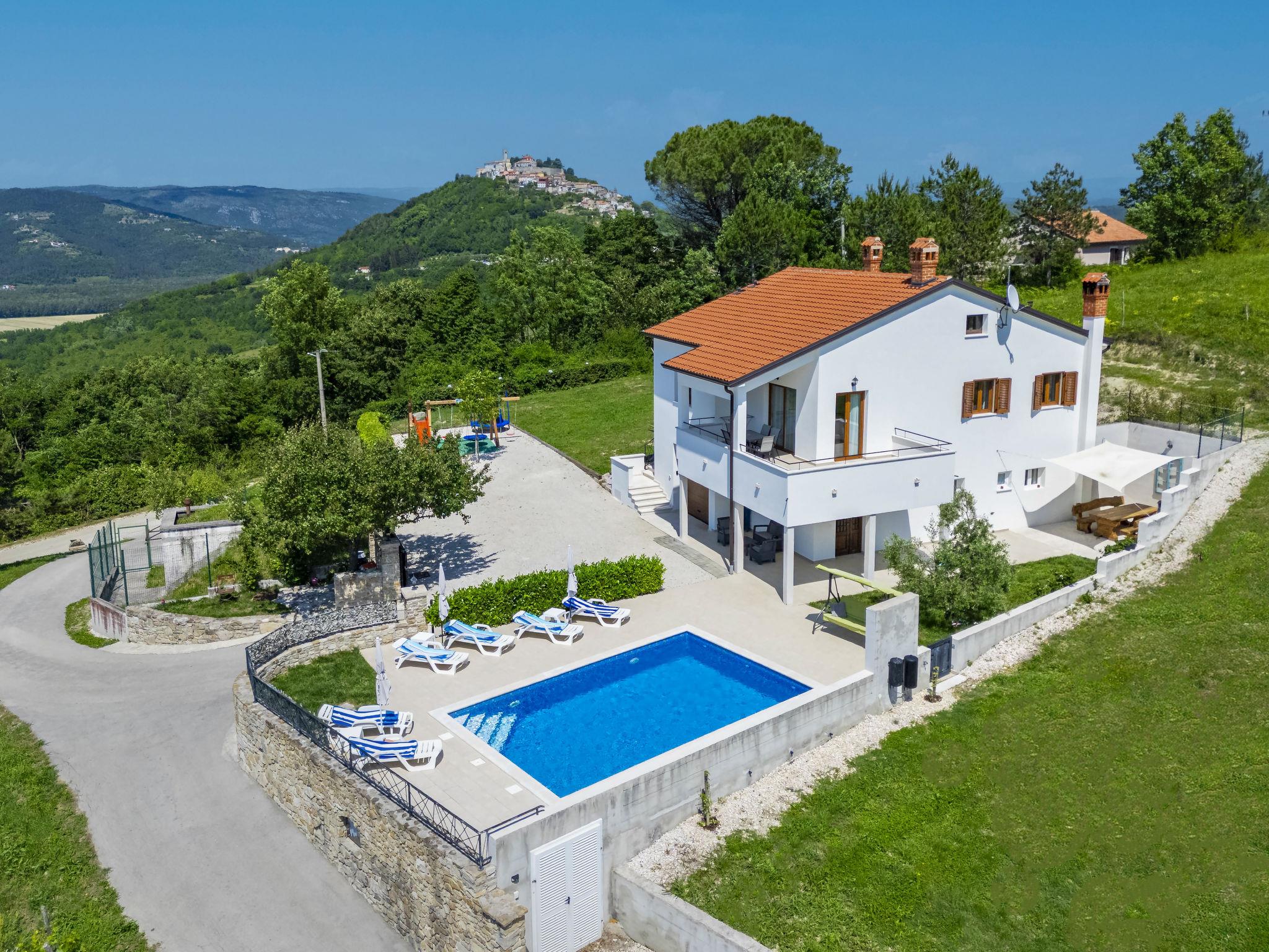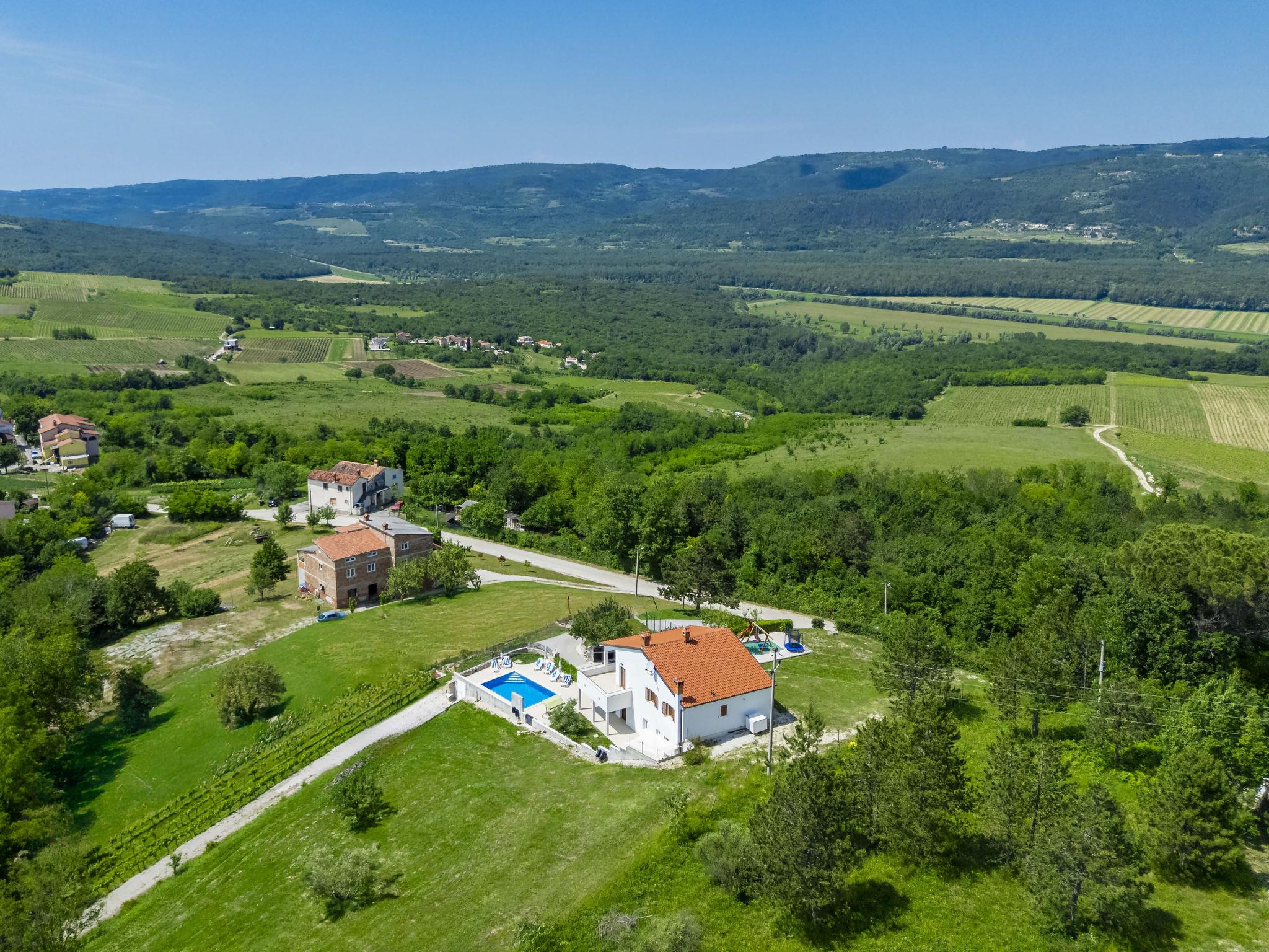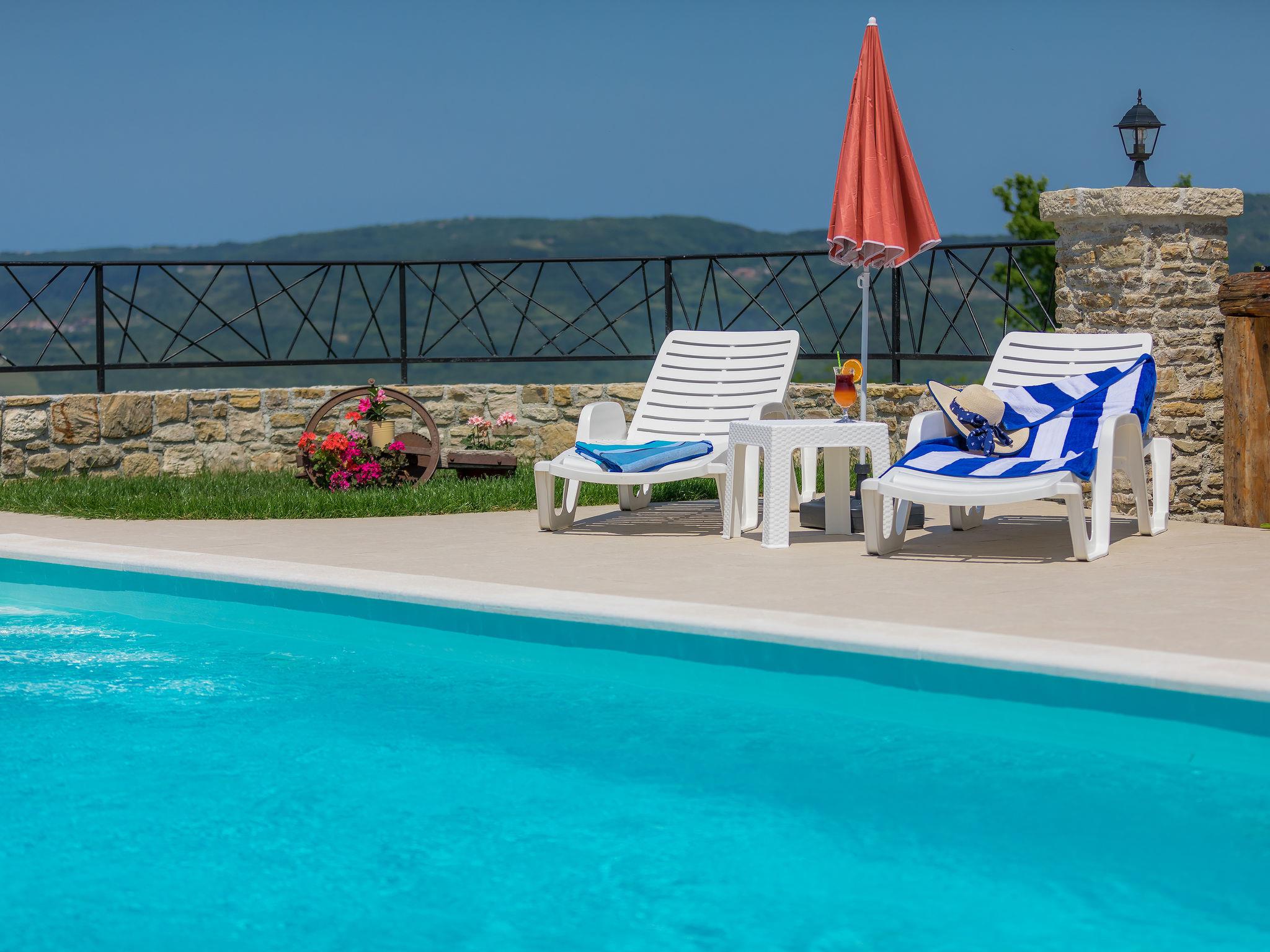 Single-family house "Montebello". In the hamlet Kranceti 2 km from the centre of Motovun, in a quiet, sunny position, 26 km from the sea. Private: property 1'000 m2, garden with lawn, swimming pool angular (7 x 4 m, 33 m2, depth 150 cm, seasonal availability: 01.May. - 30.Sep.) with internal staircase. Outdoor shower, terrace (20 m2), garden furniture, barbecue. In the house: internet access, washing machine. Parking (for 2 cars) at the house on the premises. Shop 2.5 km, restaurant 2.5 km, bus stop 1.1 km, pebble beach 26 km. Walking paths from the house 2.5 km, cycle lane 2.5 km. Nearby attractions: Aquapark 23 km. The owner does not accept any youth groups. Ground floor is closed and not occupied.