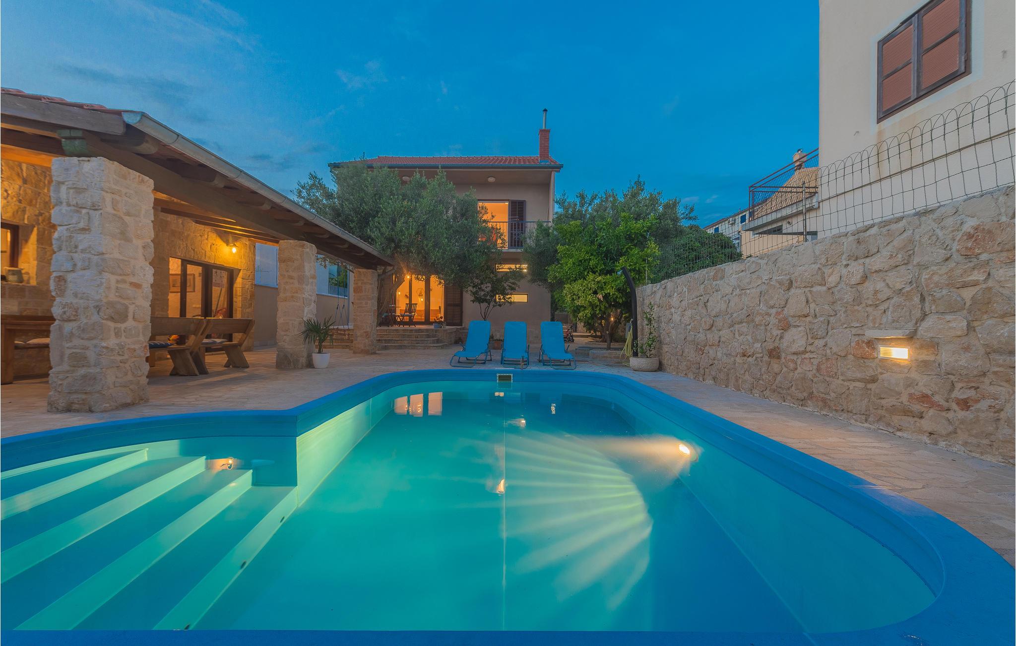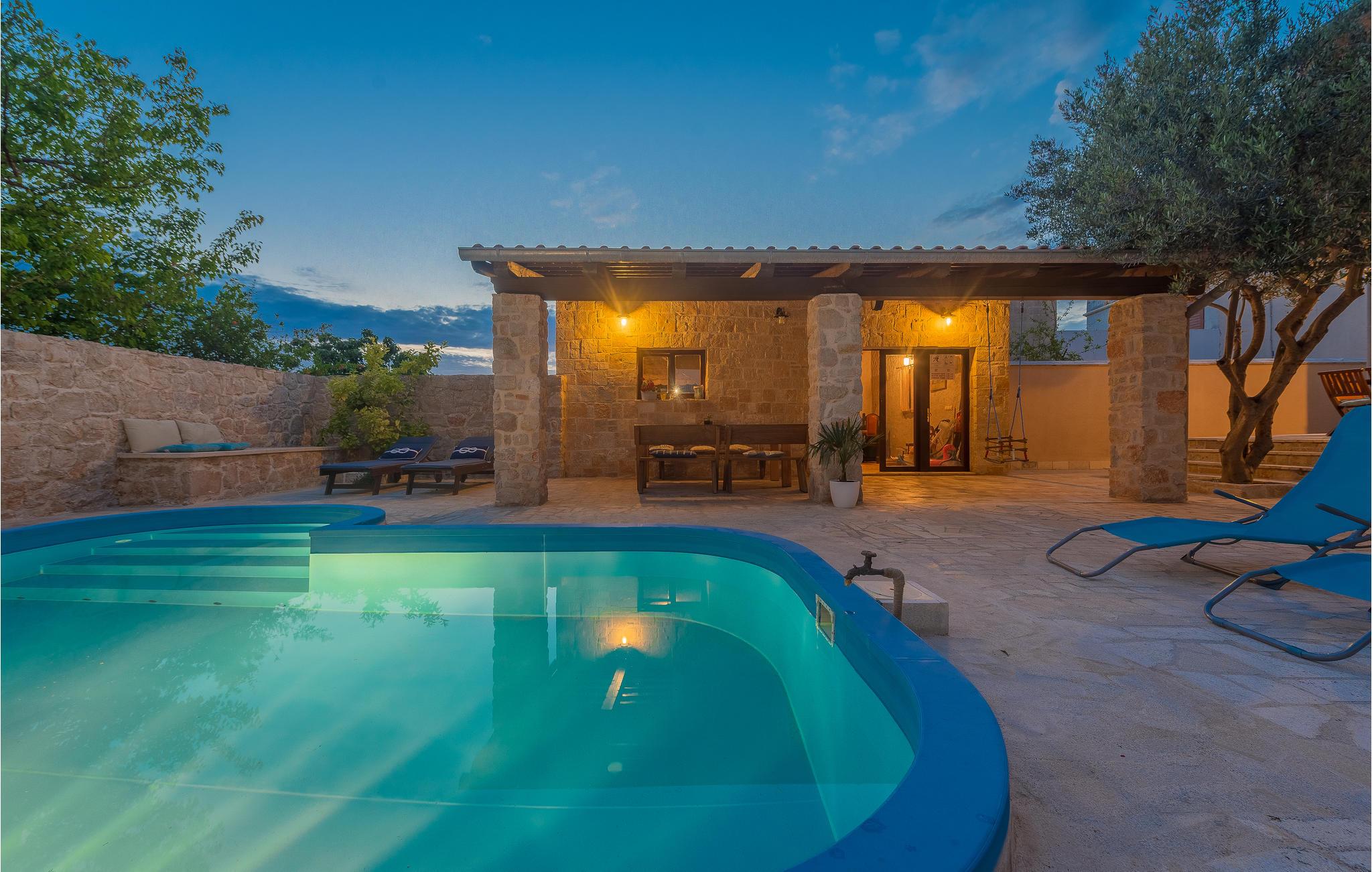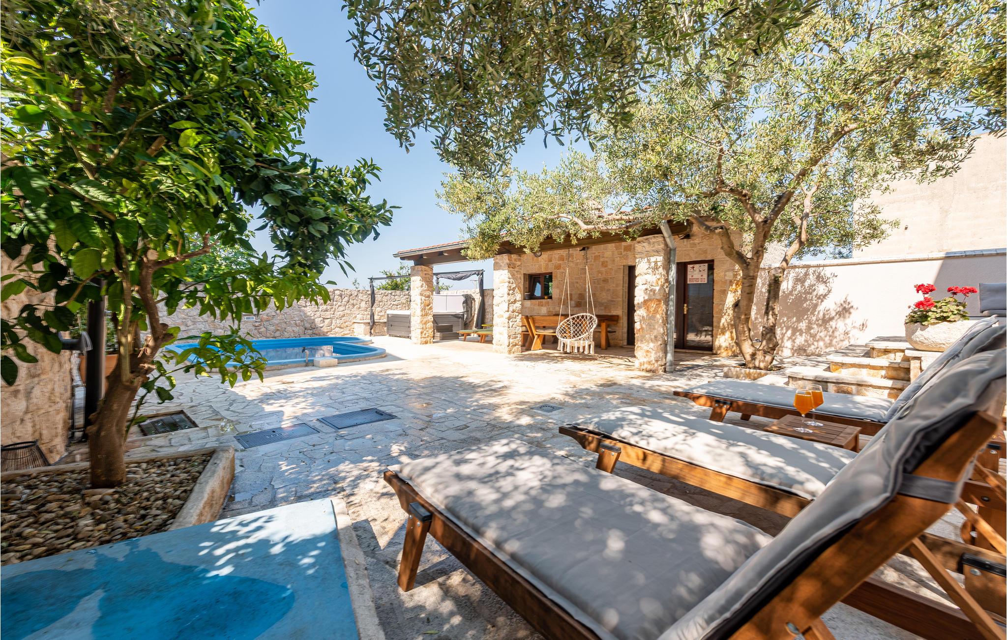 Klimaanlægget er i husets entre. Anlægget afkøler også husets swimmingpool, hvor børnene kan plaske rundt i timevis, dag efter dag, mens I tilbereder lækker mad på grillen, der er tilgængelig. I haven ved siden af grillen er der også et lille udekøkken samt et rum, hvor I kan samles.