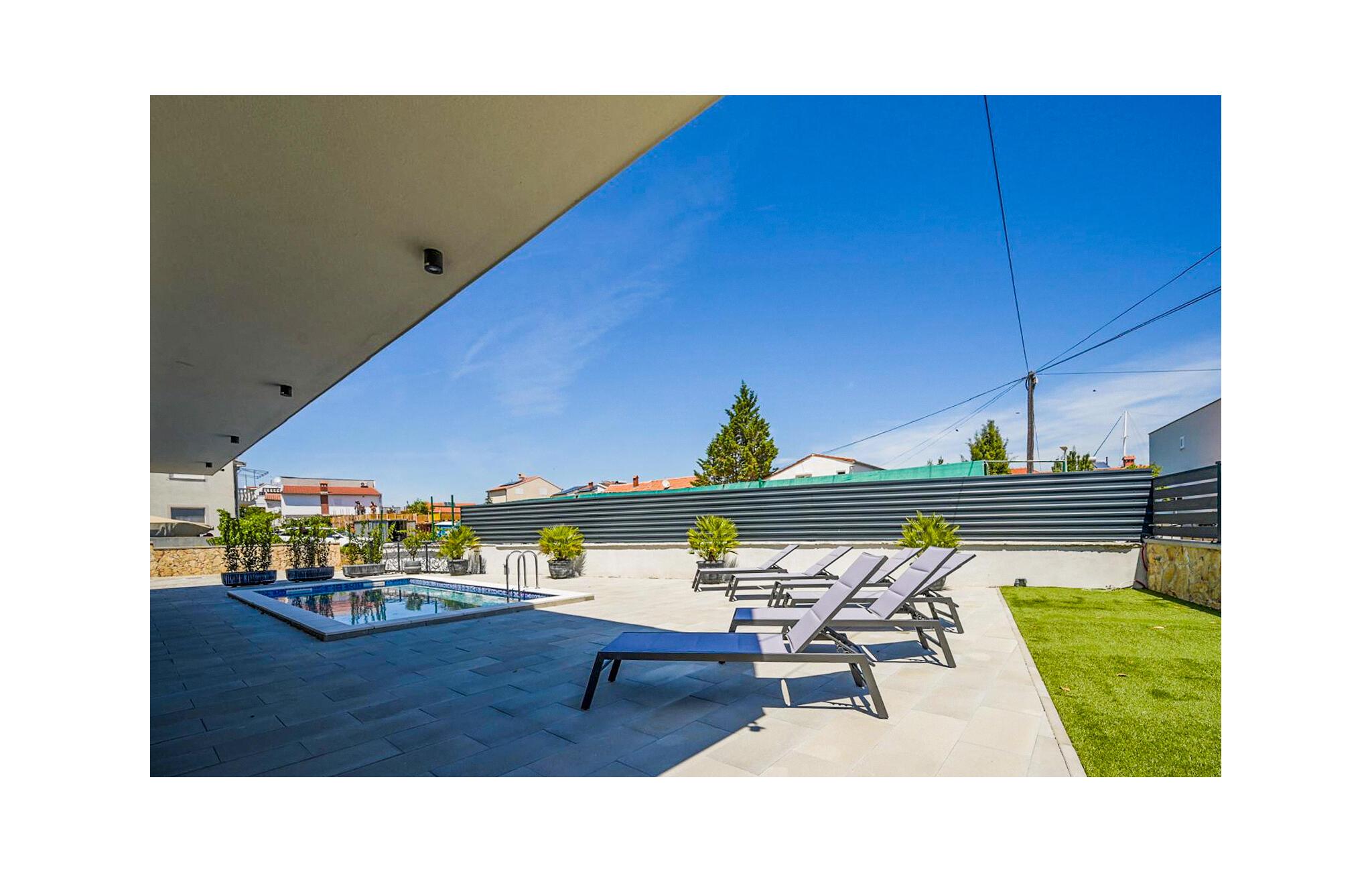 Glæd jer til afslappende solbadning ved jeres smukke pool, genoplad batterierne på de komfortable liggestole og nyd omgængelige aftener med en grillmiddag på den indbydende terrasse.