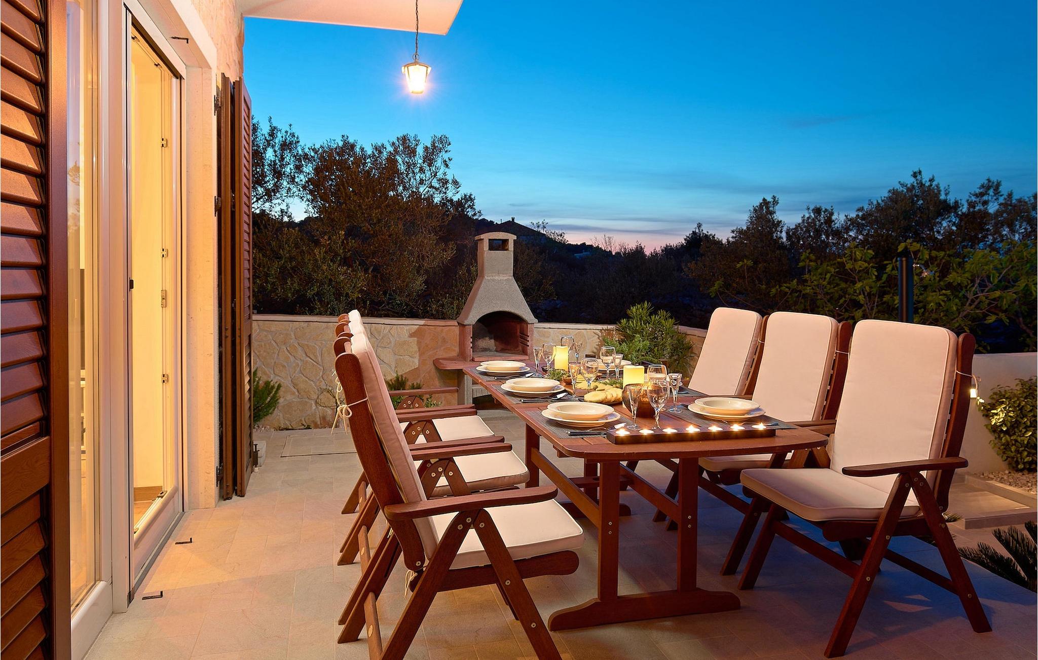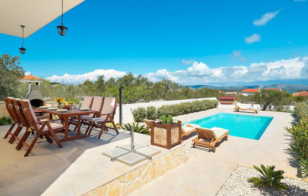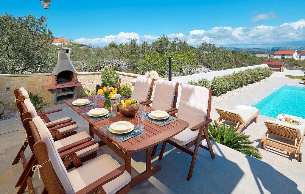 Ihr zweiter Blick wird dem 32m2 großen Pool gelten und Sie werden es kaum erwarten können, sich darin zu erfrischen! Die überdachte Terrasse mit großem Esstisch für bis zu 8 Personen ist perfekt für gemeinsame Sommerabende und das ein oder andere Grillen mit Freunden und Familie. Sie sollten unbedingt frischen Fisch zubereiten und ihn gegrillt mit etwas lokalem Olivenöl servieren. Schmecken Sie Dalmatien!