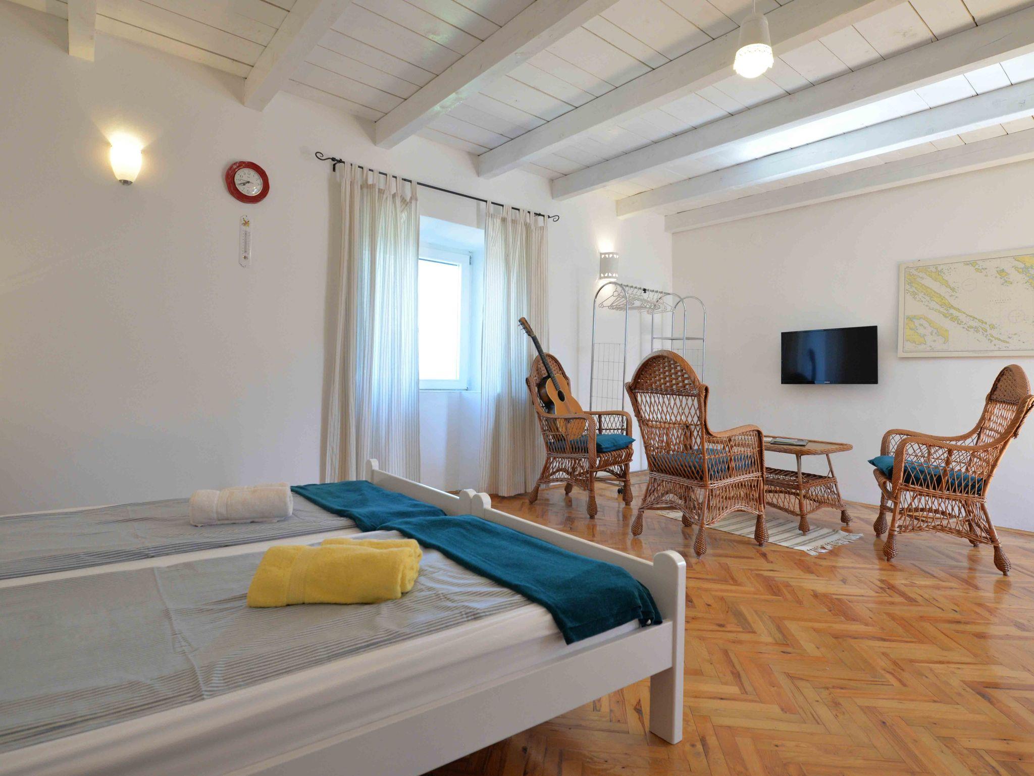 Haus bietet Platz für 5 Gäste. Die Betten sind in Schlafzimmern, die es 2 gibt, innerhalb einer Gesamtfläche von 77m2, angeordnet. Die Gäste haben eine eigene Terrasse zur Verfügung, auf der sie in warmen Sommernächten genießen können. Für vollen Genuss und Entspannung gibt es einen privaten Grill für Gäste dieser Unterkunft. IM PREIS INBEGRIFFEN: Kurtaxe, Endreinigung, Klimatisierung, Parkplatz, Internet, Zusatzbett, Bügeleisen, Bügelbrett, Föhn. Die Verfügbarkeit zusätzlicher Dienstleistungen in Ihrem reservierten Termin und die Preise derselben (falls nicht aufgeführt) müssen im Voraus überprüft werden. Zusätzliche Dienstleistungen die in der Zahlungsaufforderung nicht aufgeführt sind werden direkt beim Vermieter bezahlt, angenommen der Gast nutzt auch diese. Ermäßigung auf den Grundpreis: Gratistag 14=13 (bei einem Aufenthalt von 14 Tagen oder mehr erhalten Sie einen Gratistag für den Aufenthalt bis 31.12.26).