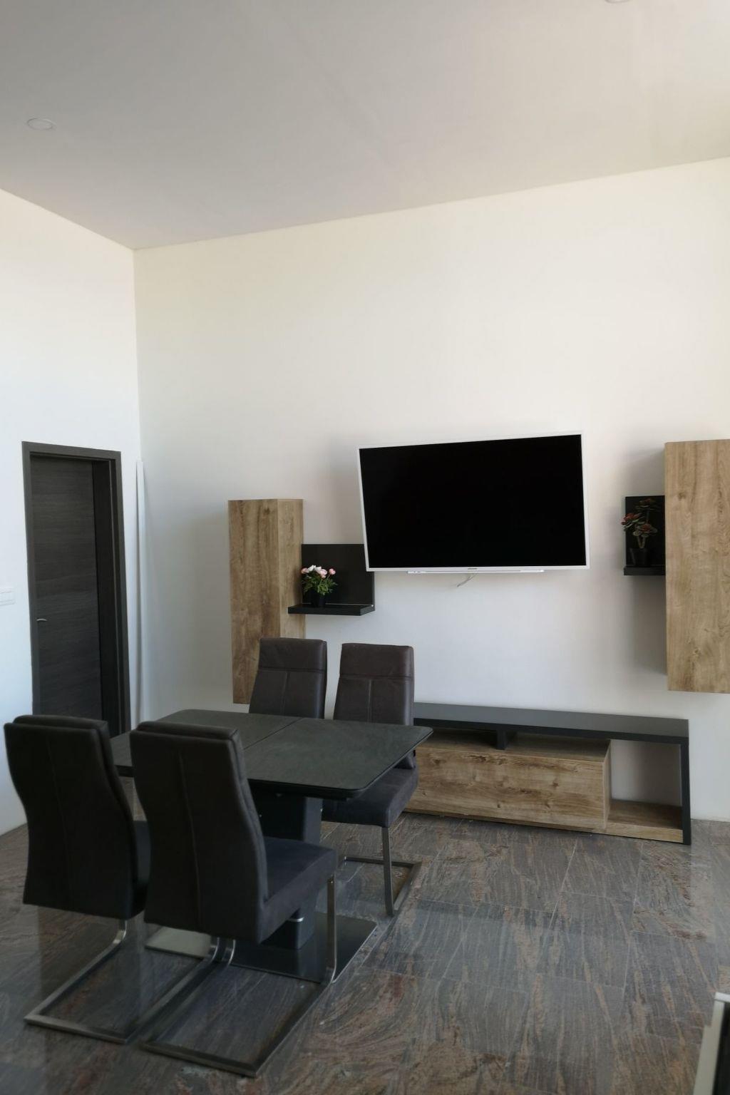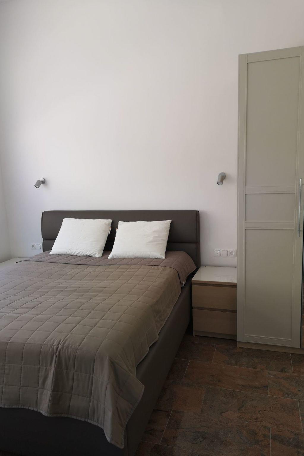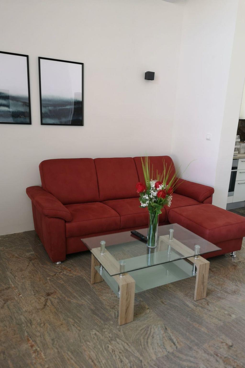 The holiday flat is on the ground floor of the three-storey house. It offers a large living and dining area with an additional double bed, a fully equipped kitchen, a large bedroom with a king-size bed, a bathroom with shower/WC, a TV and air conditioning. Towels for the flat are included. There is also free WiFi internet access.