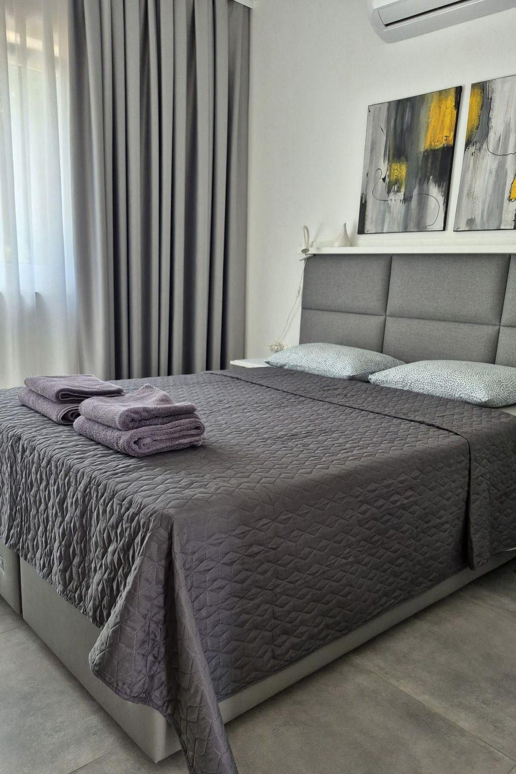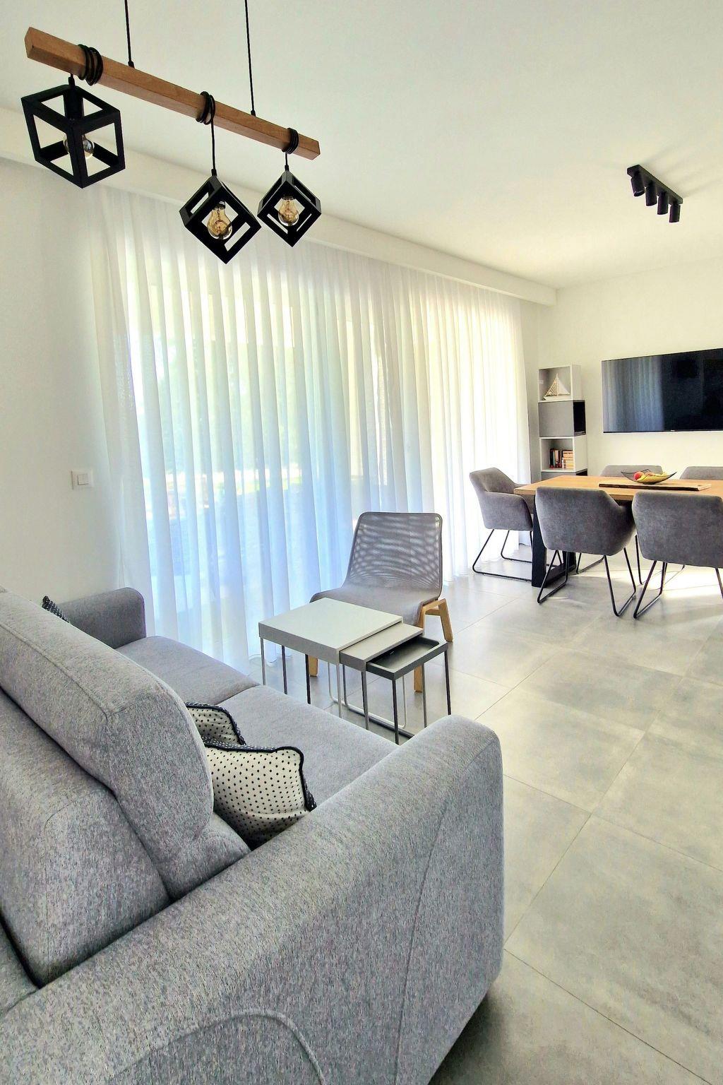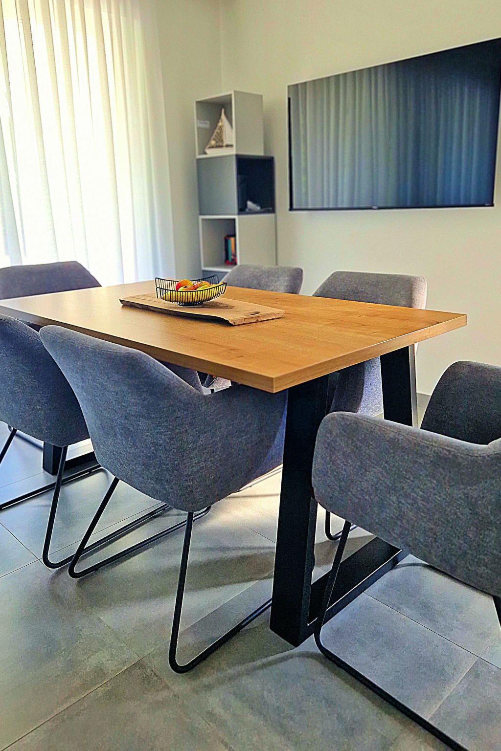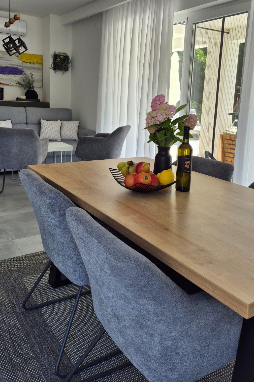 Inside, the villa impresses with high-quality furnishings that leave nothing to be desired. It sleeps up to 8 people comfortably in three bedrooms, each with its own bathroom and private terrace, as well as two additional beds on a sofa bed in the living room. The fully equipped kitchen, air conditioning in all rooms, free Wi-Fi and satellite TV ensure your comfort at all times.