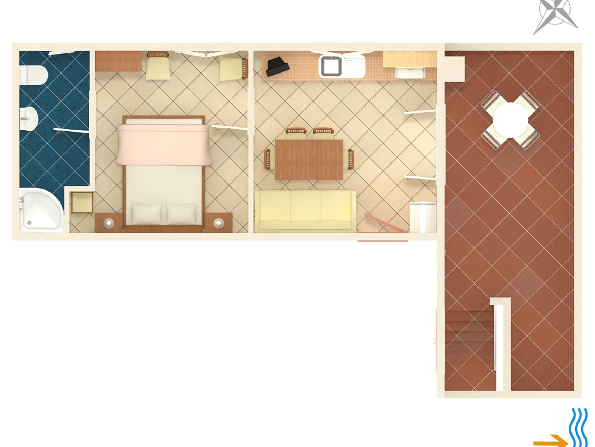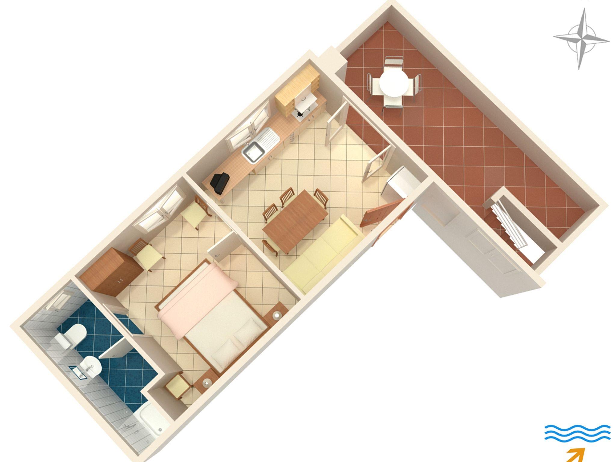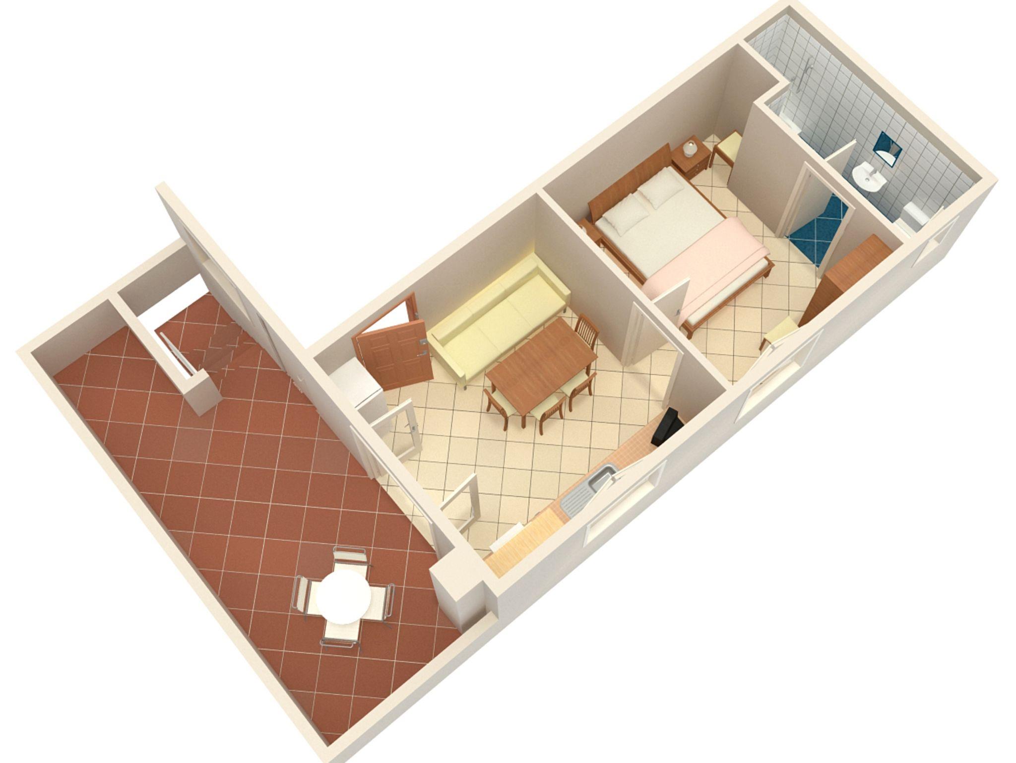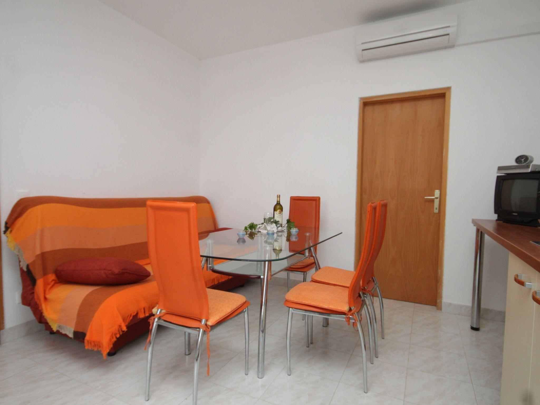 Ferienwohnung bietet Platz für 3 Gäste. Die Betten sind in Schlafzimmern, die es 1 gibt, und in Esszimmer, innerhalb einer Gesamtfläche von 27m2, angeordnet. Die Gäste haben eine eigene Terrasse zur Verfügung, auf der sie in warmen Sommernächten genießen können. Das Apartment bietet Meerblick. Es ist erlaubt, Speisen auf dem Gemeinschafts-Grill vorzubereiten. IM PREIS INBEGRIFFEN: Kurtaxe, Endreinigung, Klimatisierung, Parkplatz, Internet, Bügeleisen, Bügelbrett, Föhn, tragbarer Grill, Sonnenschirm. VERBINDLICHE ZUSÄTZLICHE KOSTEN: Aufzahlung für Kurzaufenthalte (prozentualer Zuschlag pro Nächtigungsanzahl: 30% - 1, 20% - 2, 10% - 3). Die Verfügbarkeit zusätzlicher Dienstleistungen in Ihrem reservierten Termin und die Preise derselben (falls nicht aufgeführt) müssen im Voraus überprüft werden. Zusätzliche Dienstleistungen die in der Zahlungsaufforderung nicht aufgeführt sind werden direkt beim Vermieter bezahlt, angenommen der Gast nutzt auch diese. Ermäßigung auf den Grundpreis: Gratistag 14=13 (bei einem Aufenthalt von 14 Tagen oder mehr erhalten Sie einen Gratistag für den Aufenthalt bis 31.12.26).