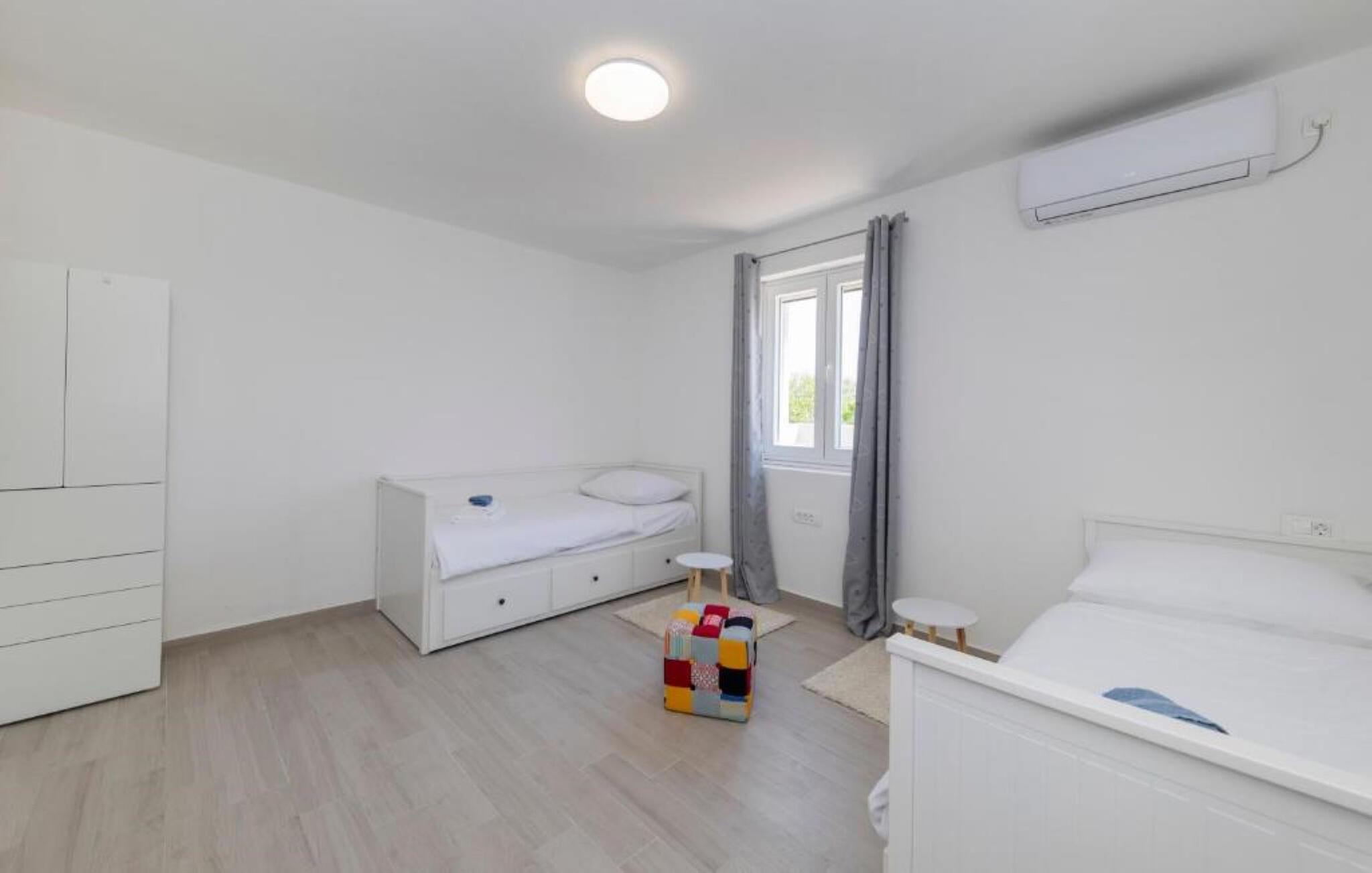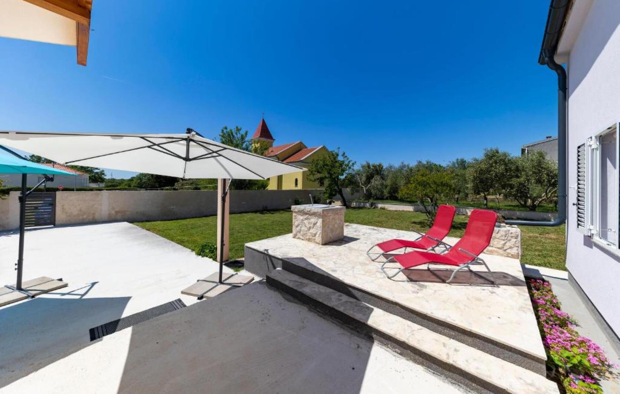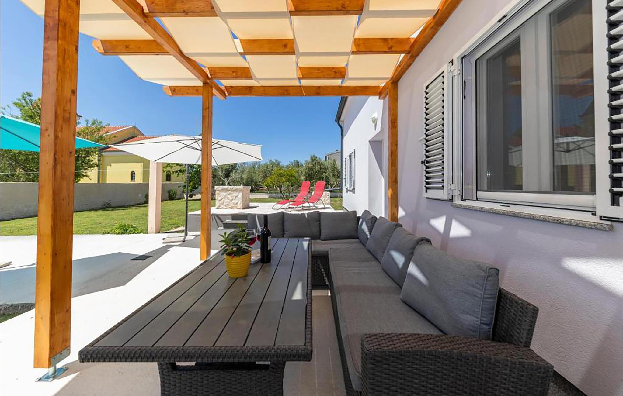 Nyd en afslappende ferie i dette feriehus i rolige omgivelser nær havet. Slap af fra hverdagen og genoplad batterierne i dette lyse og indbydende hus. Moderne møbler i diskrete farver skaber en rolig atmosfære. Tilbered jeres måltider i det komfortable køkken og nyd dem sammen ved spisebordet med en god flaske vin. Slap af med en bog eller tilbring hyggelige aftener med at spille spil. Start jeres morgen med en let morgenmad og en kop friskbrygget kaffe på den rummelige terrasse. Slap af med en god samtale på den komfortable gyngebænk eller planlæg aktiviteter for den næste dag. Saml jeres medrejsende til en grillfest og afslut dagen på en afslappet måde. Tag en tur til havet og nyd de fine sandstrande omkring Nin, ideelle til svømning, slentreture og bygning af sandslotte. Oplev den historiske gamle bydel i Nin med dens charmerende gyder, verdens mindste katedral og de berømte helbredende muddermarker. Nyd cykelture gennem det rolige landskab i Zerava eller besøg lokale vingårde og olivenlunde. Afslut dagen med en stemningsfuld solnedgang ved lagunen, ledsaget af regionale delikatesser og et glas dalmatisk vin.