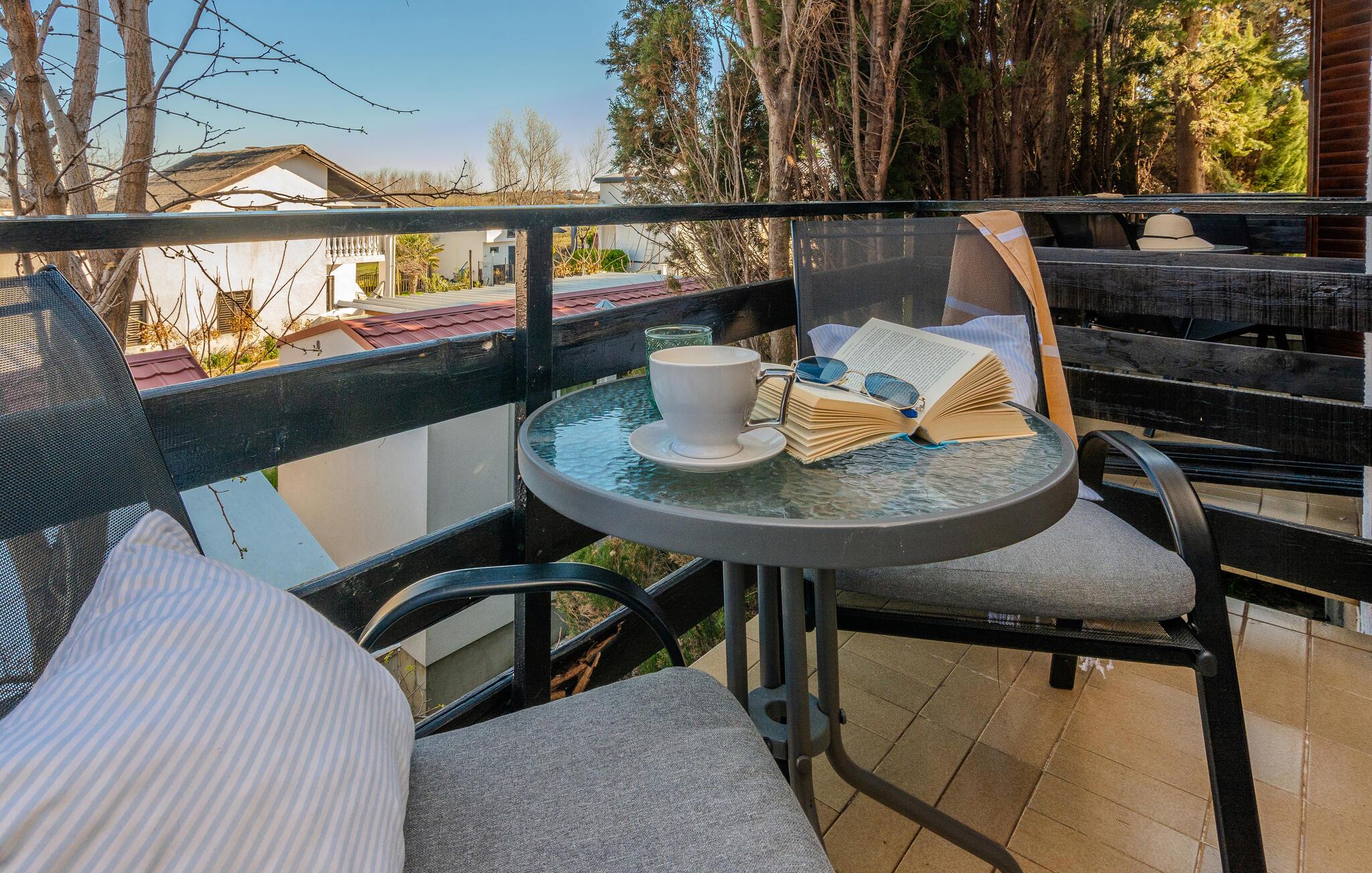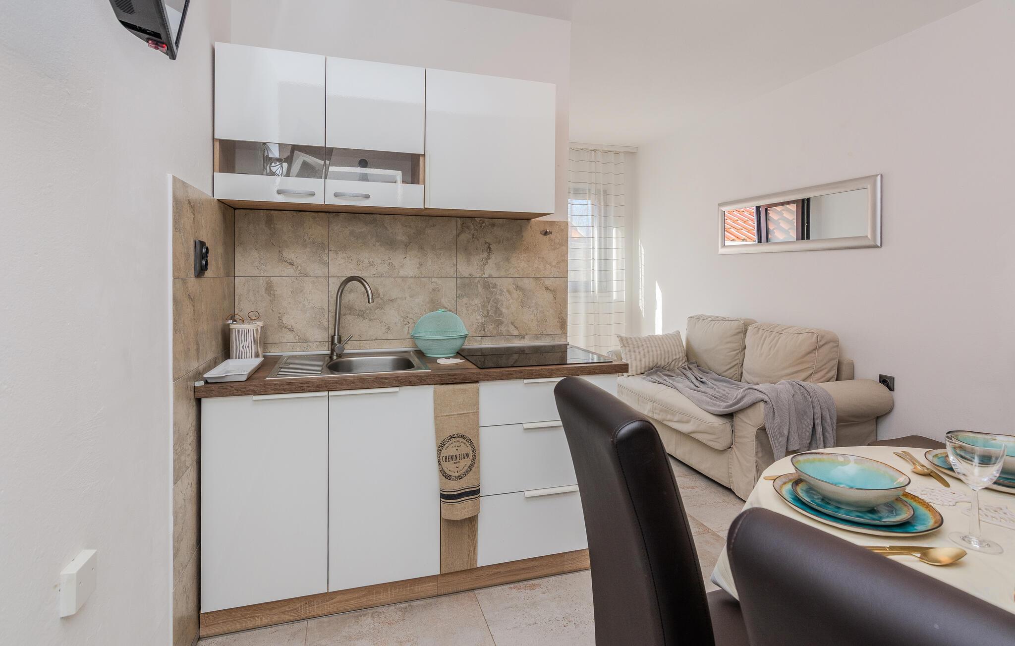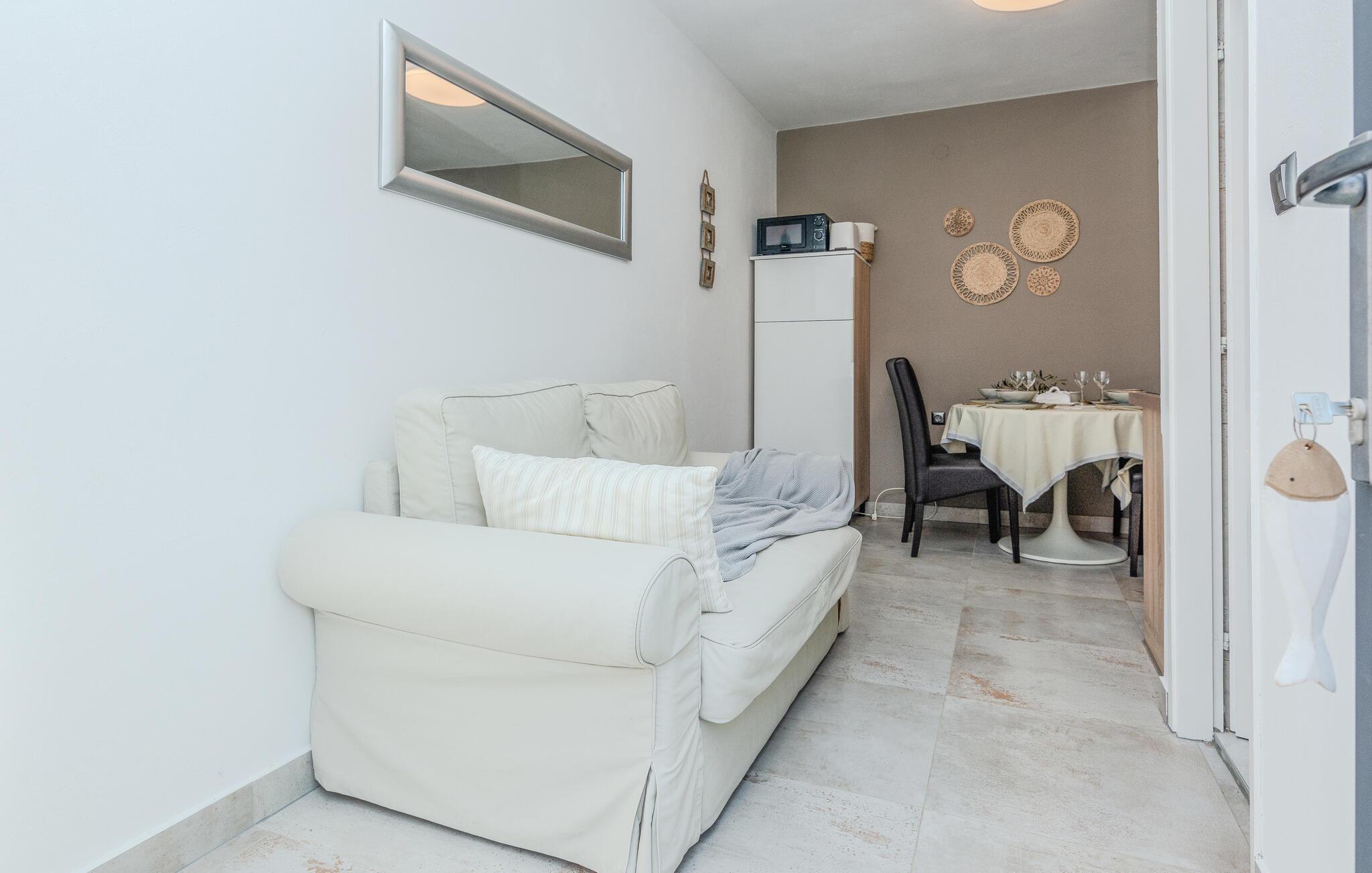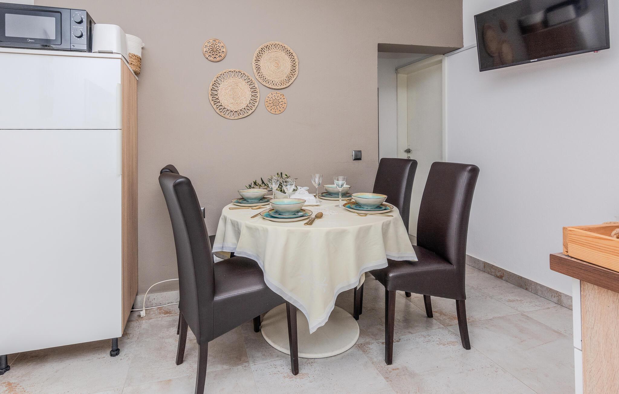 Velkommen til denne moderne og komfortable ferielejlighed, som lægger op til en harmonisk pause ikke langt fra smukke strande. Tilbered jeres måltider i det åbne køkken og sæt jer ved det stilfulde spisebord. Slap af på den komfortable sofa med en god bog eller en hyggelig filmaften, mens den harmoniske indretning sikrer øjeblikke af velvære.