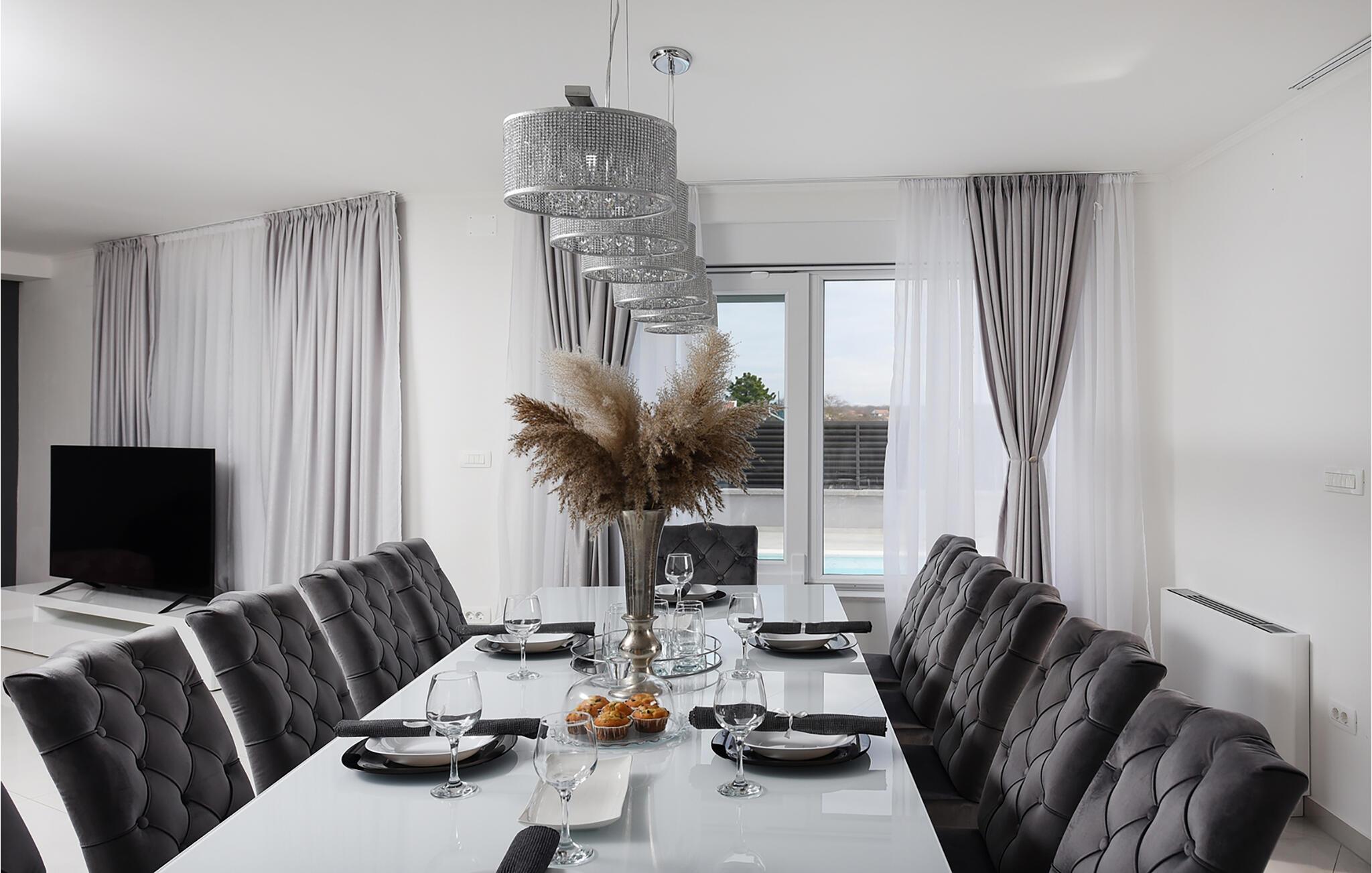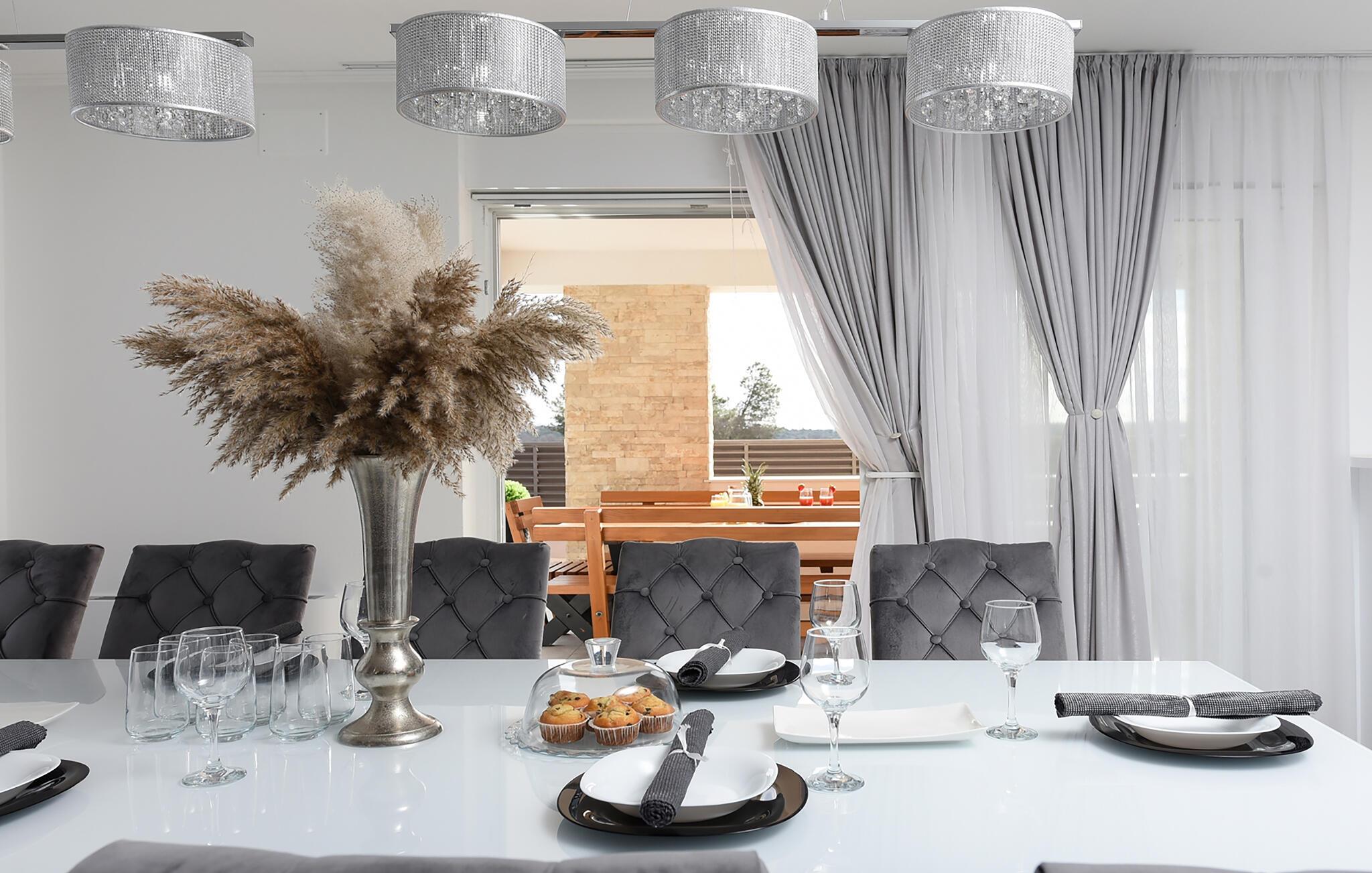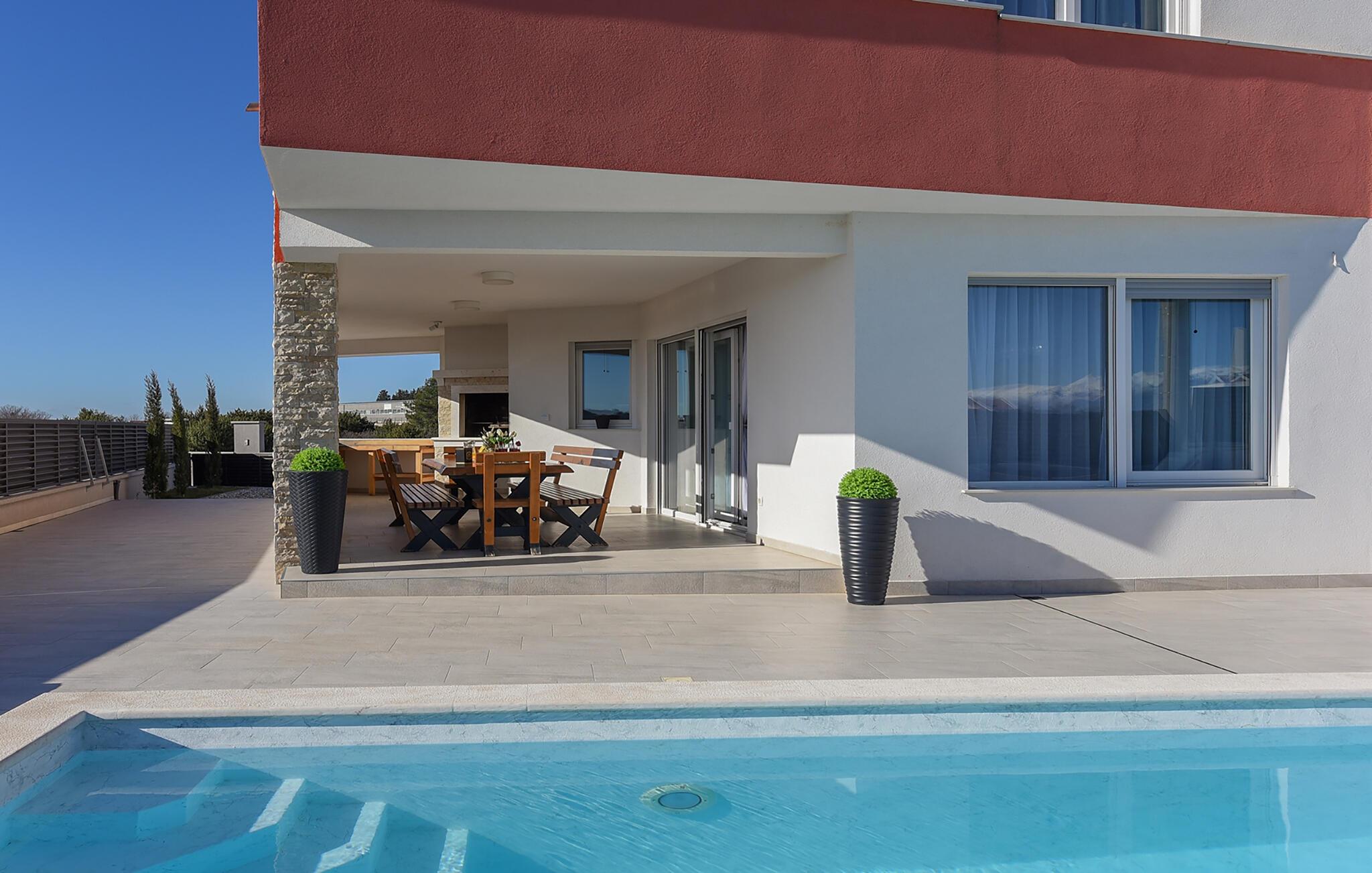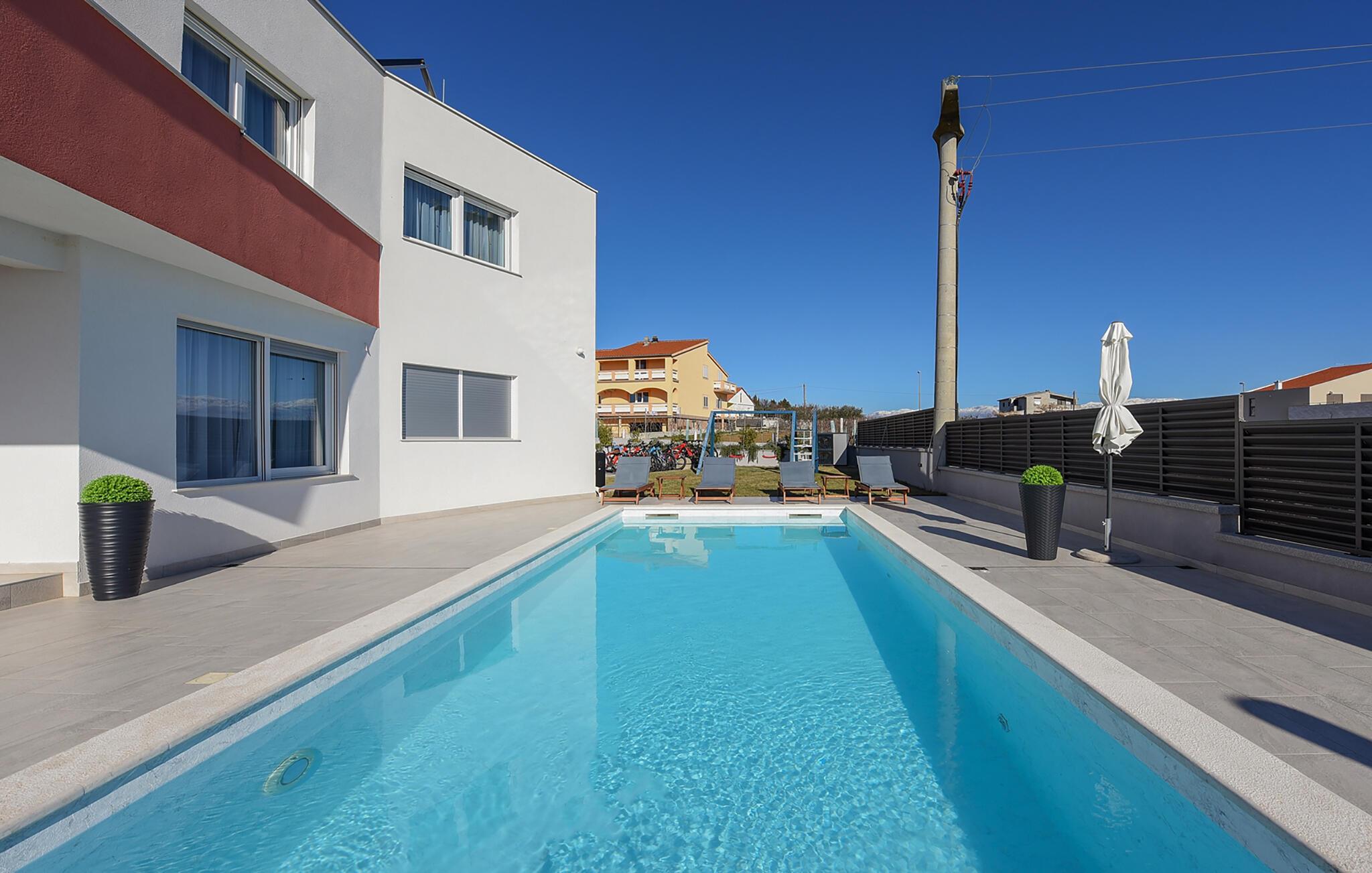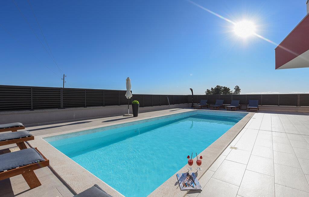 Tilbring en drømmeferie i dette luksuriøse feriehus med pool, spabad og sauna nær havet. Denne moderne villa lover en førsteklasses ferie. Elegante møbler, et komfortabelt sofaområde overfor tv'et og et fuldt udstyret køkken skaber en atmosfære, hvor I hurtigt kan slappe af og genoplade. For en forfriskende dukkert kan I hoppe i spabadet, og dem, der er i humør til lidt motion, kan spille et spil billard eller træne i fitnessrummet. Den store grund indbyder til motion eller afslapning når som helst. Svøm baner i poolen som det første om morgenen, eller hav det sjovt med at spille vandpolo. Bagefter kan I solbade, mens jeres børn rutsjer og leger i legehuset. Spil badminton, volleyball, fodbold eller tennis, afhængigt af hvad I har lyst til. Cykler er også tilgængelige. Tag en tur til sandstranden, måske endda på cykel, hvor I kan svømme eller blot nyde solen. Tag en tur til den nærliggende by Zadar og oplev dens imponerende gamle bydel med romerske og venetianske spor. Om aftenen kan I nyde det unikke skue af Havorglet og "Hilsen til Solen" direkte på havnepromenaden. Udforsk Kožinos charmerende omgivelser med dens idylliske kyststier og maleriske udsigter.