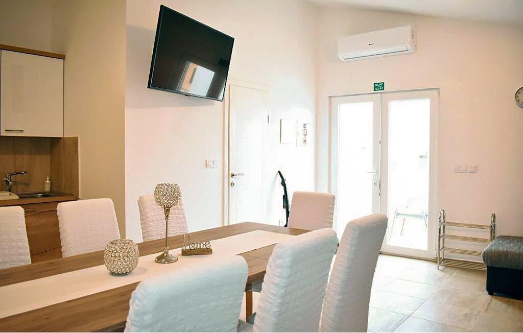 Oplev en afslappende ferie i denne praktiske ferielejlighed nær stranden. Denne funktionelle lejlighed tilbyder alt, hvad I behøver for en ubekymret ferie. En hyggelig stue med sarte farver, en stor sofa og et moderne køkken skaber en atmosfære, hvor I hurtigt kan slappe af. Uanset om I lytter til musik, brygger en frisk kop kaffe eller laver mad sammen – her sætter I tempoet for dagen. Nyd jeres morgenkaffe på terrassen og nyd udsigten over hustagene og det glitrende hav i det fjerne. Spis en afslappet morgenmad, inden I tager ud på jeres aktiviteter, eller slap af med jeres ferielæsning. Stranden ligger meget tæt på, så I kan svømme i det lave, klare vand eller slentre langs kysten, når I har lyst. Besøg den lille gamle bydel Nin, hvor historiske mure og stille gyder skaber en charmerende atmosfære. Tag også en tur til Zadar, hvor I kan opleve regionens kulturelle centrum midt i lyden af Havorglet, den charmerende gamle bydel og den livlige havnepromenade.