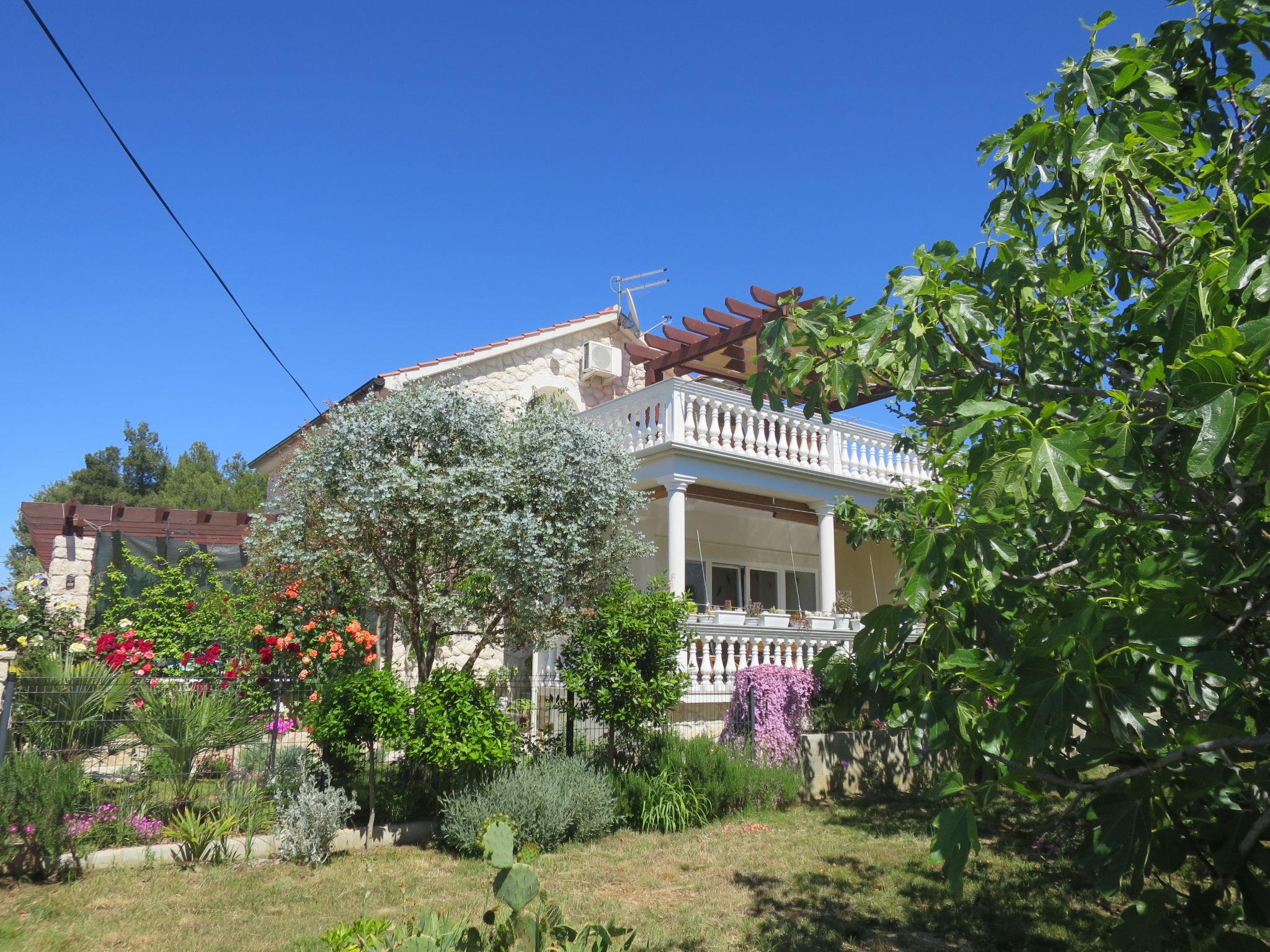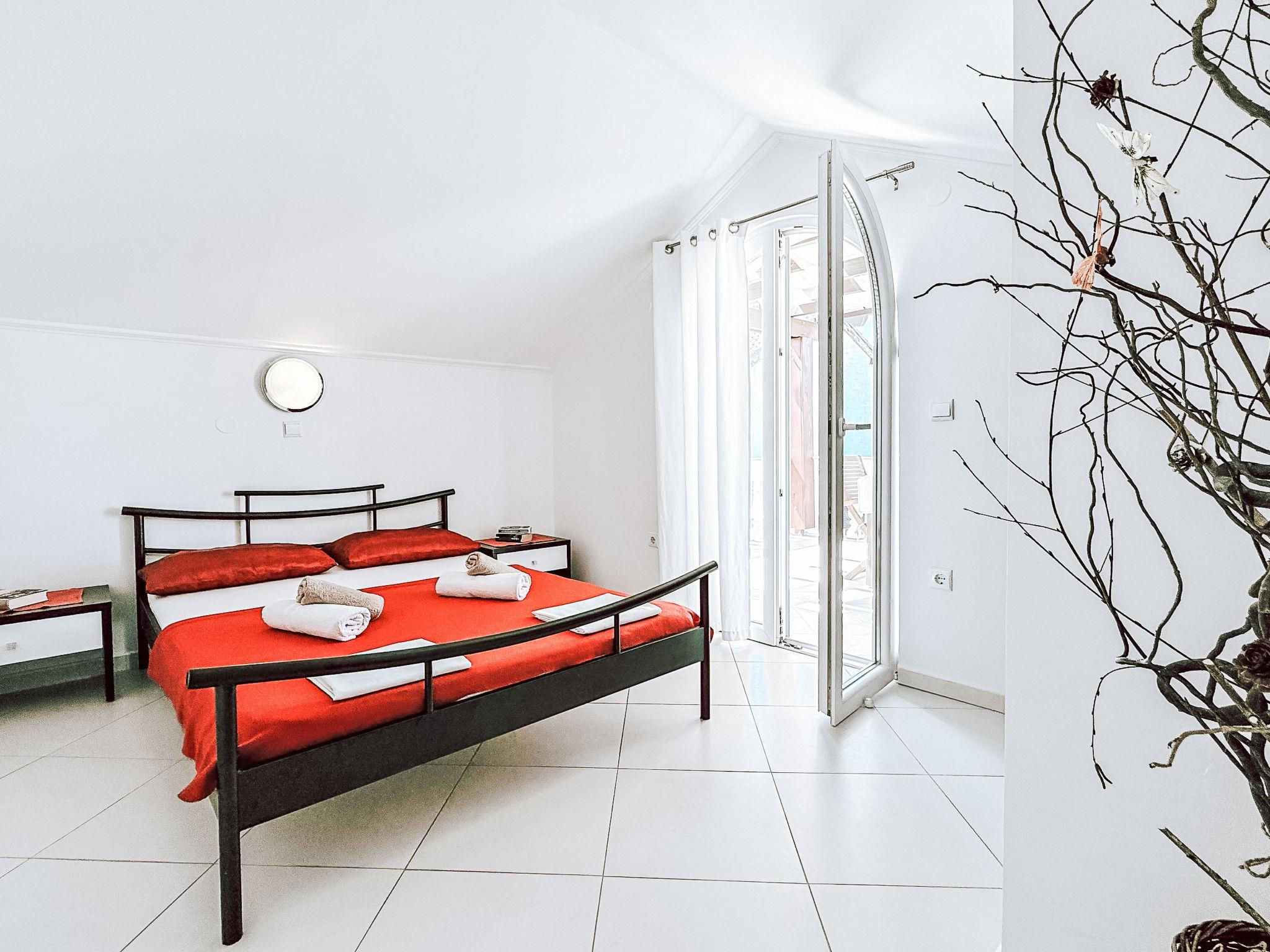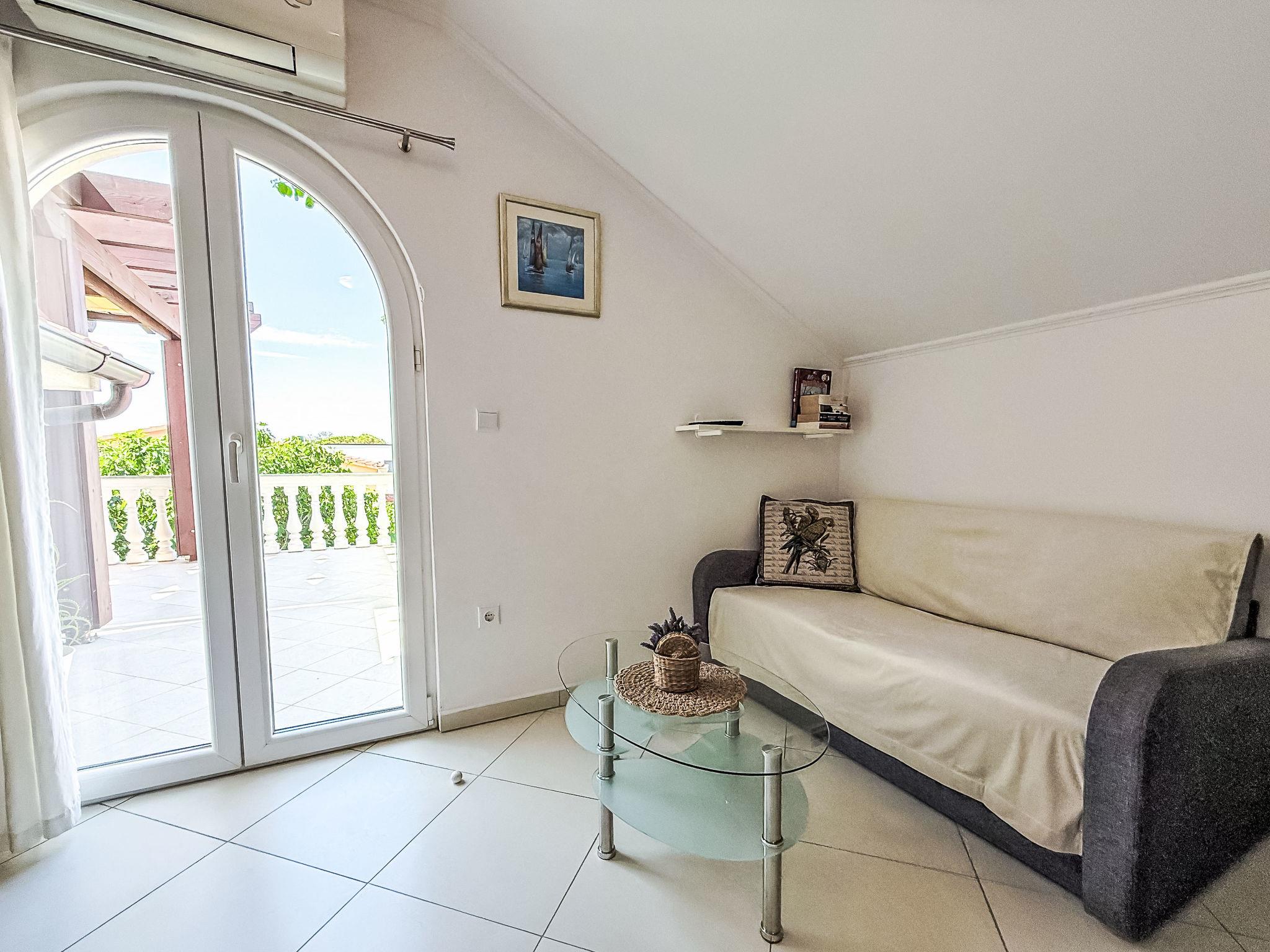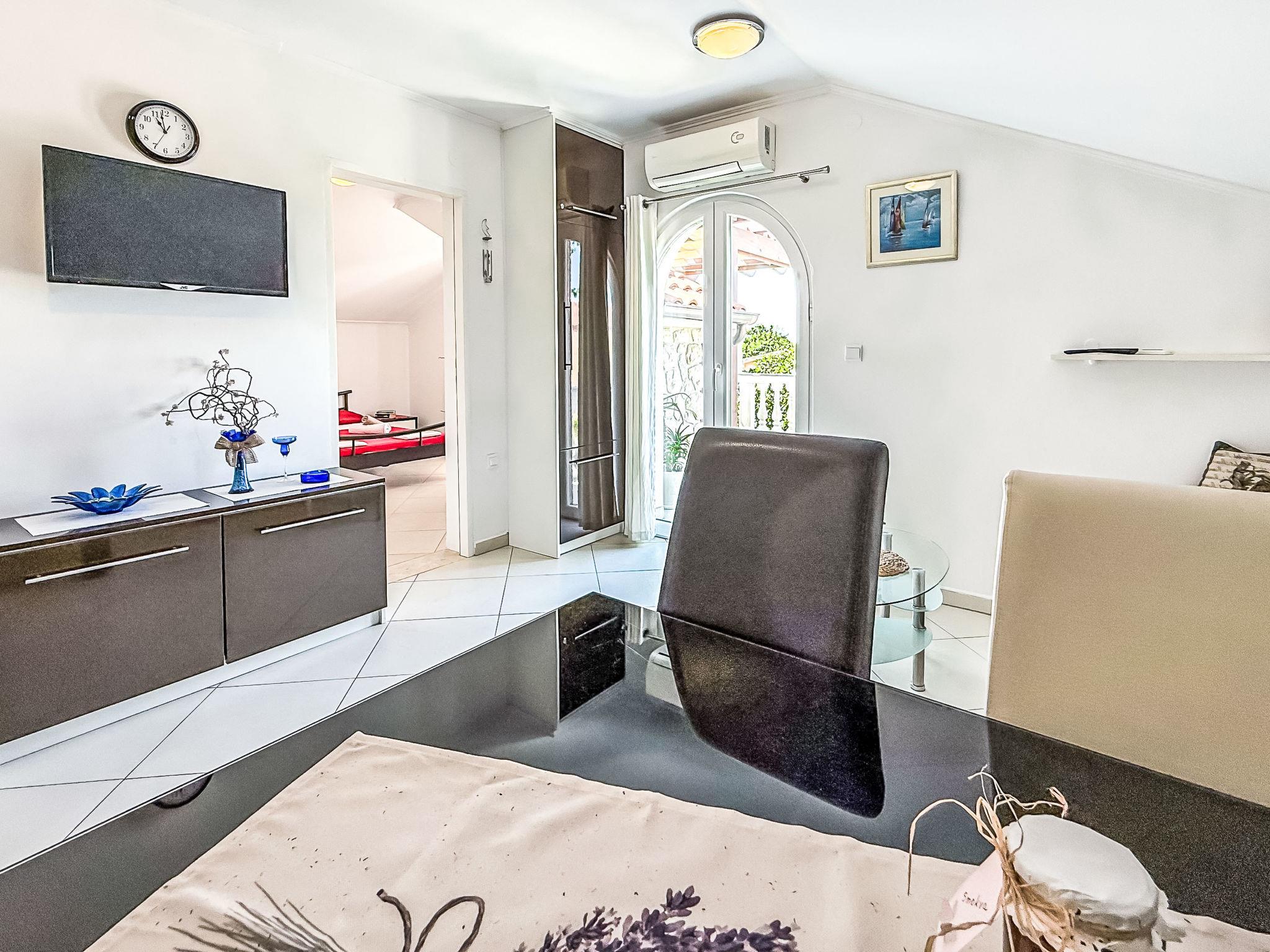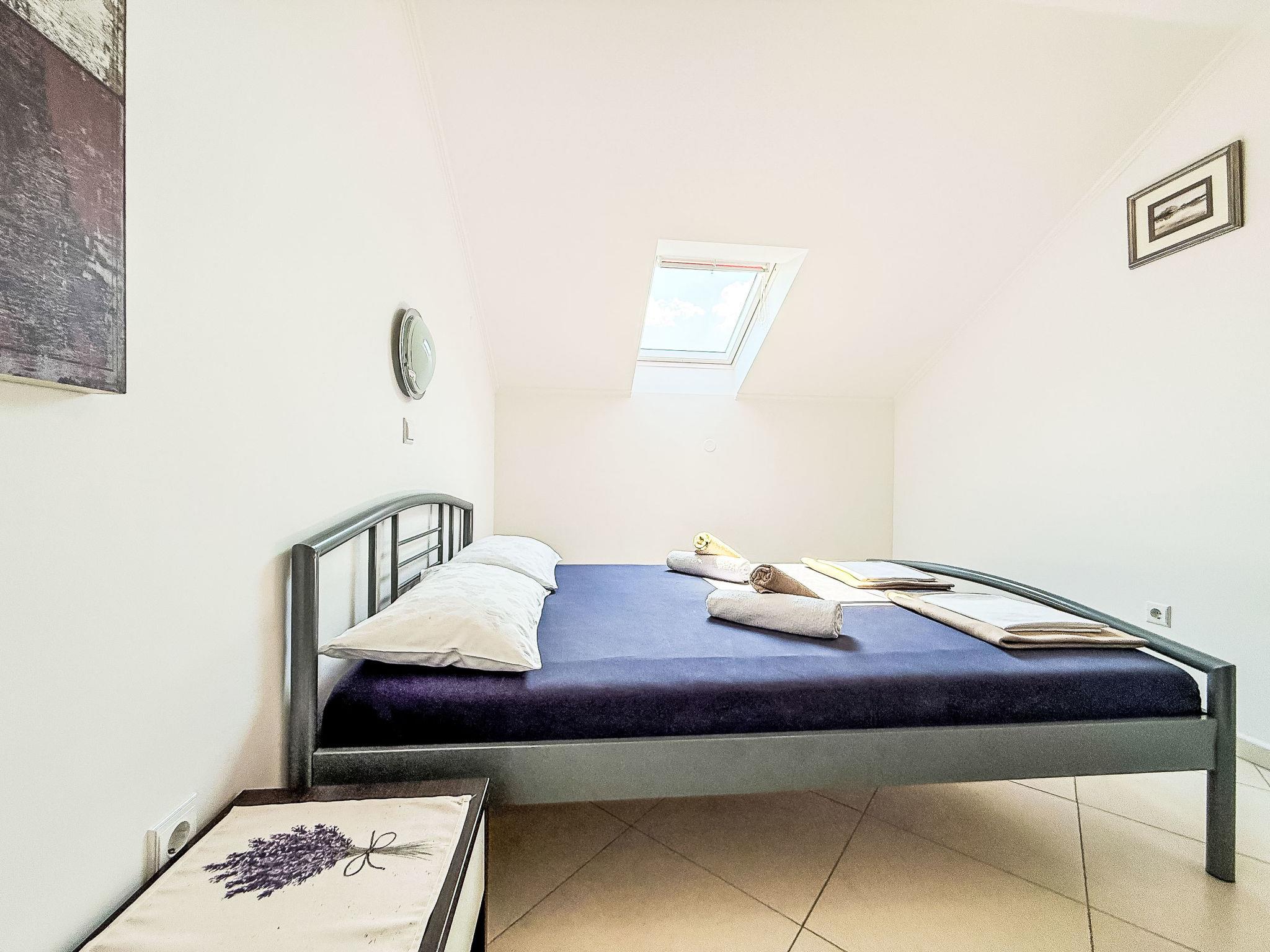 "Mirjana", 3-room apartment 55 m2, on the top floor. Living/dining room with sloping ceilings, ceiling height 150 - 240 cm with satellite TV and air conditioning. Exit to the terrace. 1 room with sloping ceilings, ceiling height 150 - 240 cm with 1 french bed (140 cm, length 200 cm). Exit to the terrace. 1 room with sloping ceilings, ceiling height 150 - 240 cm with rooflight with 1 french bed (140 cm, length 200 cm). With sloping ceilings, open kitchen (oven, dishwasher, 4 ceramic glass hob hotplates, toaster, kettle, freezer, electric coffee machine). Shower/WC. No heating option. Terrace 23 m2. Terrace furniture. Facilities: washing machine. Internet (WiFi, free). Please note: non-smoking house.