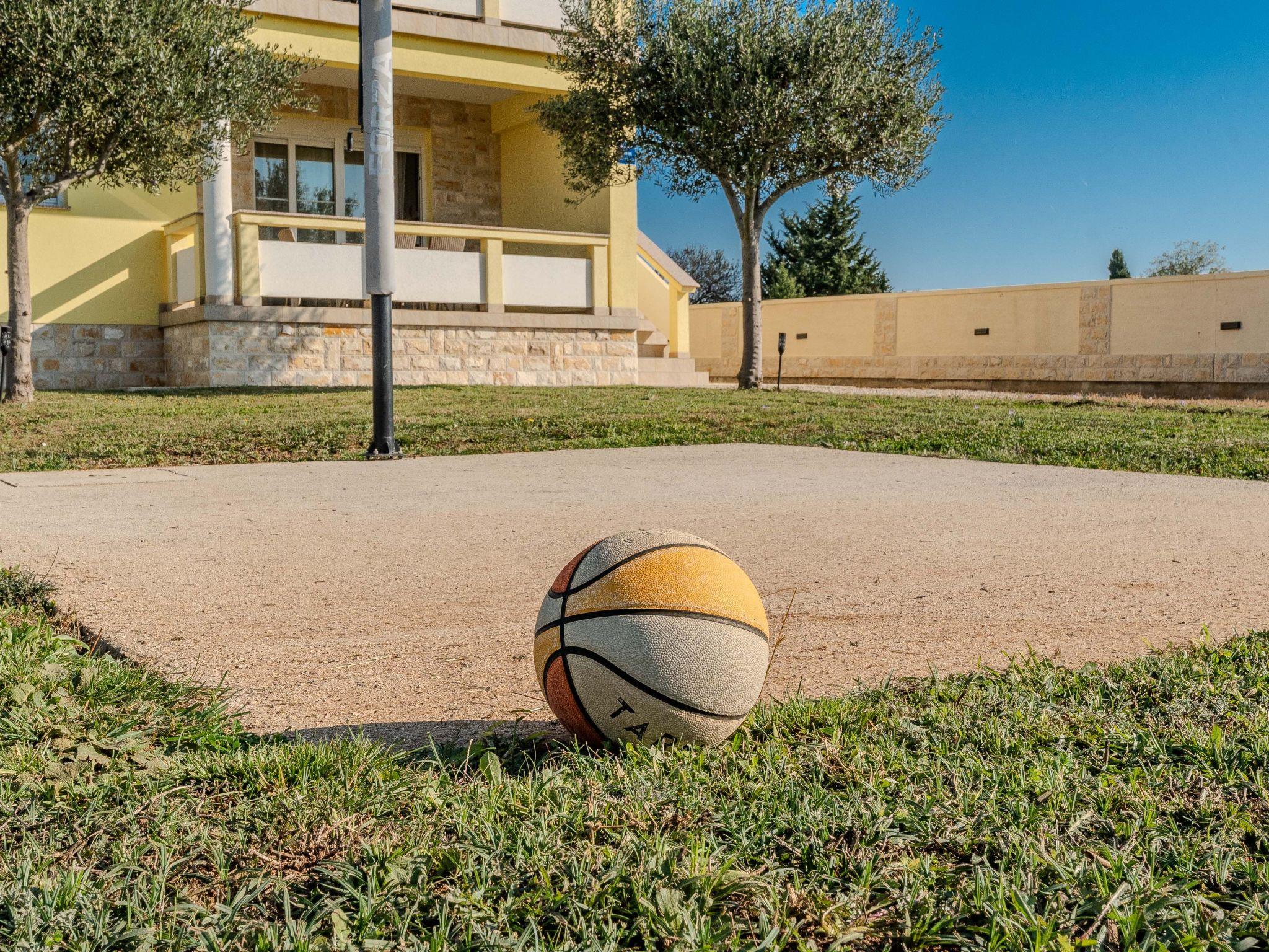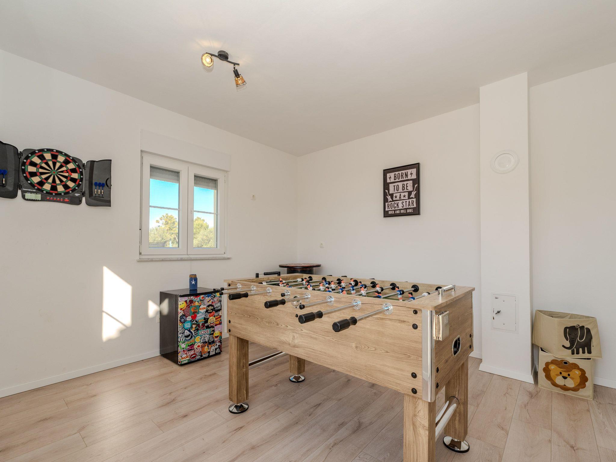 On the ground floor, the flat is divided into a living room with a fully equipped kitchen and dining room, a bedroom with a double bed and a bedroom with two single beds and a bathroom with a shower. The living room has a sofa bed for two people. The flat has a 10 m² covered terrace with table and chairs. On the first floor the flat has a living room with fully equipped kitchen and dining room, a bedroom with double bed and a bedroom with two single beds and a bathroom with shower. Flat includes a 10 m² covered balcony with partial sea view, table and chairs. All rooms are air-conditioned. At the back of the property there is a games room with darts, table football and a children's corner and in the courtyard there is a basketball court, football, trampoline, children's playground, swing, gazebo with table and chairs, barbecue, deckchairs and a parasol.