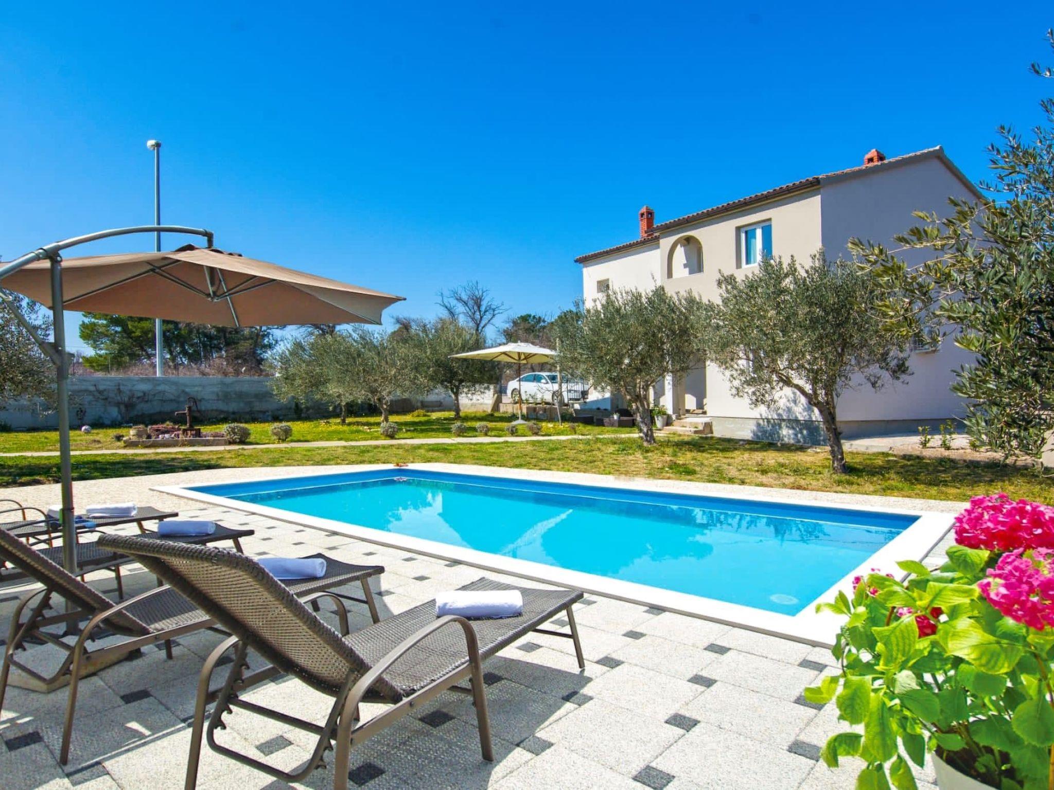 This modern villa is located on a 1500 m² estate with swimming pool in the town of Nin. The 220 m² villa extends over two floors, consists of 2 flats and can accommodate a total of 14 people.