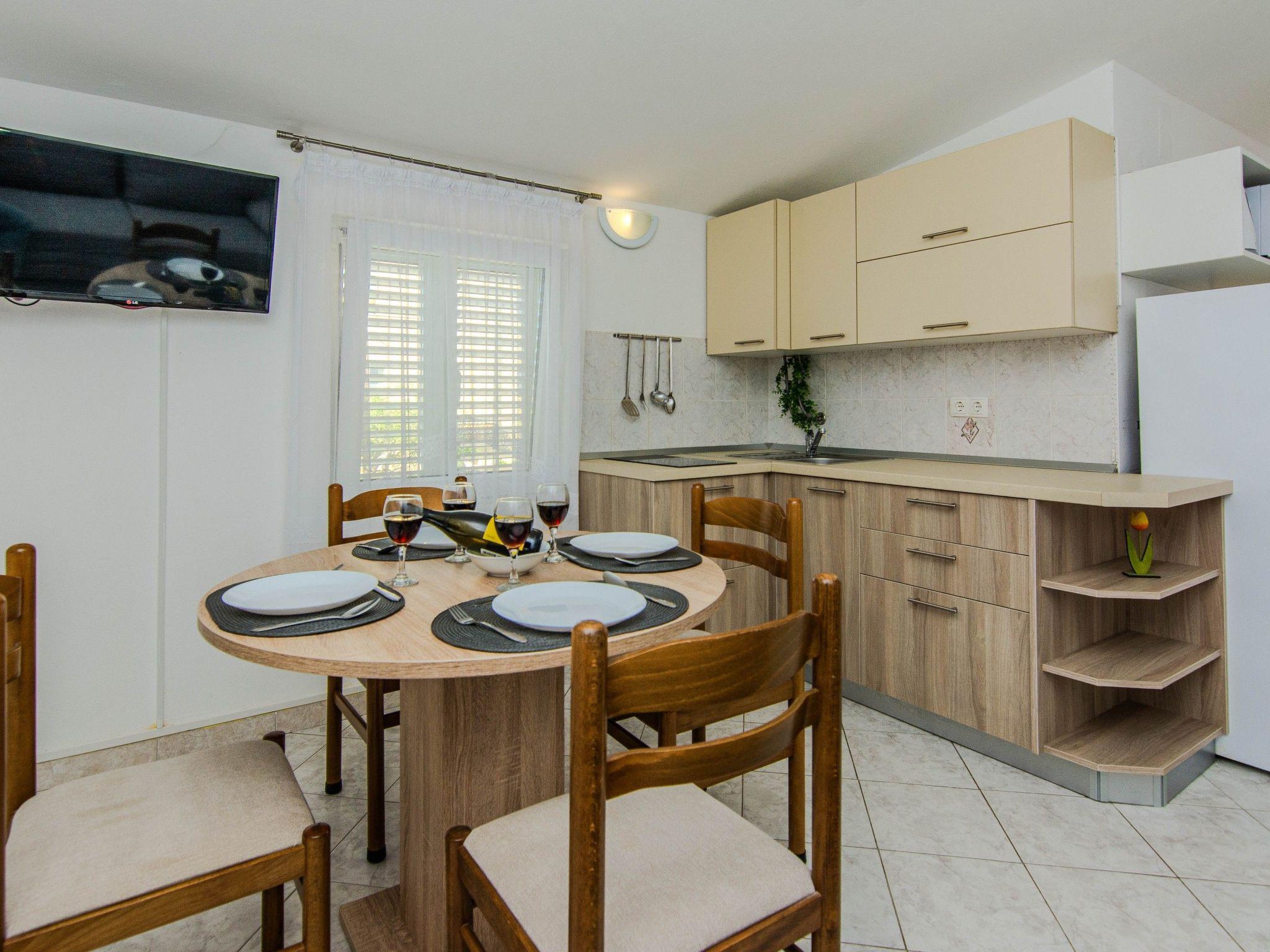 The outdoor area of the flat emphasises the idyllic location with a cosy, covered balcony. Furnished with a table and chairs, this is the perfect place for al fresco dining or simply reading a book in peace. The shared garden invites you to enjoy the sunny Dalmatian days to the full, while the outdoor shower provides a refreshing dip after a day at the nearby beach.