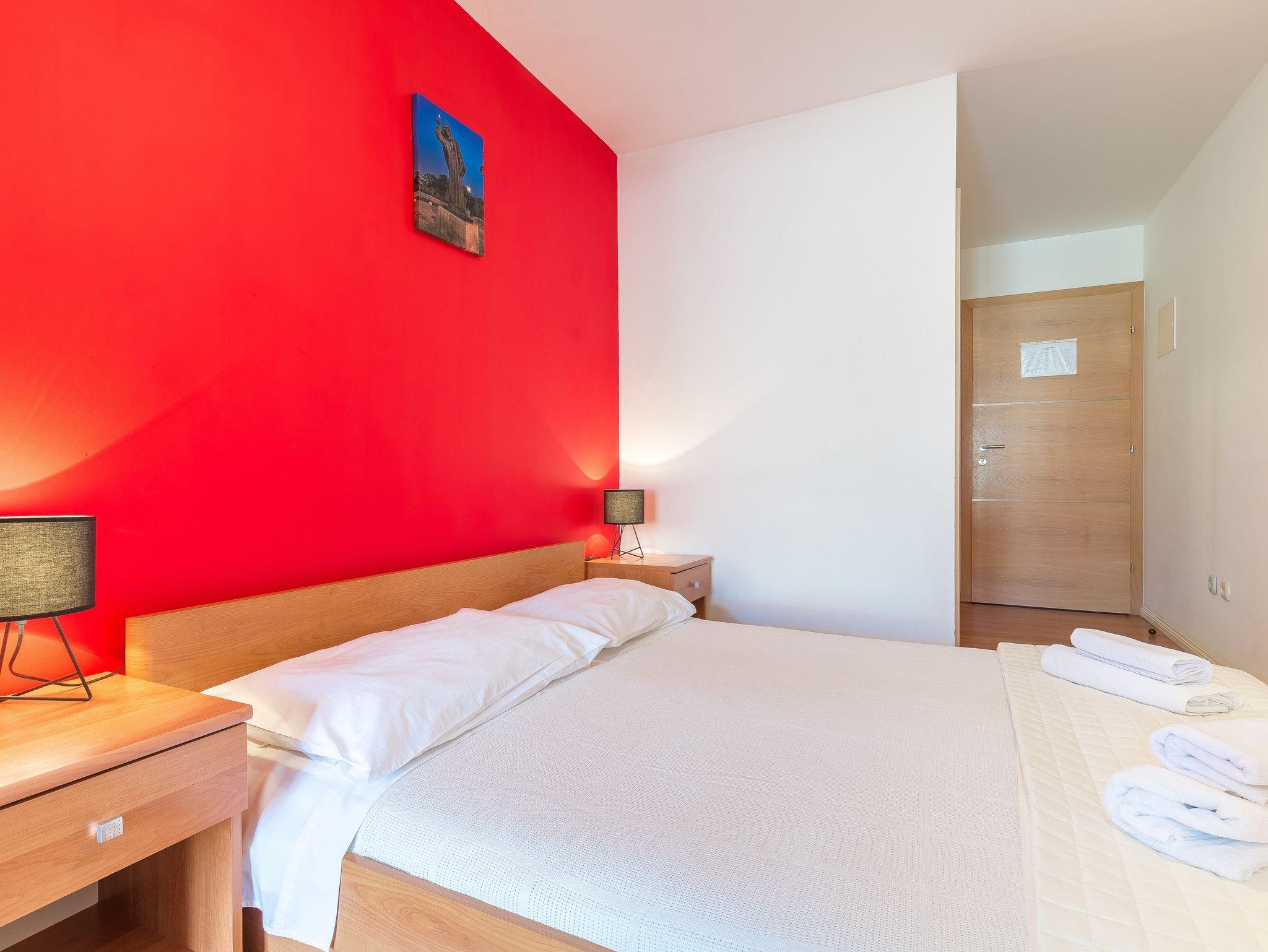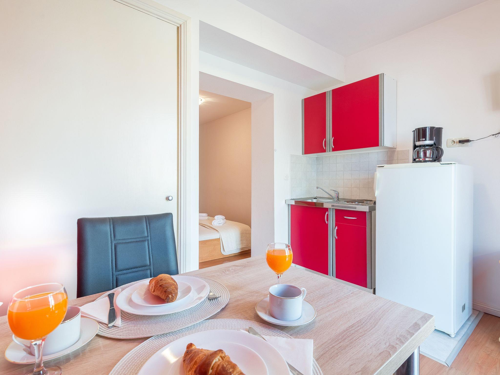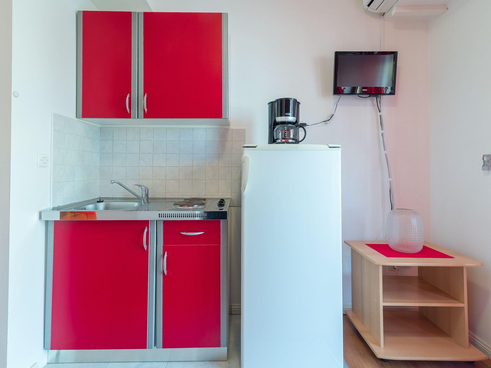 Studio bietet Platz für 2 Gäste. Die Betten sind in Schlafzimmern, die es 1 gibt, innerhalb einer Gesamtfläche von 21m2, angeordnet. Die Gäste haben eine eigene Terrasse zur Verfügung, auf der sie in warmen Sommernächten genießen können. Das Studio-Apartment bietet Meerblick. Es ist erlaubt, Speisen auf dem Gemeinschafts-Grill vorzubereiten. IM PREIS INBEGRIFFEN: Kurtaxe, Endreinigung, Klimatisierung, Parkplatz, Internet, Bügeleisen, Föhn. VERBINDLICHE ZUSÄTZLICHE KOSTEN: Aufzahlung für Kurzaufenthalte (prozentualer Zuschlag pro Nächtigungsanzahl: 30% - 1, 20% - 2, 10% - 3). Die Verfügbarkeit zusätzlicher Dienstleistungen in Ihrem reservierten Termin und die Preise derselben (falls nicht aufgeführt) müssen im Voraus überprüft werden. Zusätzliche Dienstleistungen die in der Zahlungsaufforderung nicht aufgeführt sind werden direkt beim Vermieter bezahlt, angenommen der Gast nutzt auch diese.