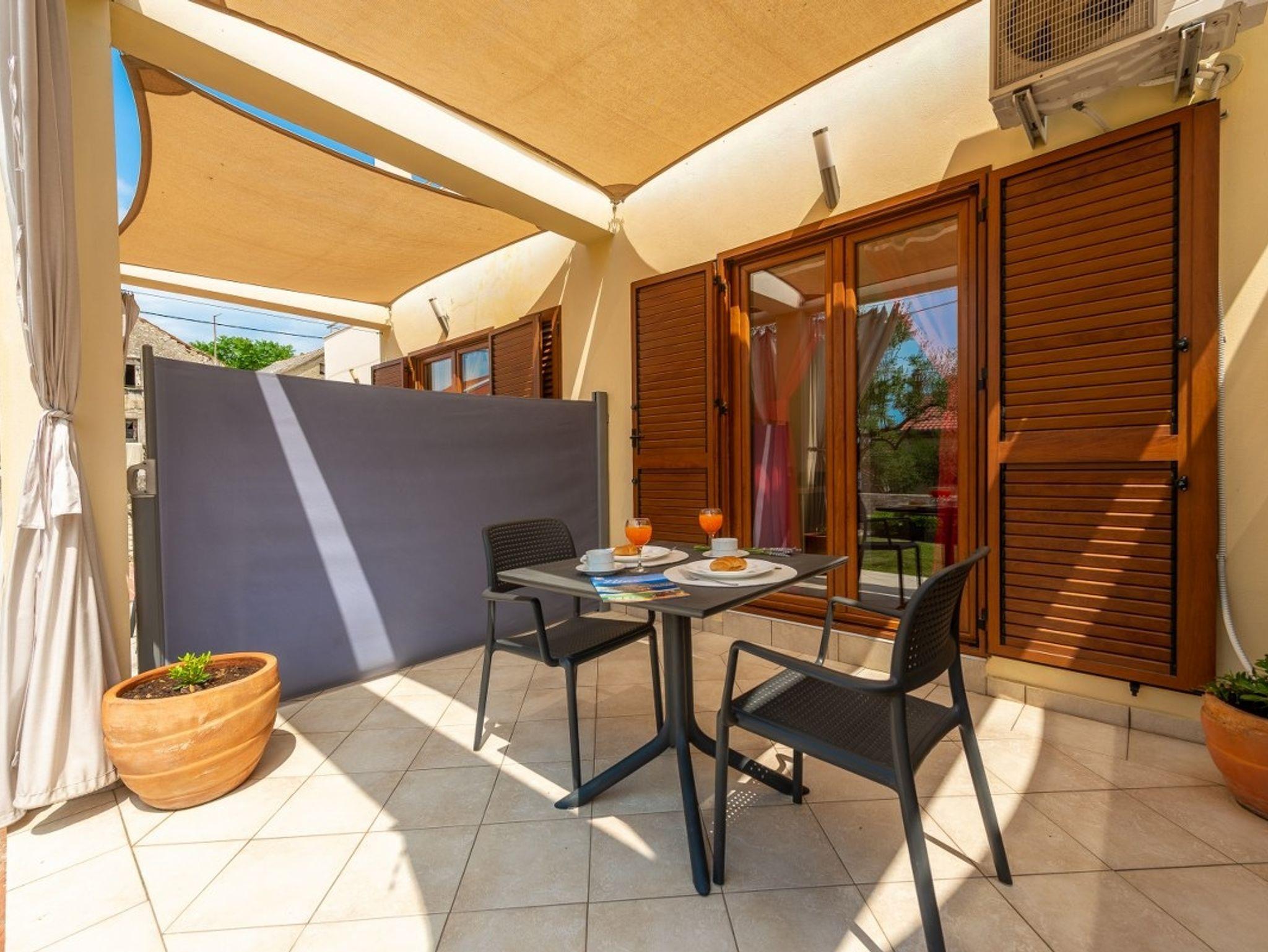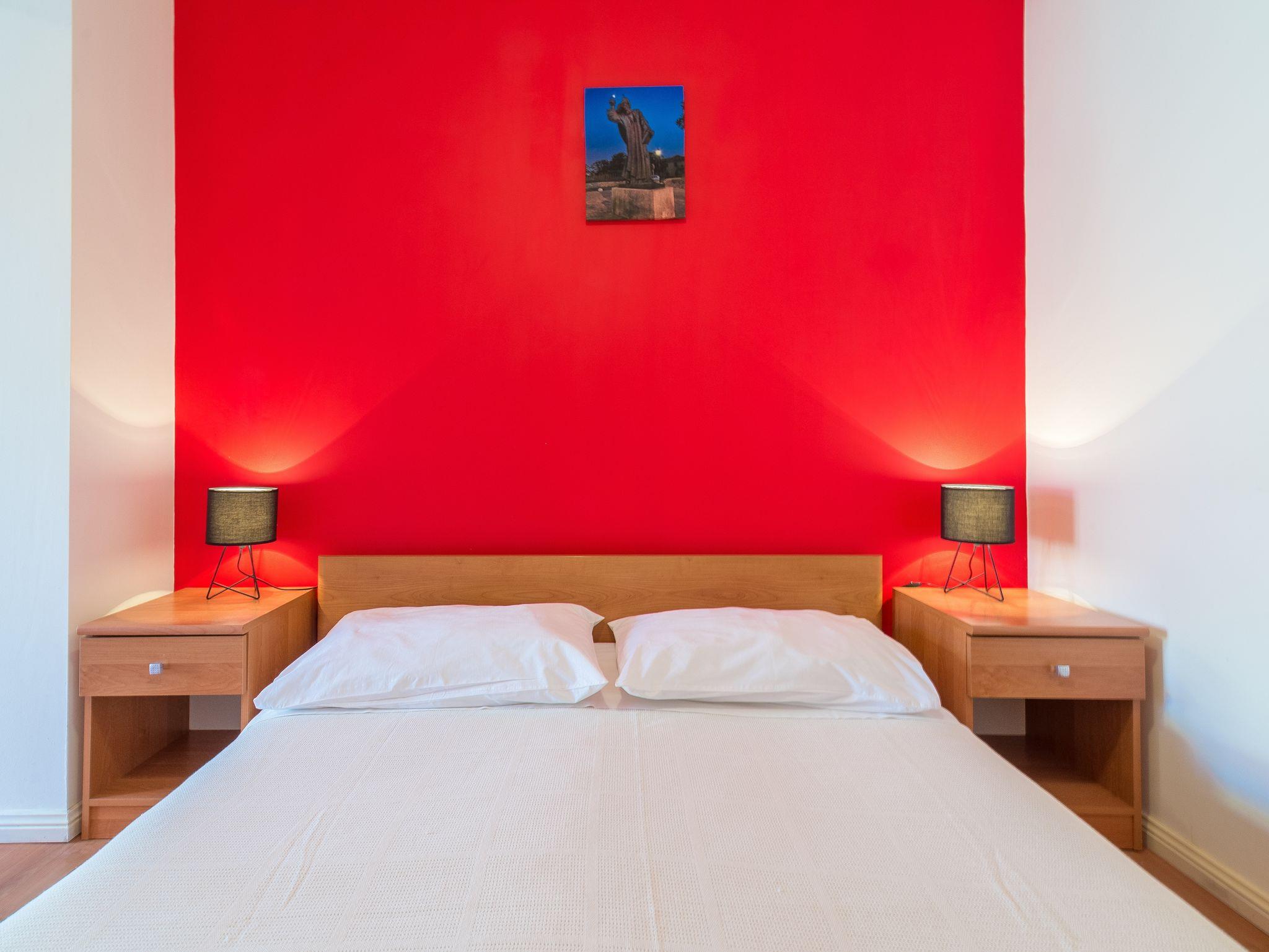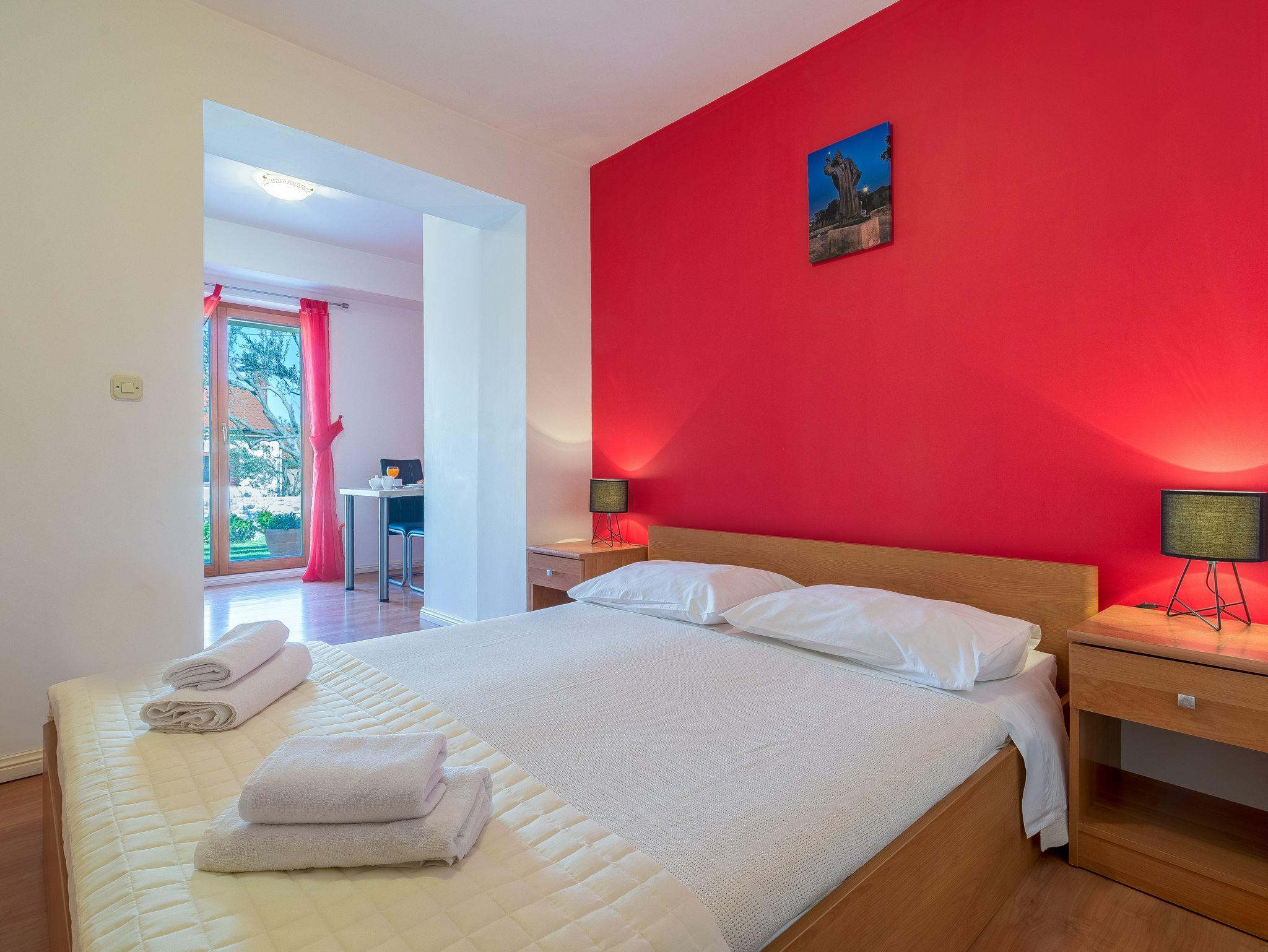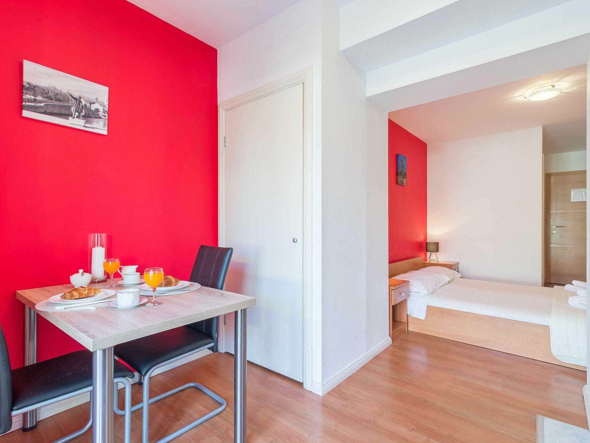 Studio bietet Platz für 2 Gäste. Die Betten sind in Schlafzimmern, die es 1 gibt, innerhalb einer Gesamtfläche von 21m2, angeordnet. Die Gäste haben eine eigene Terrasse zur Verfügung, auf der sie in warmen Sommernächten genießen können. Das Studio-Apartment bietet Meerblick. Es ist erlaubt, Speisen auf dem Gemeinschafts-Grill vorzubereiten. IM PREIS INBEGRIFFEN: Kurtaxe, Endreinigung, Klimatisierung, Parkplatz, Internet, Bügeleisen, Föhn. VERBINDLICHE ZUSÄTZLICHE KOSTEN: Aufzahlung für Kurzaufenthalte (prozentualer Zuschlag pro Nächtigungsanzahl: 30% - 1, 20% - 2, 10% - 3). Die Verfügbarkeit zusätzlicher Dienstleistungen in Ihrem reservierten Termin und die Preise derselben (falls nicht aufgeführt) müssen im Voraus überprüft werden. Zusätzliche Dienstleistungen die in der Zahlungsaufforderung nicht aufgeführt sind werden direkt beim Vermieter bezahlt, angenommen der Gast nutzt auch diese.