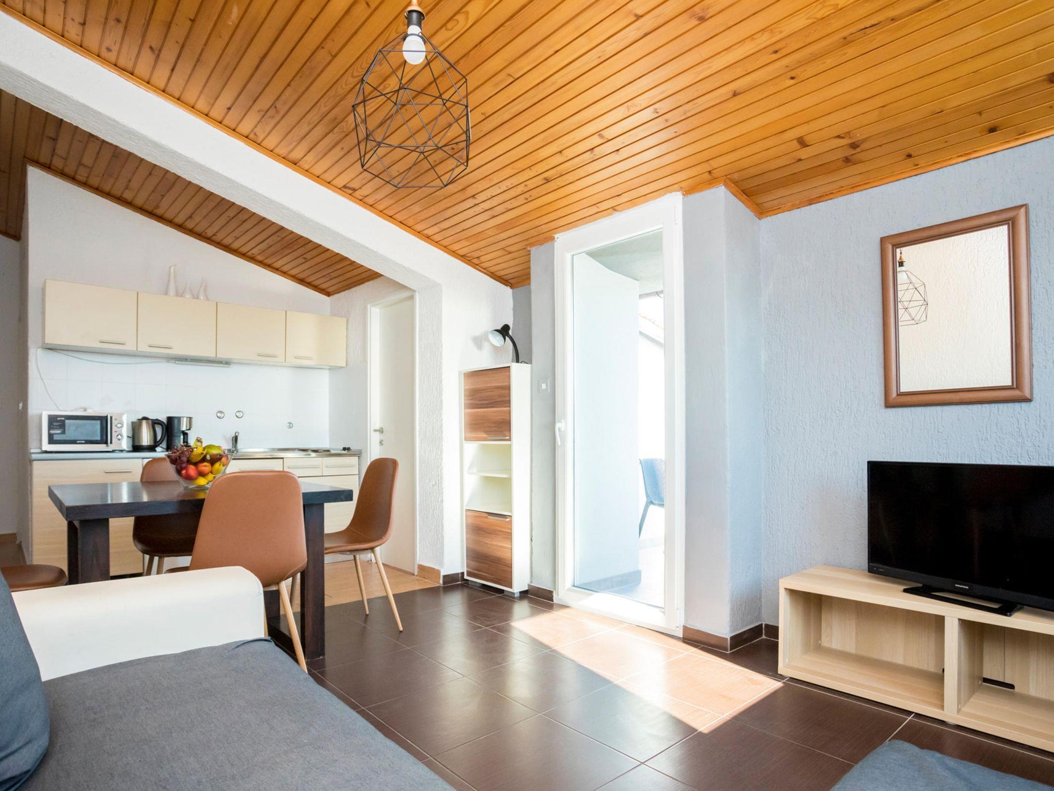 Ferienwohnung bietet Platz für 5 Gäste. Die Betten sind in Schlafzimmern, die es 2 gibt, und in Wohnzimmer, innerhalb einer Gesamtfläche von 47m2, angeordnet. Die Gäste haben eine eigene Terrasse zur Verfügung, auf der sie in warmen Sommernächten genießen können. Das Apartment bietet Meerblick. Es ist erlaubt, Speisen auf dem Gemeinschafts-Grill vorzubereiten. In der Unterkunftseinheit besteht die Möglichkeit des Mitbringens von Haustieren gegen Aufpreis. IM PREIS INBEGRIFFEN: Kurtaxe, Endreinigung, Klimatisierung, Parkplatz, Internet. VERBINDLICHE ZUSÄTZLICHE KOSTEN: Aufzahlung für Kurzaufenthalte (prozentualer Zuschlag pro Nächtigungsanzahl: 30% - 1, 20% - 2, 10% - 3). UNVERBINDLICHE ZUSÄTZLICHE KOSTEN: Haustiere (10,00 € pro Nacht). Die Verfügbarkeit zusätzlicher Dienstleistungen in Ihrem reservierten Termin und die Preise derselben (falls nicht aufgeführt) müssen im Voraus überprüft werden. Zusätzliche Dienstleistungen die in der Zahlungsaufforderung nicht aufgeführt sind werden direkt beim Vermieter bezahlt, angenommen der Gast nutzt auch diese.