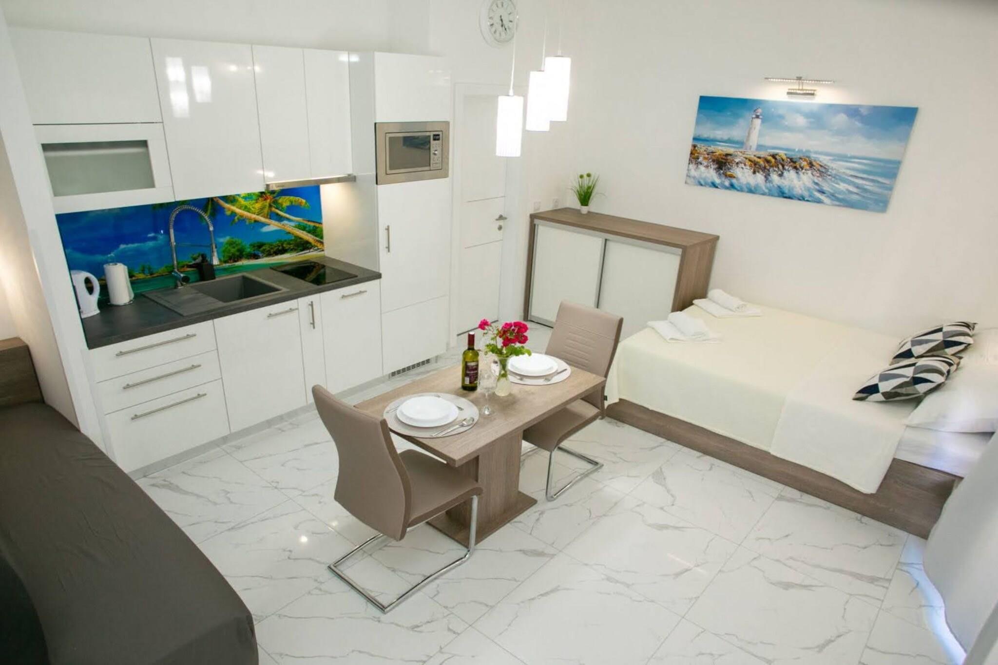 Apartments Sun Dance 2 er en ejendom beliggende i Novalja, Licko-Senjska County, Kroatien. Lejlighederne er kendt for at tilbyde komfortabel indkvartering med moderne bekvemmeligheder og er især bemærkelsesværdige for at have en opvarmet pool, hvilket gør dem til et populært valg for rejsende, der søger afslapning. Aircondition: For at sikre komfort i de varmere måneder. Wi-Fi: Gratis adgang til højhastighedsinternet. Parkering: Parkering på stedet tilgængelig for gæster. Bemærk: Kæledyr er ikke tilladt. Privat parkering, reservation er ikke påkrævet. Wi-Fi er tilgængeligt overalt på ejendommen. Denne studiolejlighed kan rumme op til tre gæster. Den har et fladskærms-tv og en værdiboks. Det private badeværelse er udstyret med bruser og toilet. Takket være den fremragende beliggenhed er alt, hvad du behøver til din ferie, kun en kort gåtur fra ejendommen. Købmandsforretninger og caféer, restauranter - 200,00 m - 500,00 m. Stranden ligger 800,00 m fra ejendommen. Lufthavnen ligger 63 km fra ejendommen.