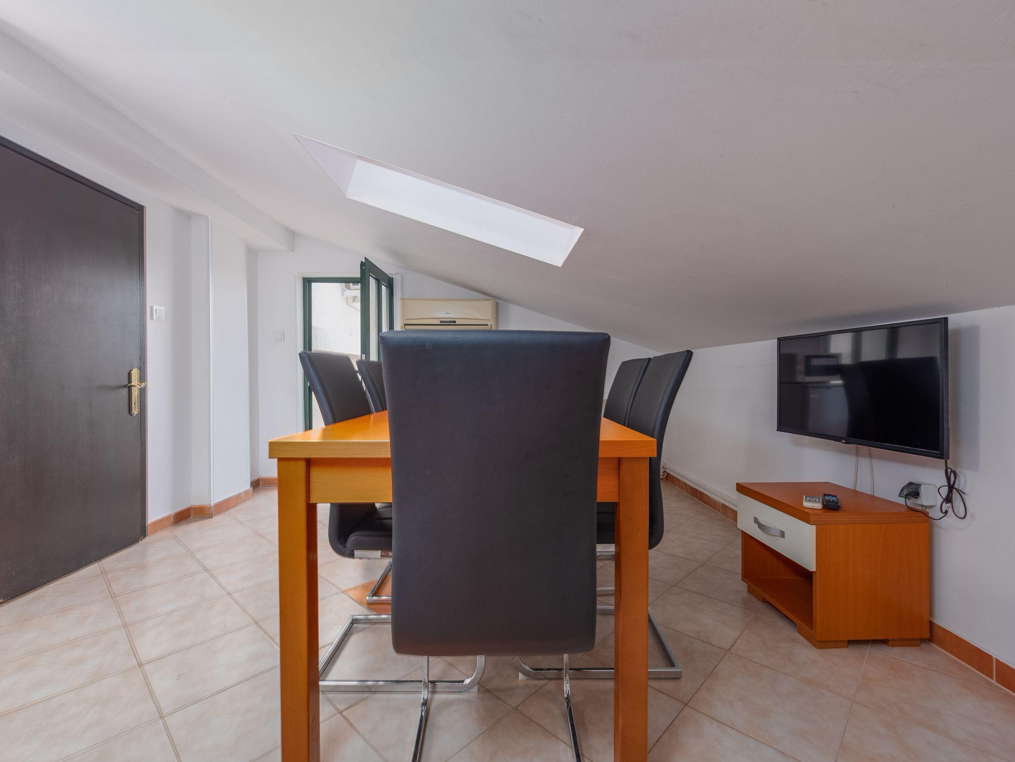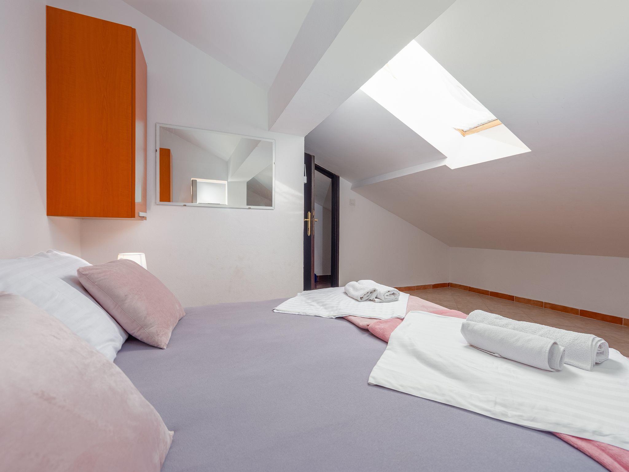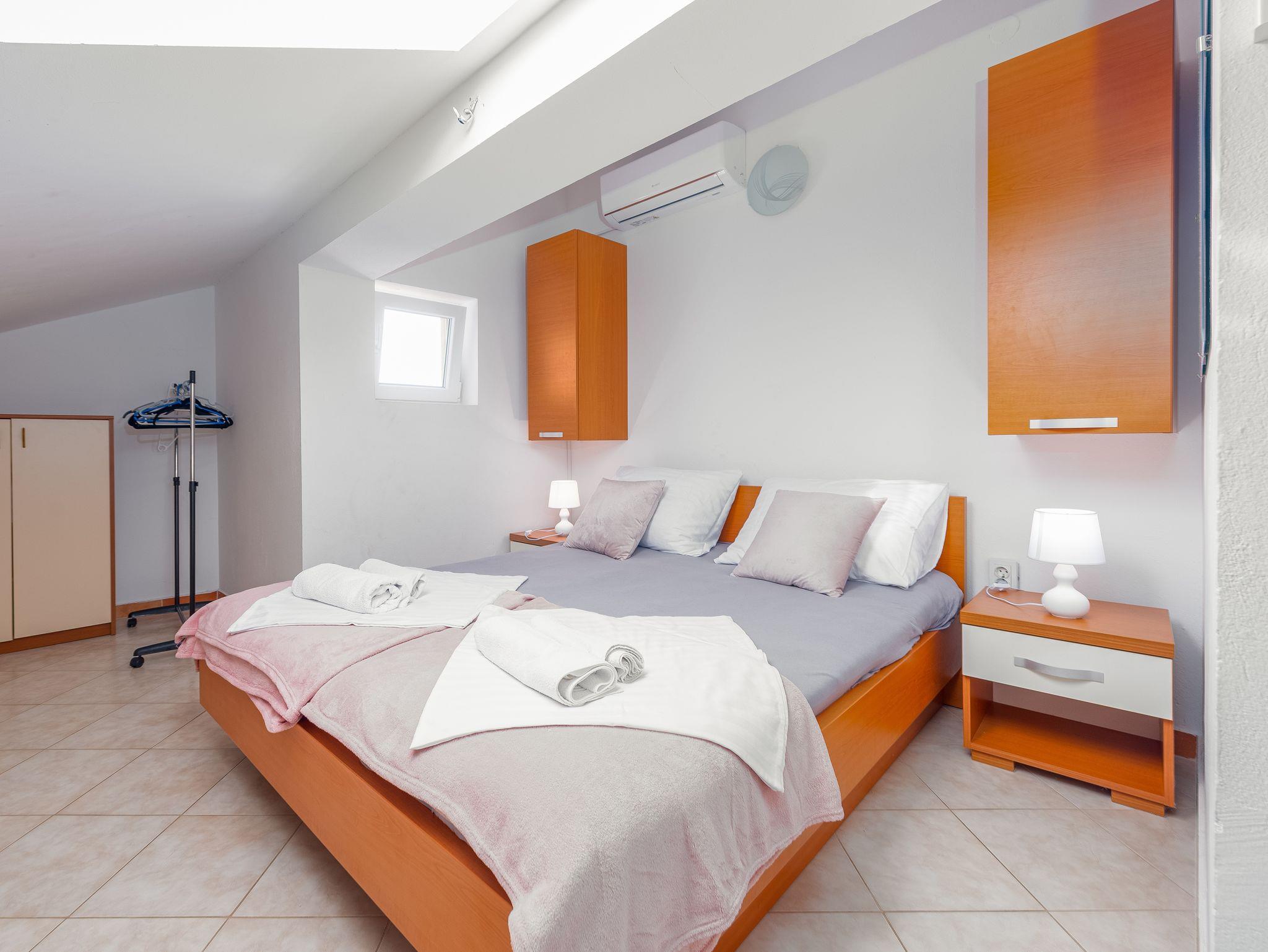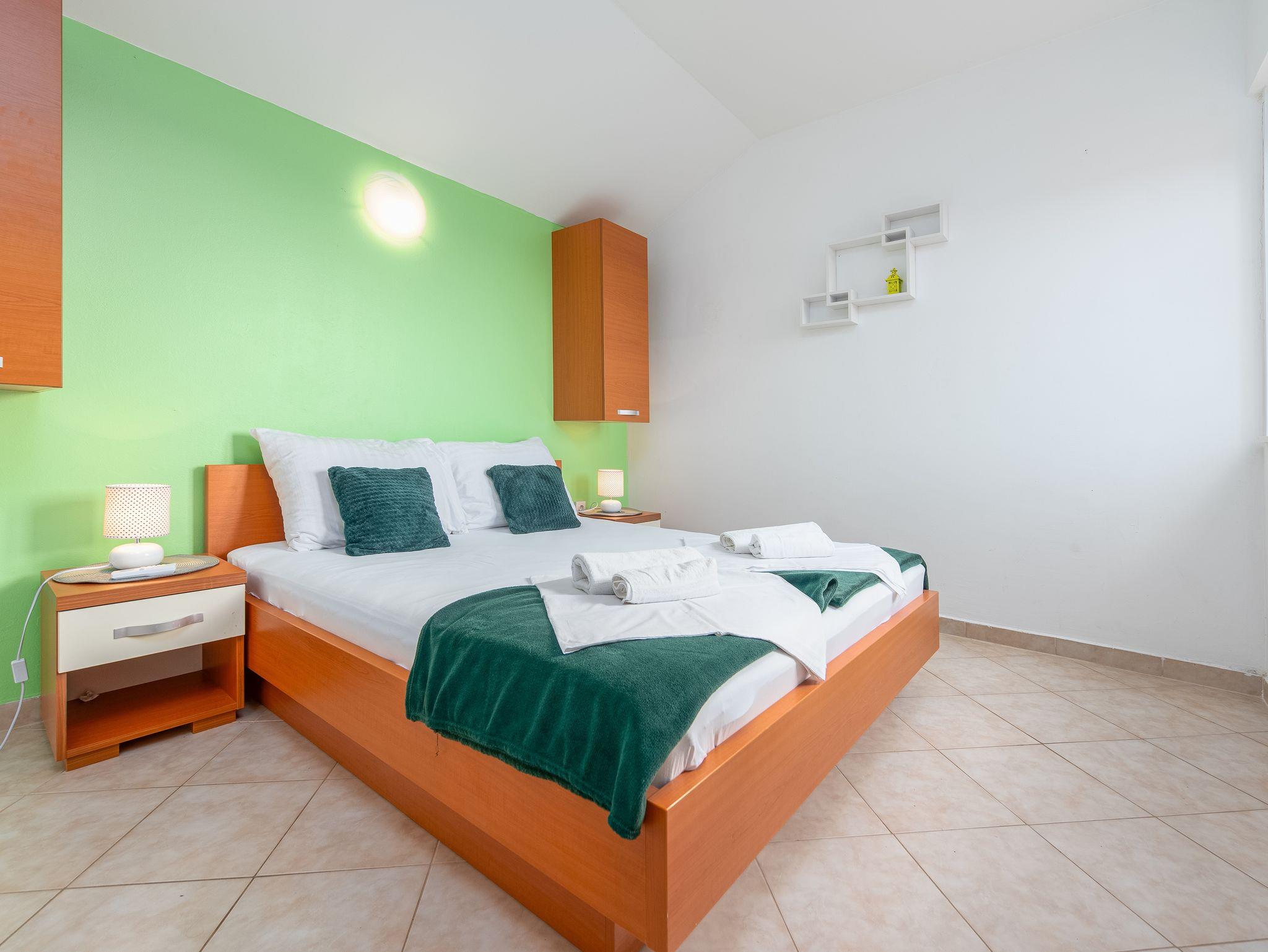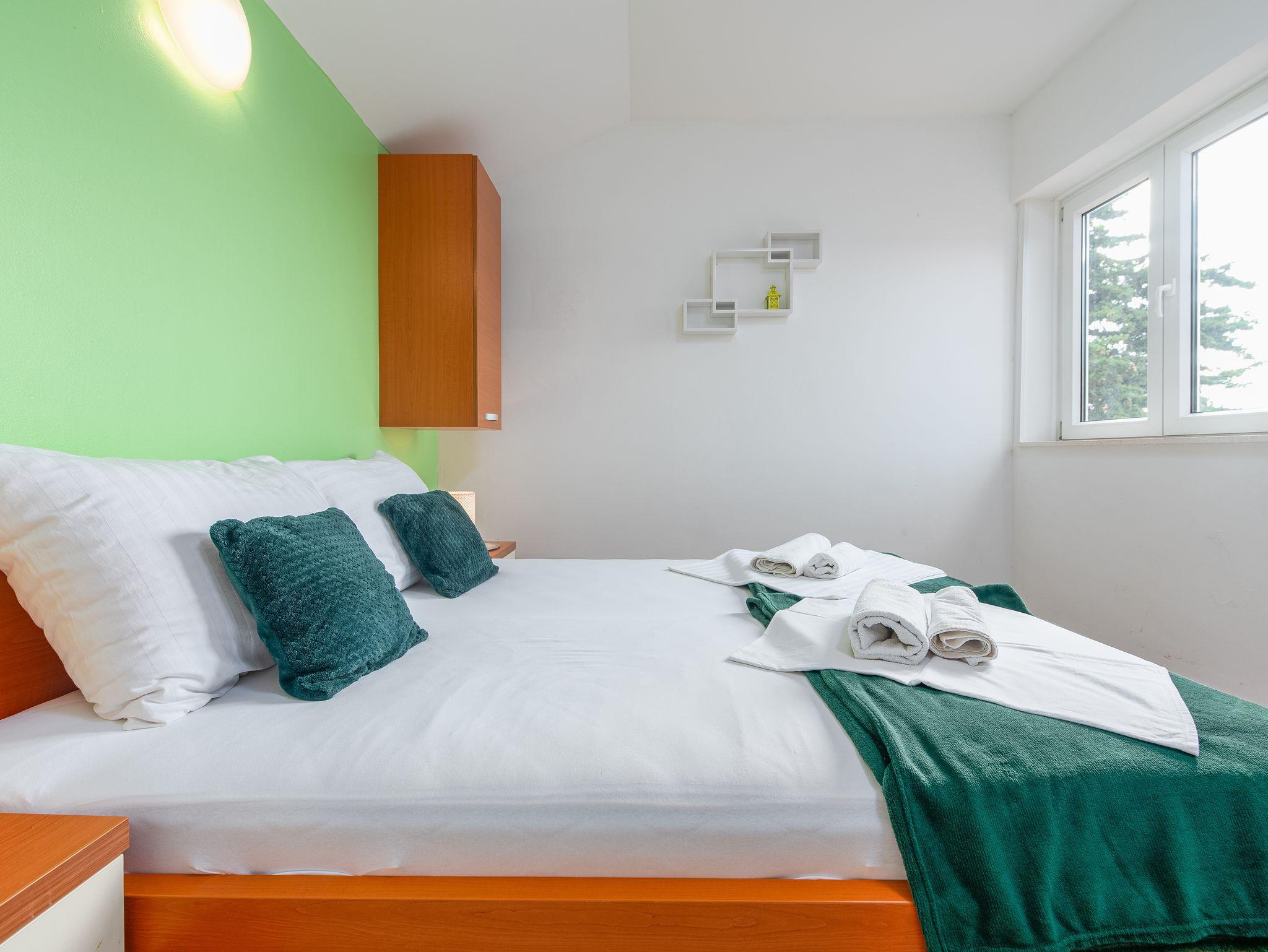 Ferienwohnung bietet Platz für 6 Gäste. Die Betten sind in Schlafzimmern, die es 2 gibt, und in Esszimmer, innerhalb einer Gesamtfläche von 60m2, angeordnet. Die Gäste haben eine eigene Terrasse zur Verfügung, auf der sie in warmen Sommernächten genießen können. Das Apartment bietet Meerblick. Es ist erlaubt, Speisen auf dem Gemeinschafts-Grill vorzubereiten. IM PREIS INBEGRIFFEN: Kurtaxe, Endreinigung, Klimatisierung, Parkplatz, Bootsanlegeplatz, Föhn. VERBINDLICHE ZUSÄTZLICHE KOSTEN: Aufzahlung für Kurzaufenthalte (prozentualer Zuschlag pro Nächtigungsanzahl: 30% - 1, 20% - 2, 10% - 3). Die Verfügbarkeit zusätzlicher Dienstleistungen in Ihrem reservierten Termin und die Preise derselben (falls nicht aufgeführt) müssen im Voraus überprüft werden. Zusätzliche Dienstleistungen die in der Zahlungsaufforderung nicht aufgeführt sind werden direkt beim Vermieter bezahlt, angenommen der Gast nutzt auch diese.