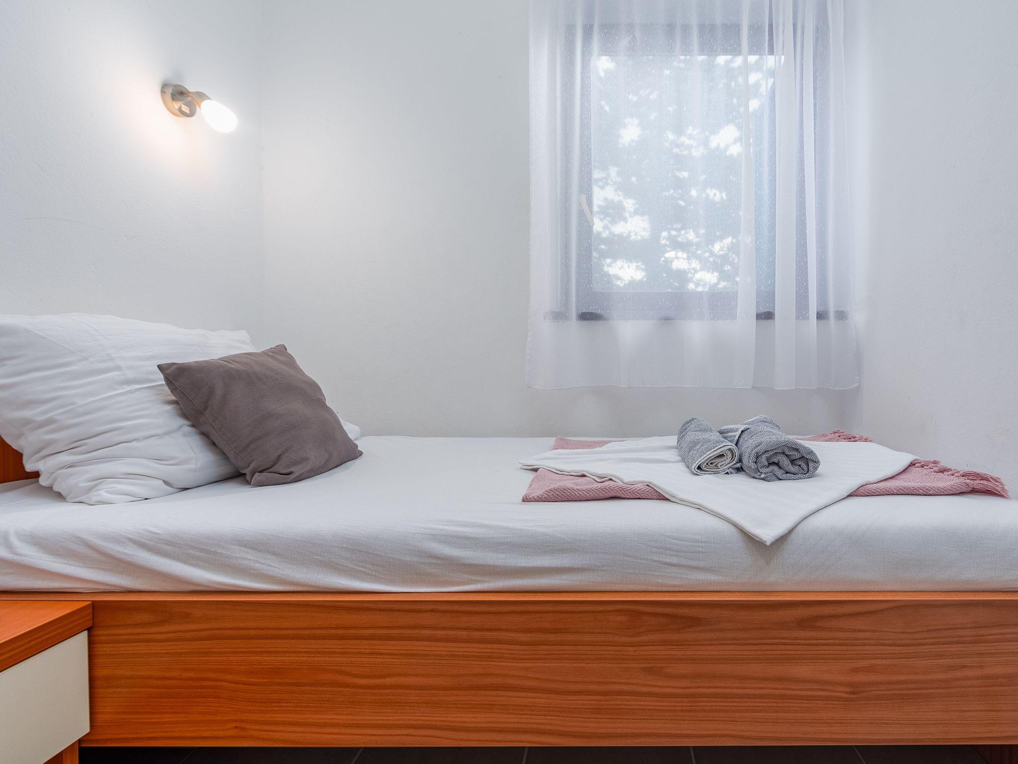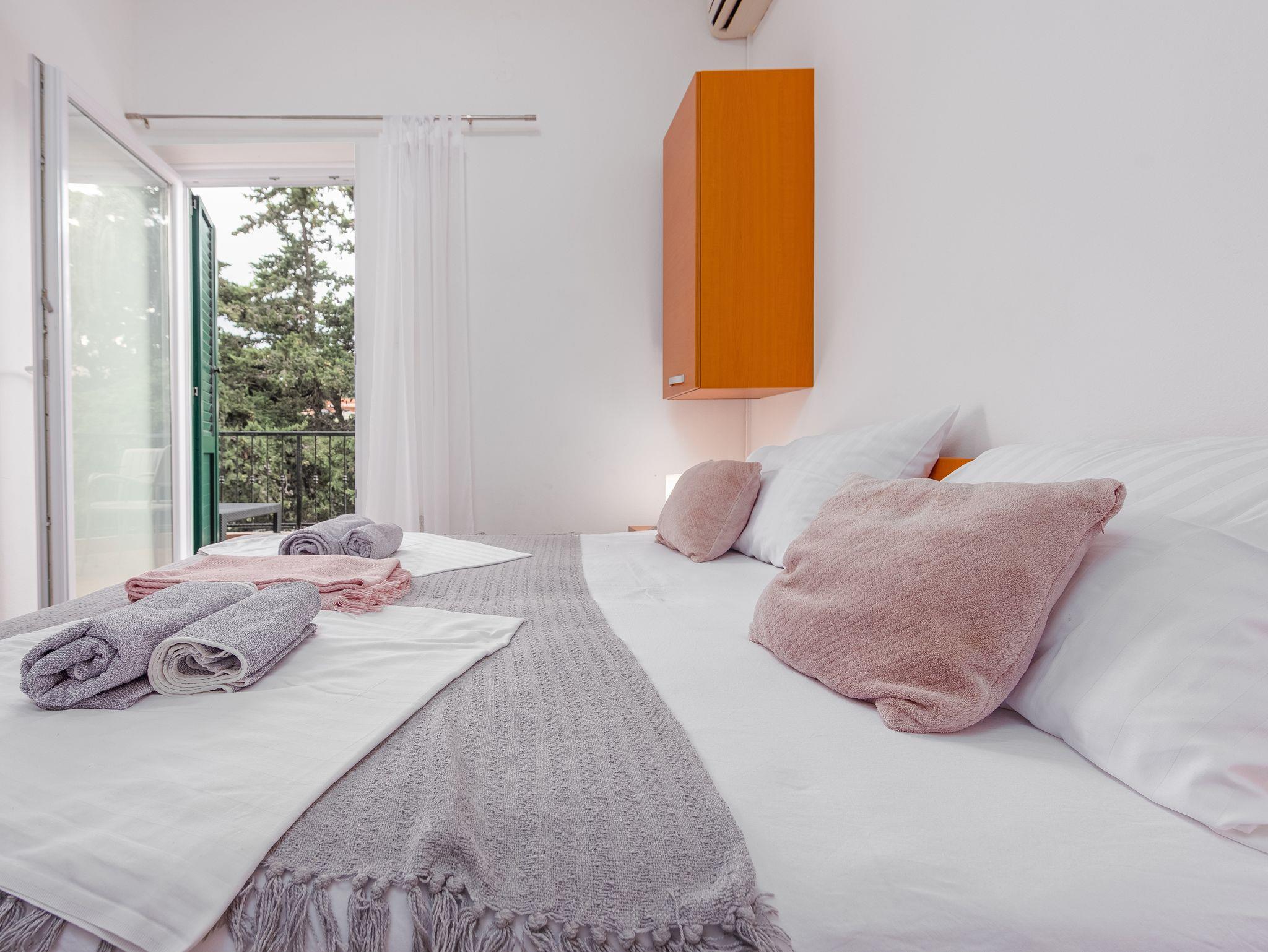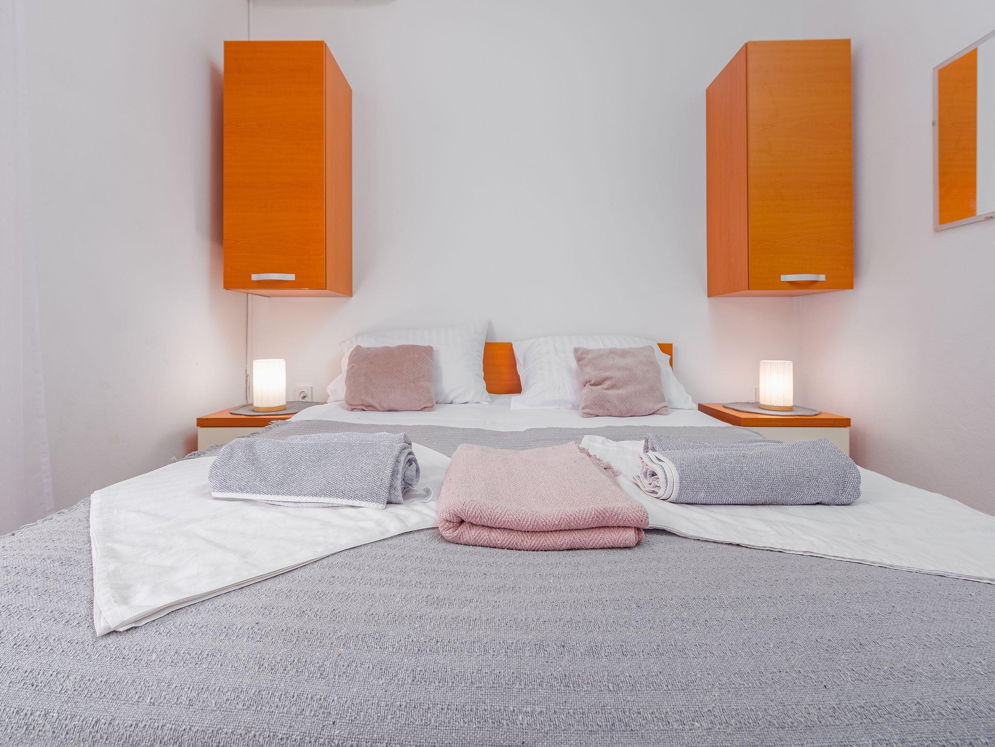 Ferienwohnung bietet Platz für 3 Gäste. Die Betten sind in Schlafzimmern, die es 2 gibt, innerhalb einer Gesamtfläche von 22m2, angeordnet. Die Gäste haben eine eigene Terrasse zur Verfügung, auf der sie in warmen Sommernächten genießen können. Das Apartment bietet Meerblick. Es ist erlaubt, Speisen auf dem Gemeinschafts-Grill vorzubereiten. IM PREIS INBEGRIFFEN: Kurtaxe, Endreinigung, Klimatisierung, Parkplatz, Bootsanlegeplatz, Föhn. VERBINDLICHE ZUSÄTZLICHE KOSTEN: Aufzahlung für Kurzaufenthalte (prozentualer Zuschlag pro Nächtigungsanzahl: 30% - 1, 20% - 2, 10% - 3). Die Verfügbarkeit zusätzlicher Dienstleistungen in Ihrem reservierten Termin und die Preise derselben (falls nicht aufgeführt) müssen im Voraus überprüft werden. Zusätzliche Dienstleistungen die in der Zahlungsaufforderung nicht aufgeführt sind werden direkt beim Vermieter bezahlt, angenommen der Gast nutzt auch diese.