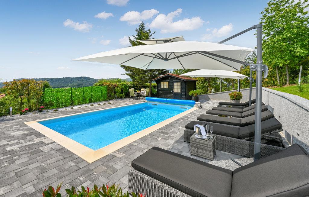 Huset har altan og flere terrasser med skøn udsigt, så I har altid har et dejligt sted at sidde ude og nyde ferien. Hovedattraktionen er naturligvis poolen, som ligger overfor huset I en flot have, som passes kærligt af ejeren. Her kan I kan tilbringe timevis med at plaske rundt i poolen og sole jer. Til børnenes underholdning er der desuden diverse udendørsspil, trækvogn og gynge. Indenfor kan I konkurrere i bordtennis. Afslut en skøn feriedag med en lækker grillmiddag efterfulgt at en dejlig stund i spbadet.