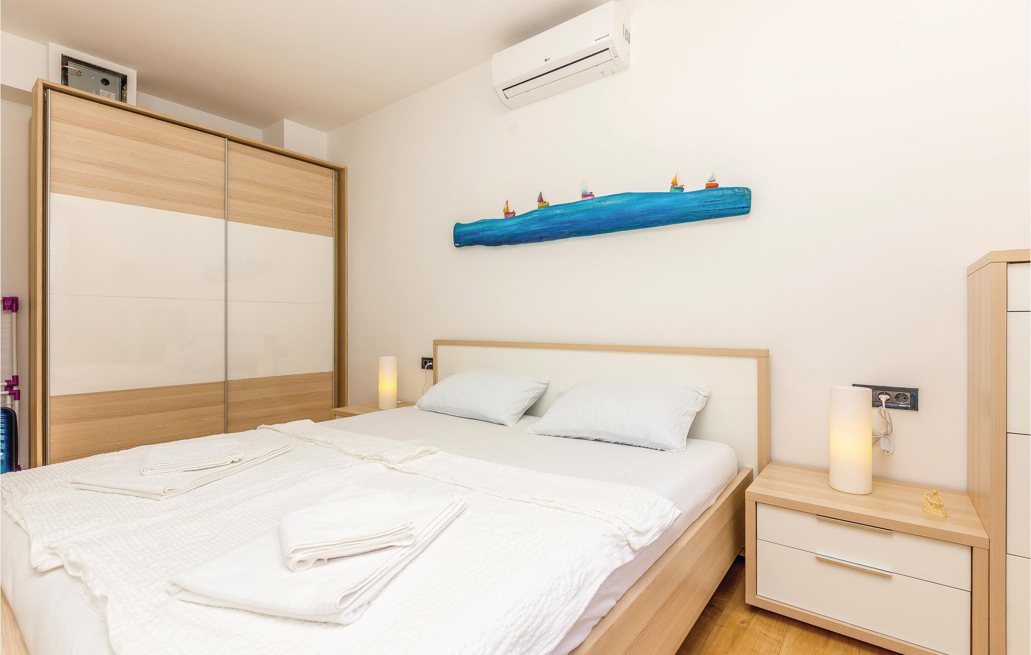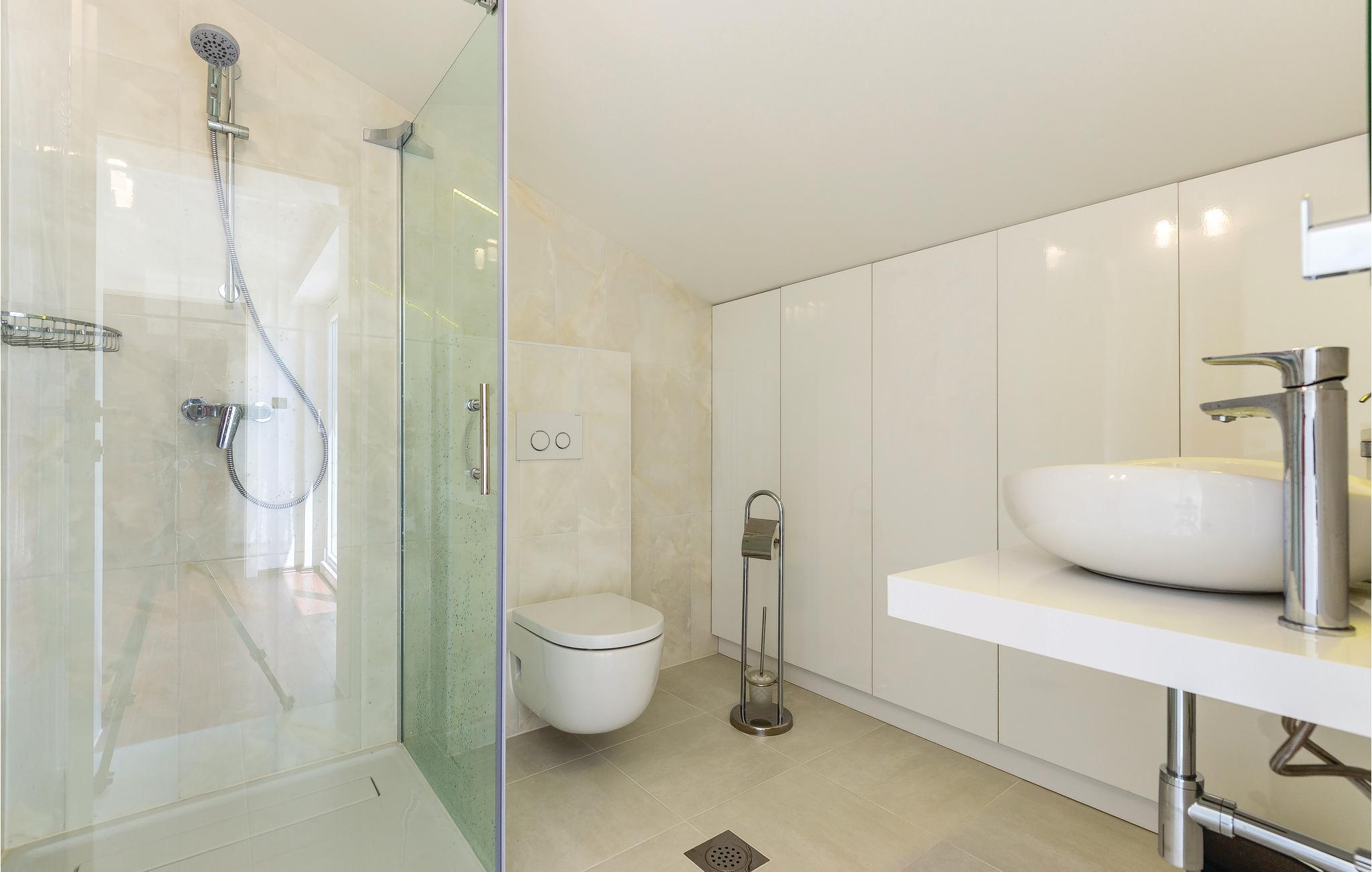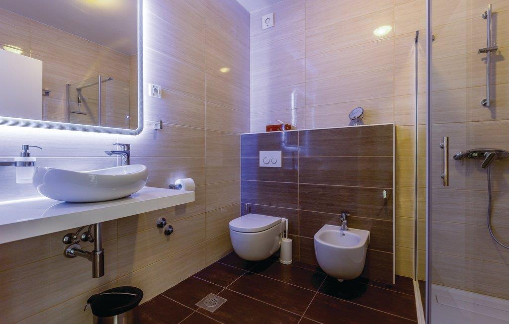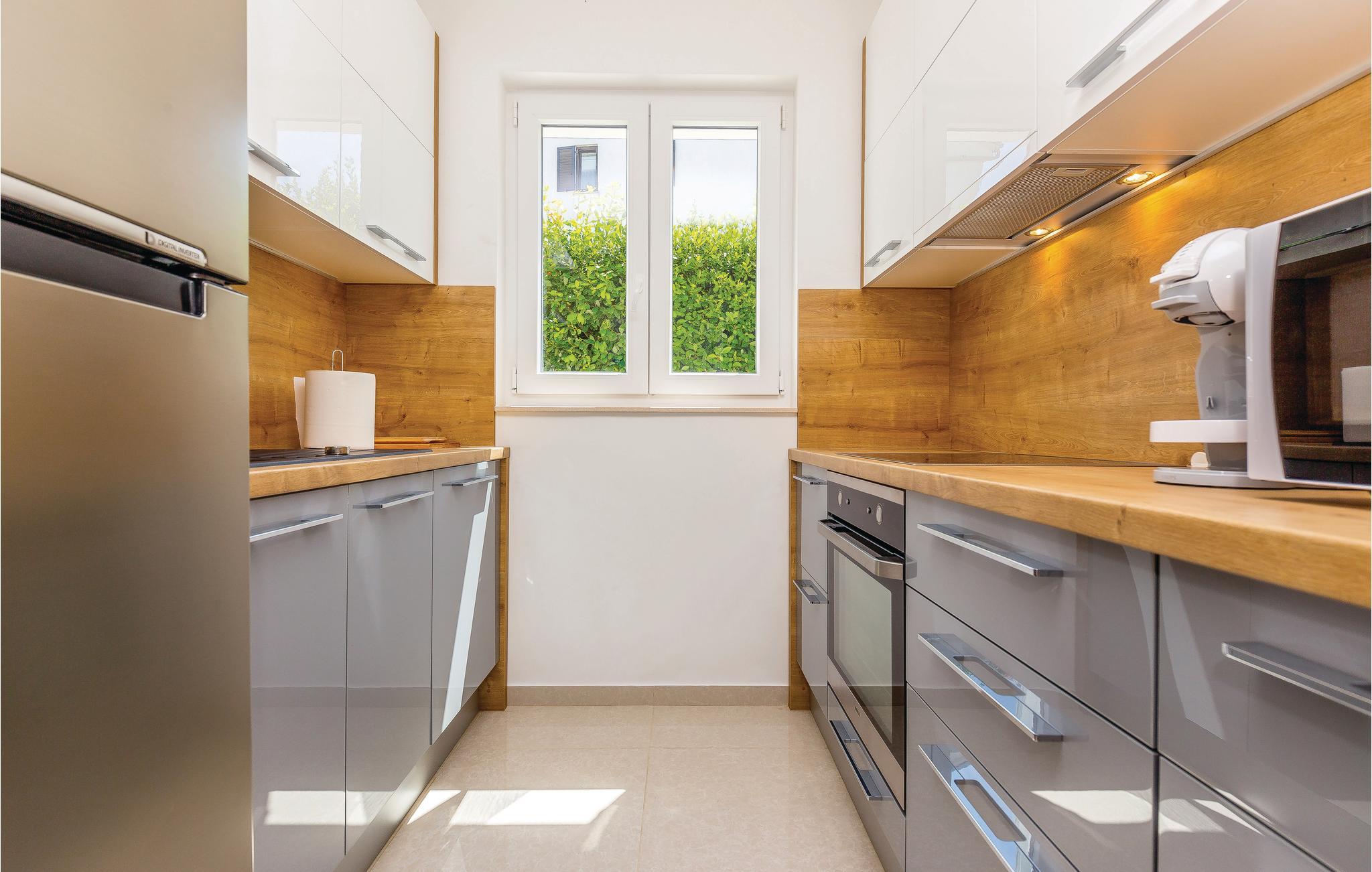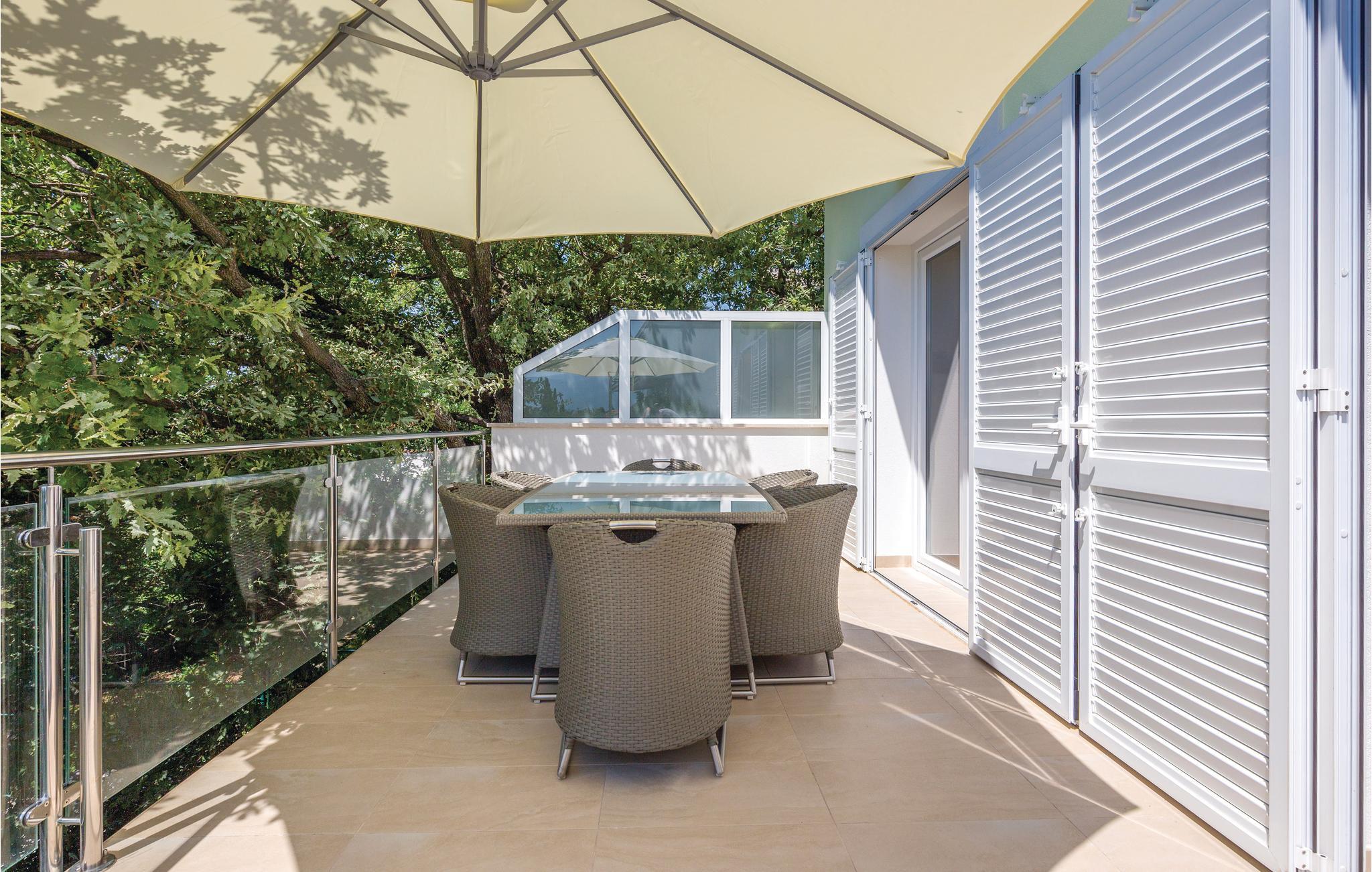 I rolig beliggenhed, i Novi Vinodolski, venter dette moderne og pænt indrettede feriehus. Der er tre etager ogindertrapper. I stueetagen venter en stor stue med glasvægge, hvorfra I har en skøn udsigt til haven og landskabet. På første sal er et moderne køkken og dagligområdet med udgang til den åbne terrasse. Terrassen lægger op til dejligt fælleskab, mens I læser avisen eller snakker med jeres nærmeste. Huset er oplagt til en uforglemmelig ferie. Møblerne og indretningen er omhyggeligt udvalgt. Nyd at grille med familien på solnedgangsterrassen. I Novi Vinodolski er der strande til alle aldersgrupper, der kan nås på få minutters gang. Den mindste loftshøjde under taget er 80 cm.