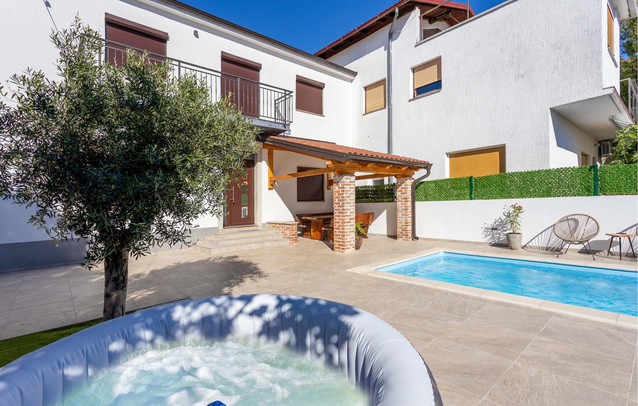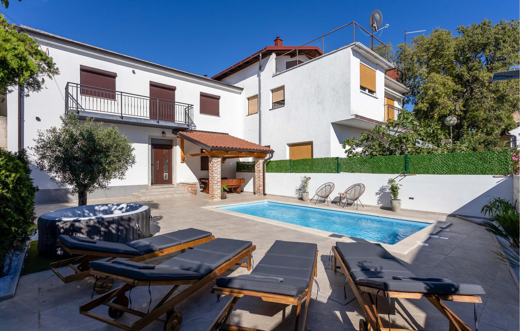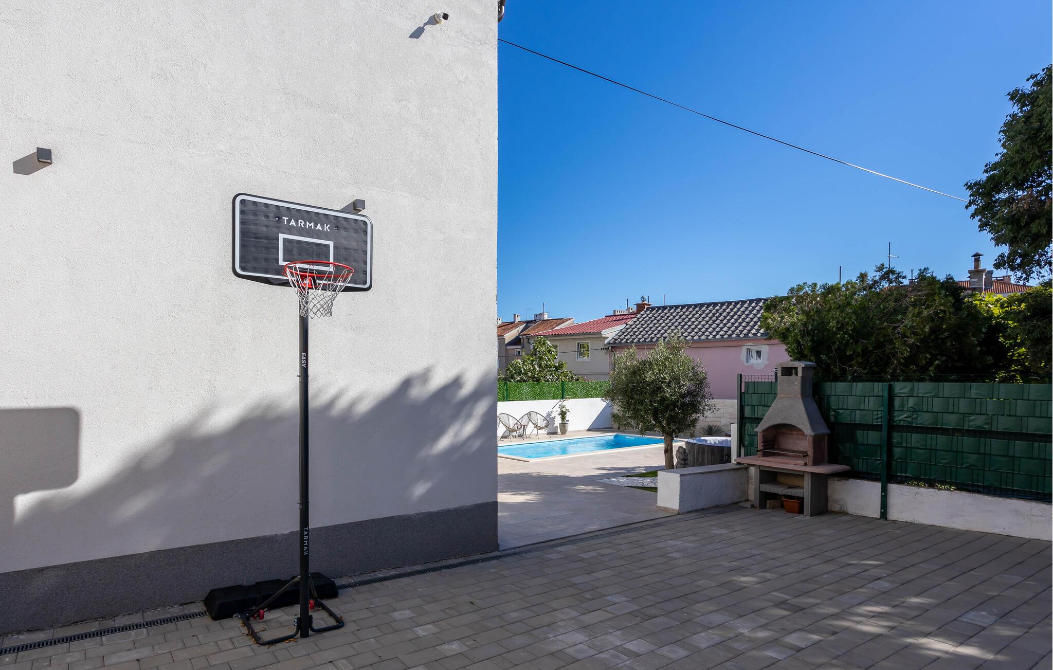 Velkommen til jeres charmerende hus i Novi Vinodolski. Nyd det vidunderlige udendørsområde, der er udstyret med en forfriskende pool og komfortable liggestole. Tag en dukkert, og lad solen varme jeres hud. Brug den hyggelige overdækkede terrasse til fælles måltider. Grillpladsen indbyder til at tilberede lækre retter udenfor og tilbringe aftenen i godt selskab. Nyd den klare stjernehimmel og den fredelige atmosfære. Slap også af i spabadet, og lad hverdagens stress forsvinde. Basketballbanen byder på ekstra underholdning for hele familien.