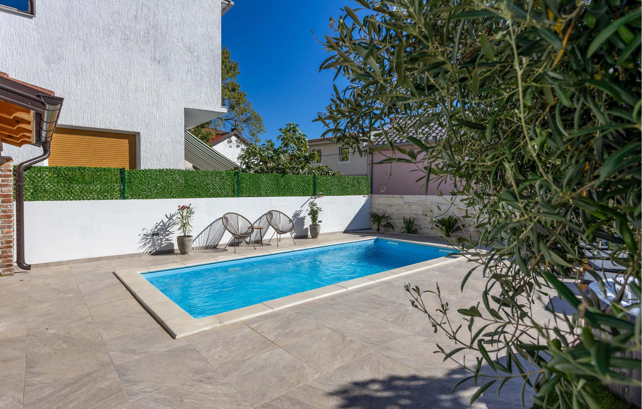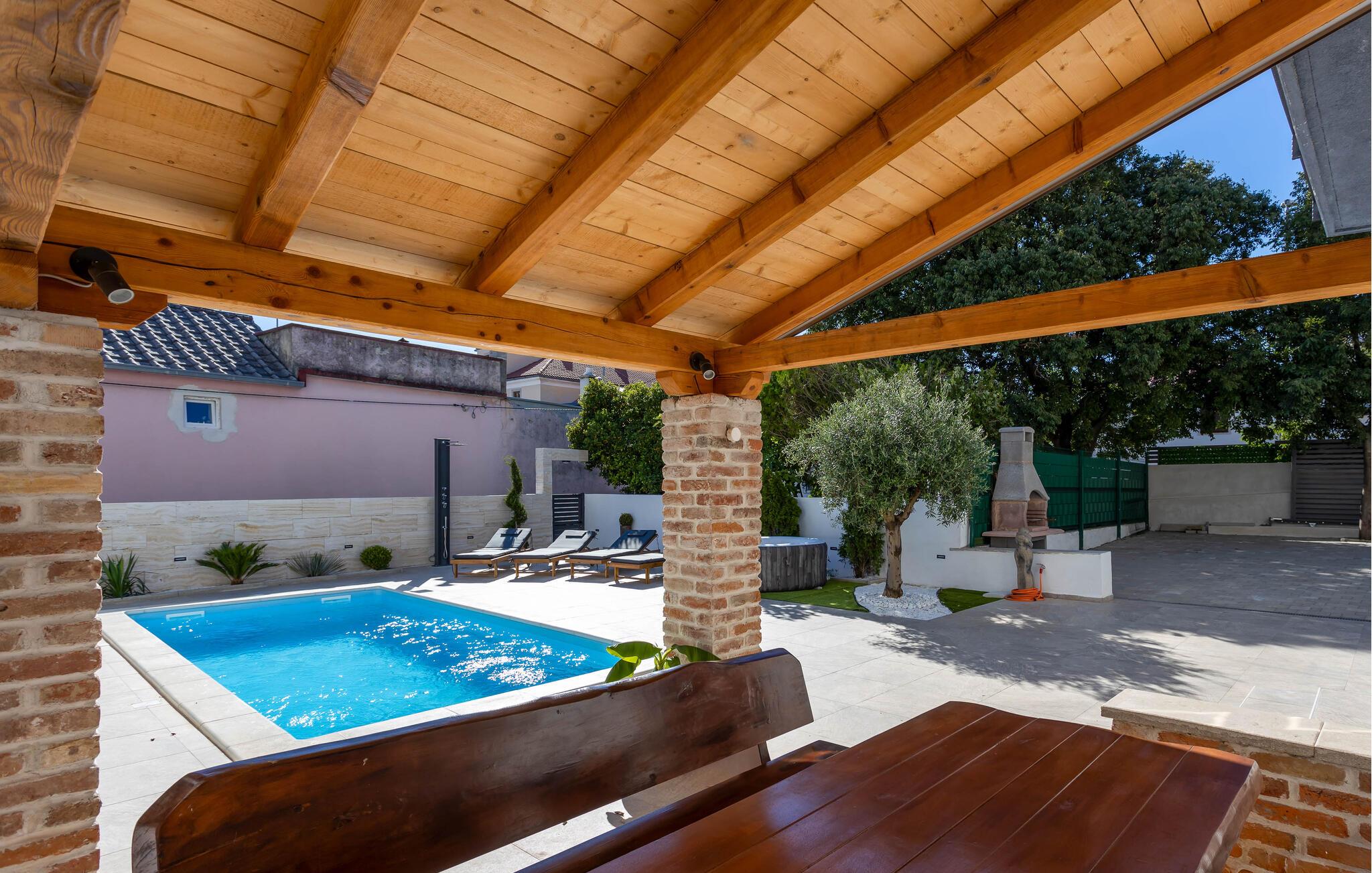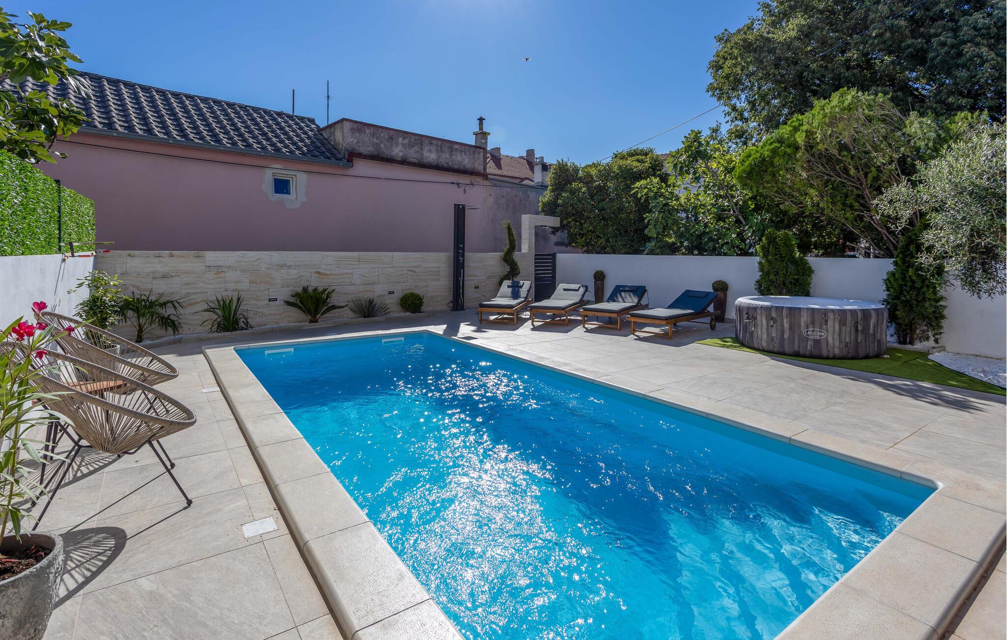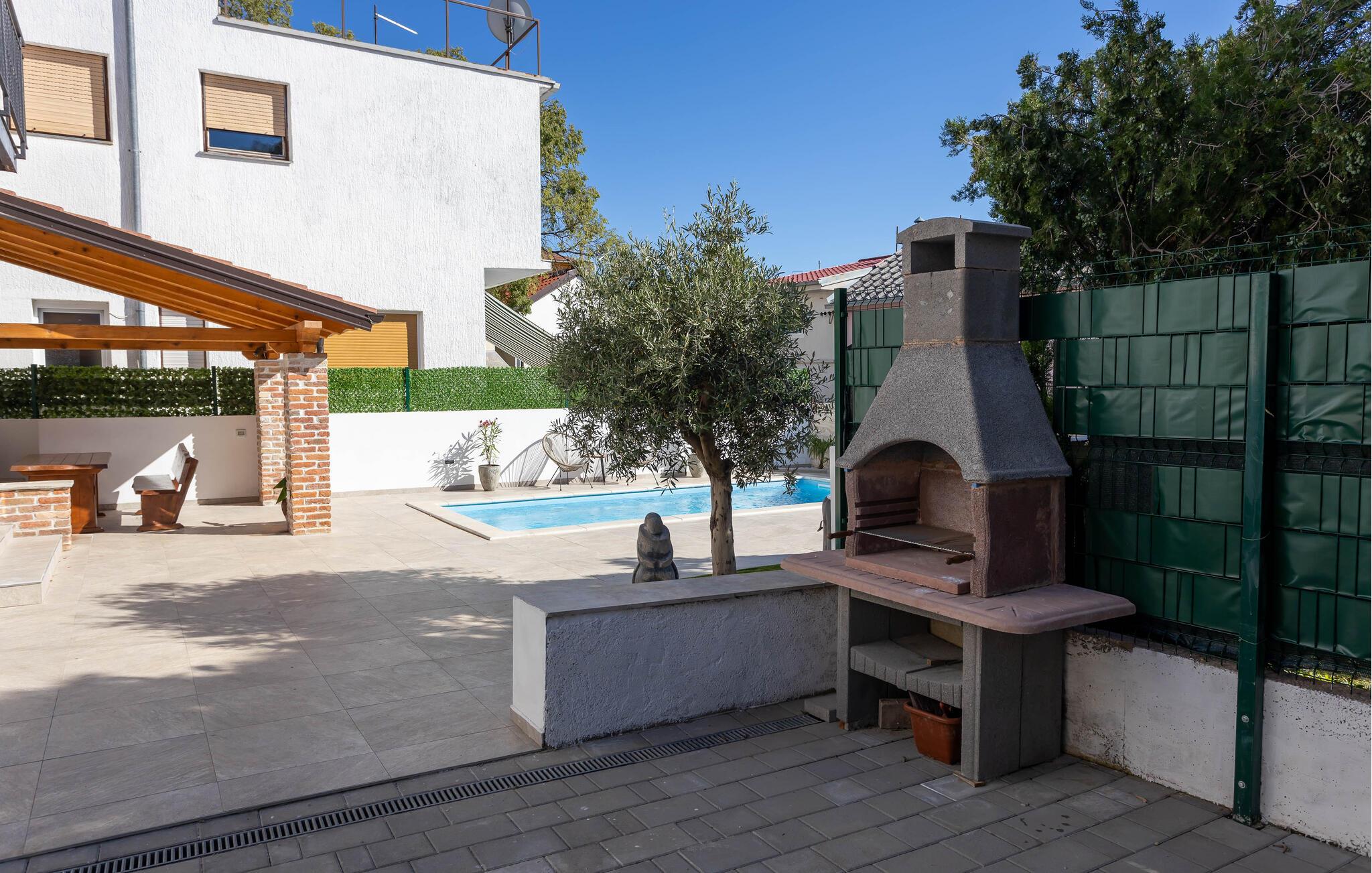 Velkommen til jeres charmerende hus i Novi Vinodolski. Nyd det vidunderlige udendørsområde, der er udstyret med en forfriskende pool og komfortable liggestole. Tag en dukkert, og lad solen varme jeres hud. Brug den hyggelige overdækkede terrasse til fælles måltider. Grillpladsen indbyder til at tilberede lækre retter udenfor og tilbringe aftenen i godt selskab. Nyd den klare stjernehimmel og den fredelige atmosfære. Slap også af i spabadet, og lad hverdagens stress forsvinde. Basketballbanen byder på ekstra underholdning for hele familien.